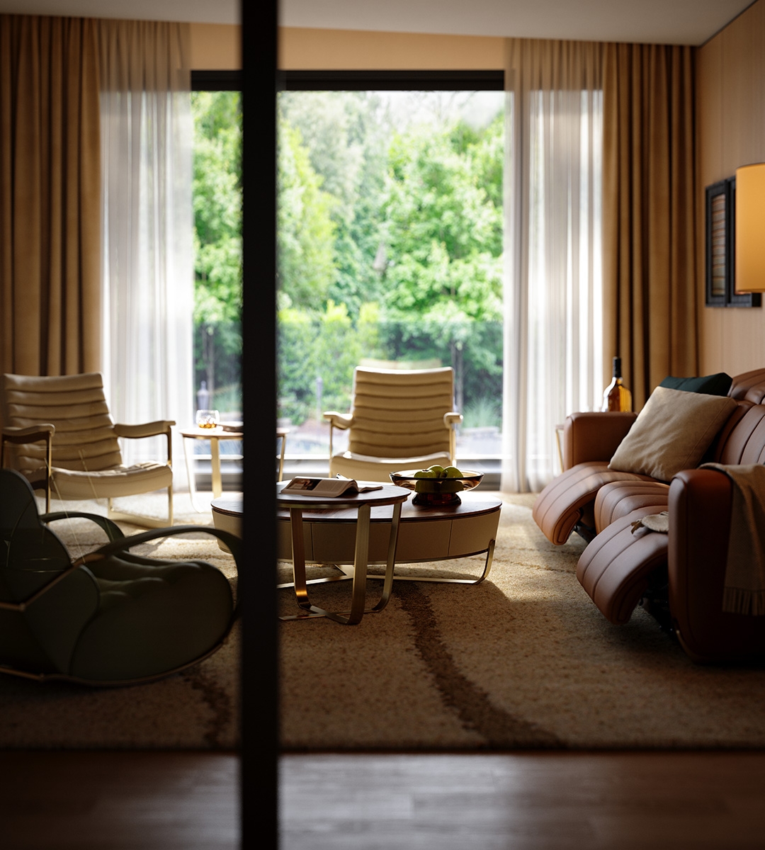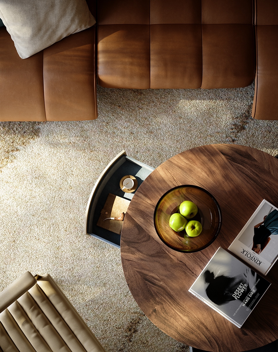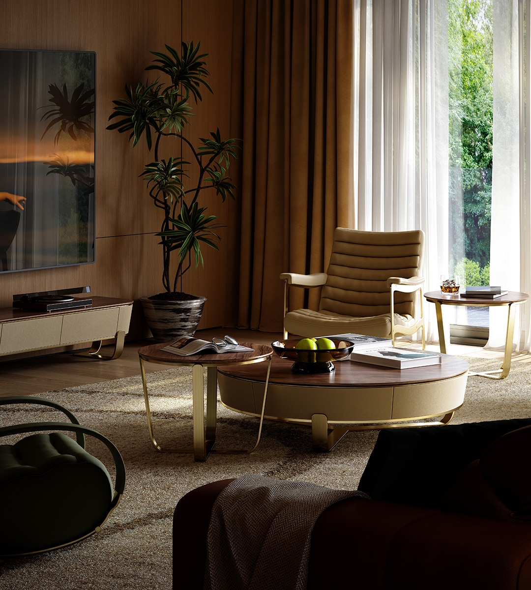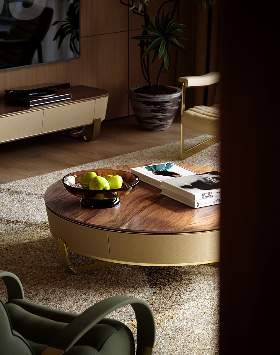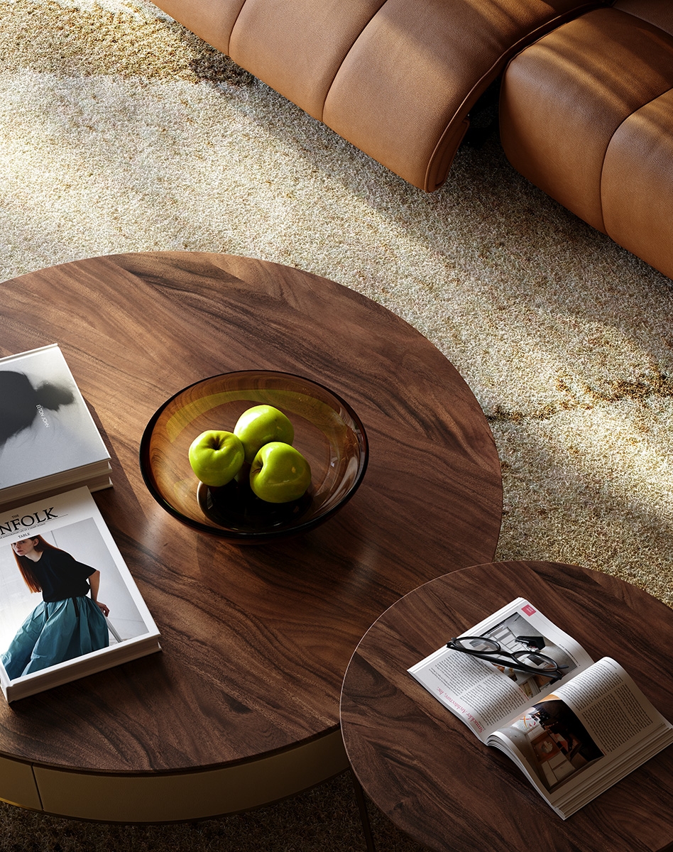 The top of the large coffee table is made of solid walnut wood, with natural texture like traces of time. It is hand-polished and painted with wood wax oil, making it warm and shiny. The cabinet body is covered with soft leather, and the light beige color is delicate and skin-friendly. It is soft to the touch and wear-resistant after an ecological tanning process. The frame of the small round table is matched with bronze metal.