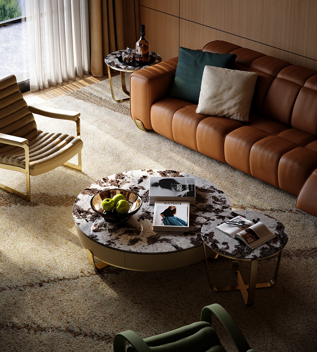 The round coffee table, with its unique artistic form and elegant landing, features simple and clean lines, and a color scheme that exudes a sense of luxury and fashion, combining stability and lightness.