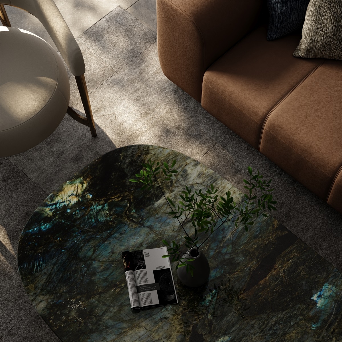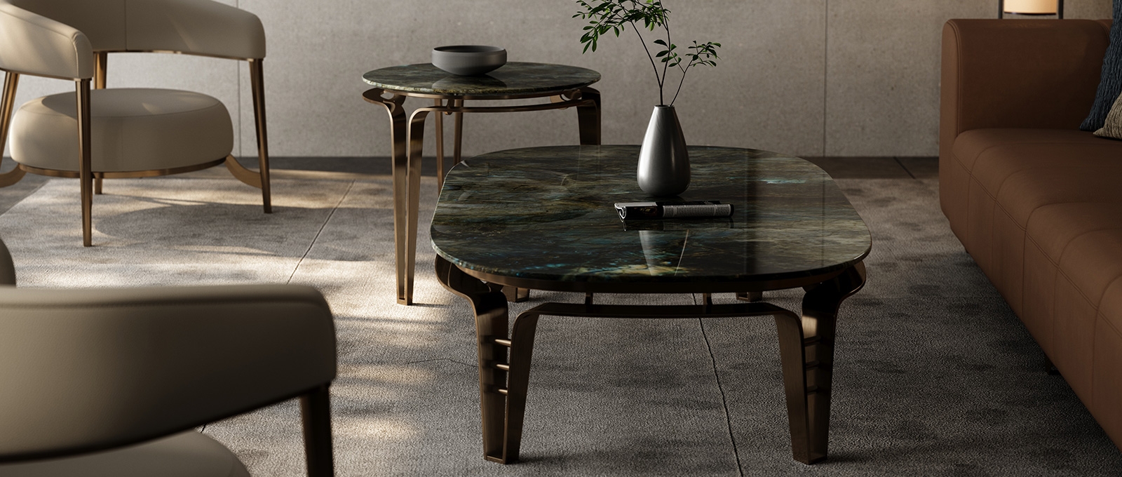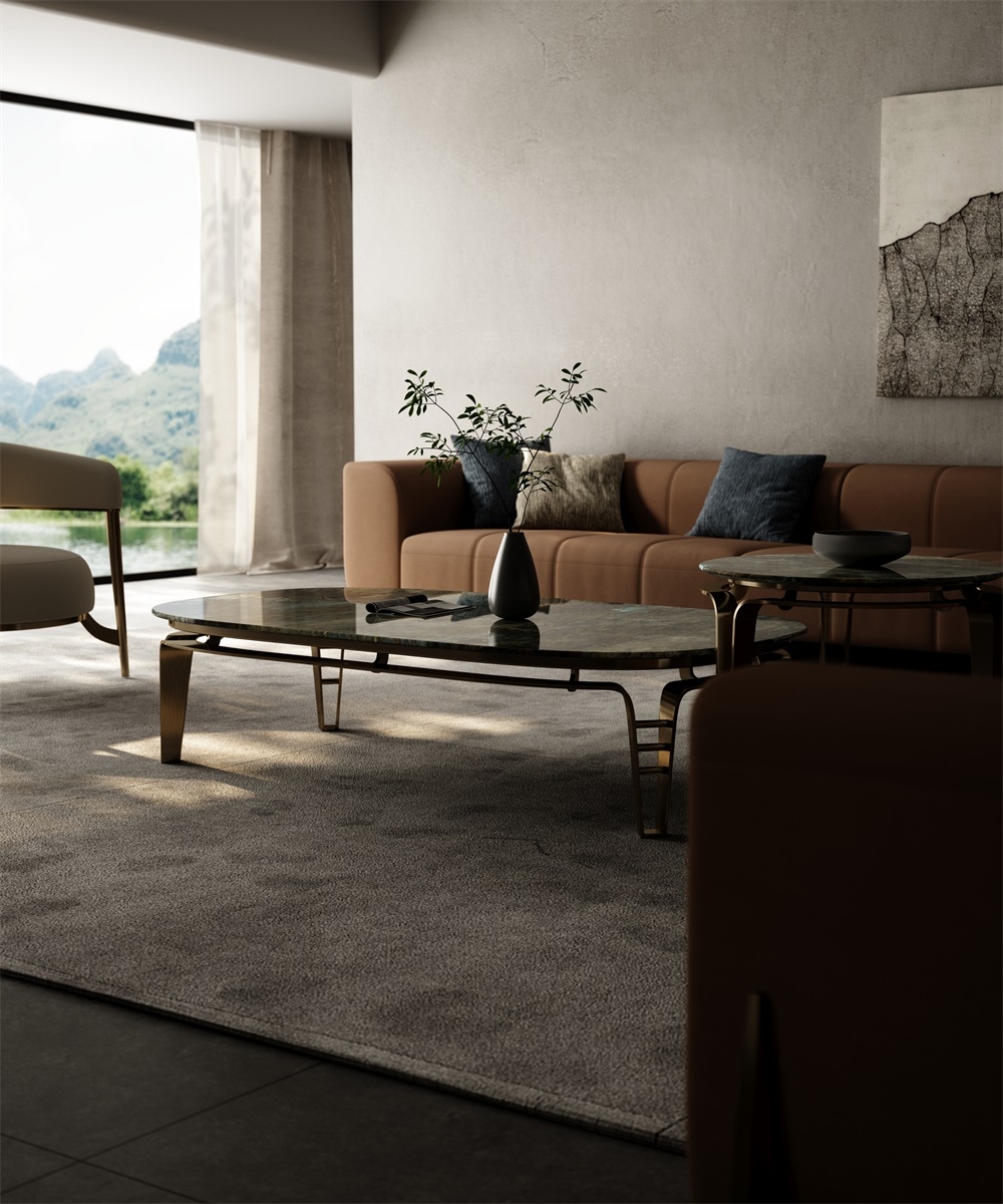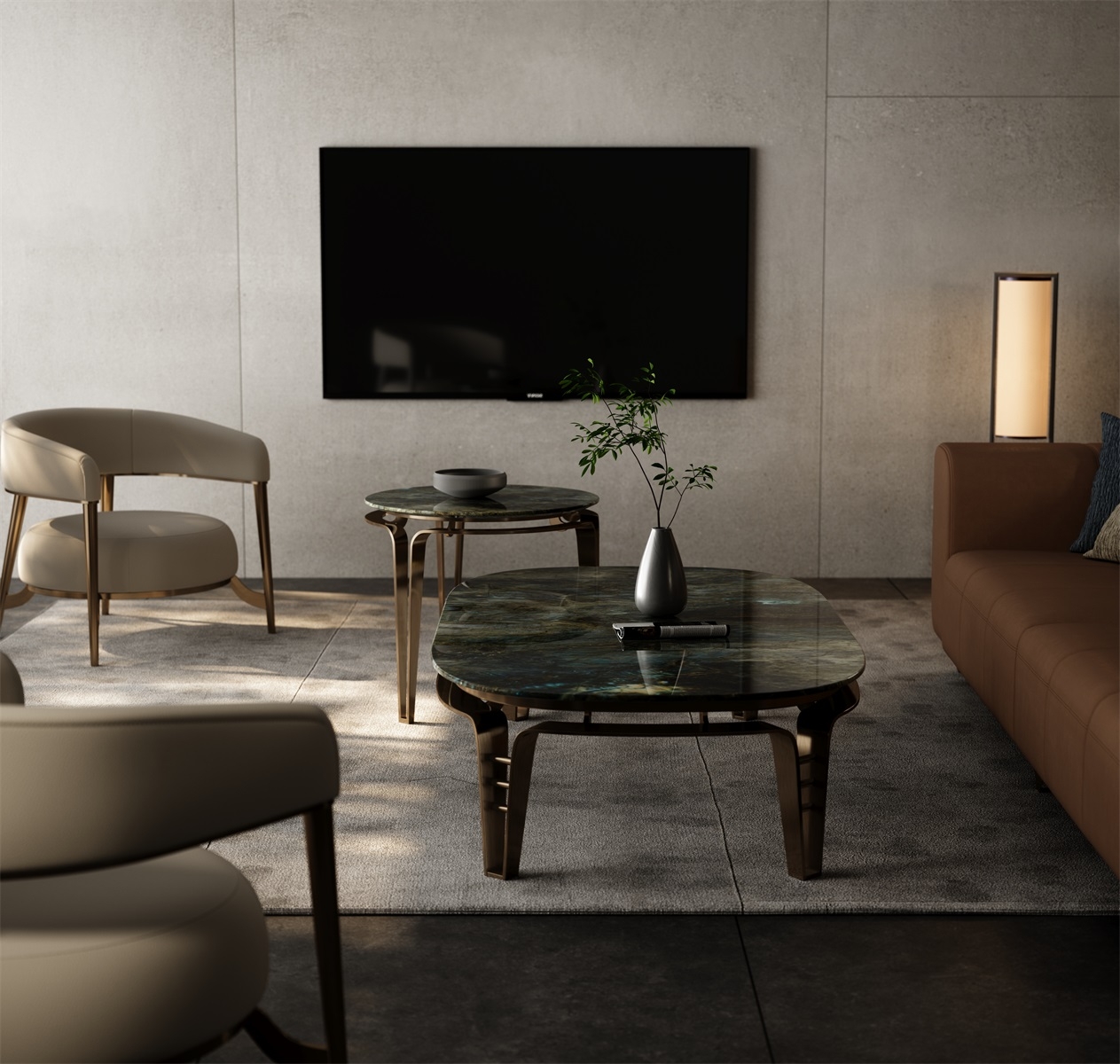 The elliptical outline is suitable for various living room layouts. The spacious countertop can display artistic ornaments, tea sets, etc., serving as a carrier for spatial interaction and display. The natural properties of stone combined with the exquisite craftsmanship of metal make it not only a practical piece of furniture but also an artistic item that enhances the style of the space. It meets the dual pursuit of quality and beauty in high-end home furnishings and showcases the owner's unique taste for a refined life.