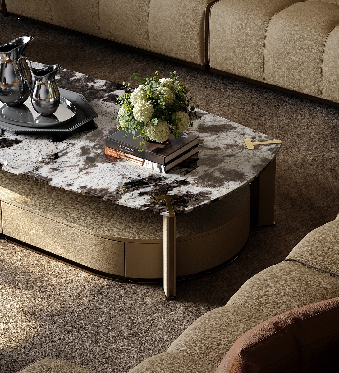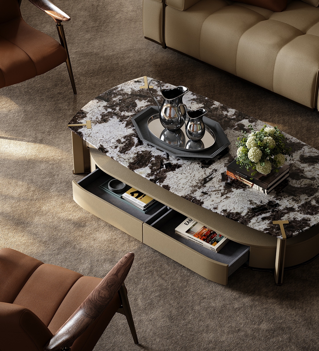 The iconic letter "T" is integrated into the four corners of the coffee table as a luxurious and elegant decoration, making it look both distinctive and eye-catching. Under the fashionable appearance, it also has storage function.