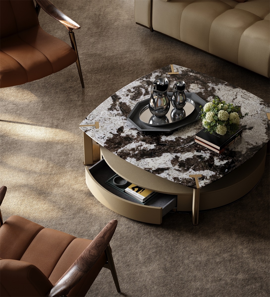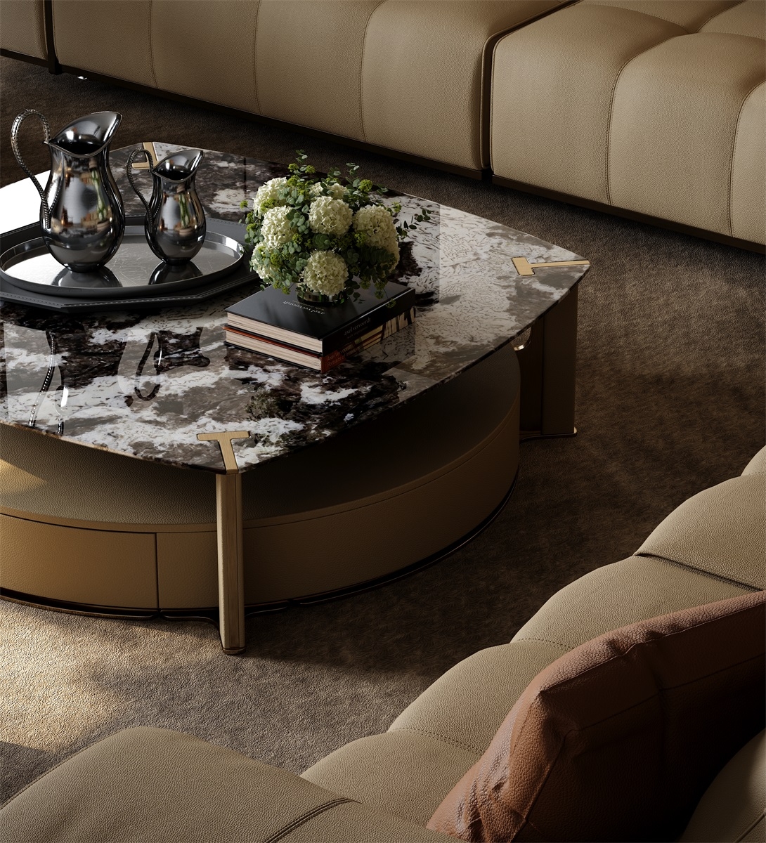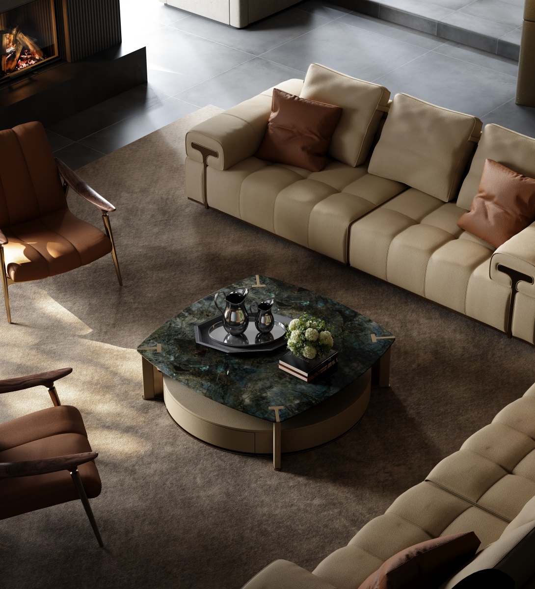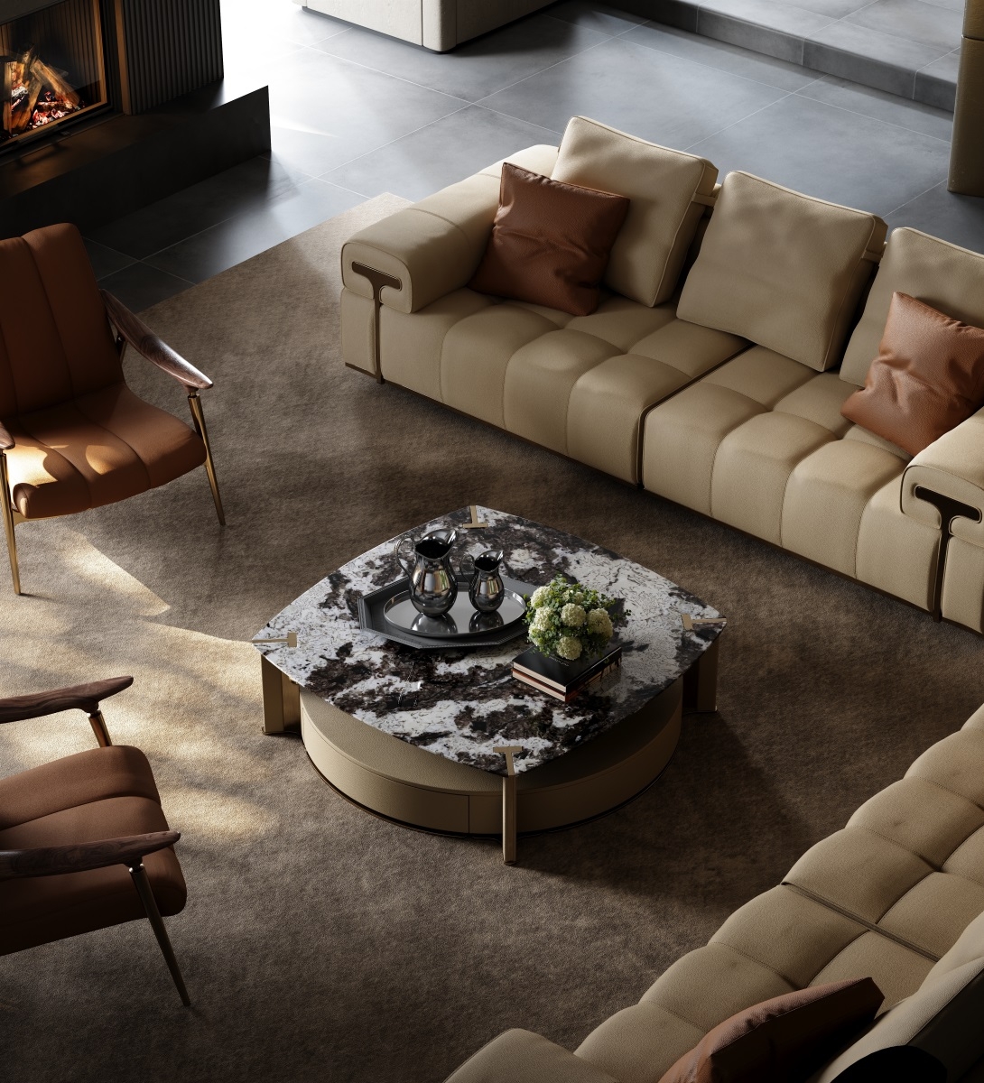 The iconic letter "T" is highlighted at the four corners of the coffee table, using the aesthetic of curved lines to evoke the unique rhythm of the coffee table. The combination of different shapes of contours gives the coffee table a unique sense of hierarchy.