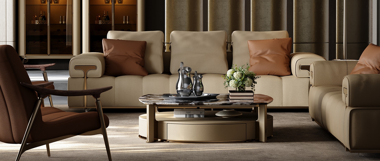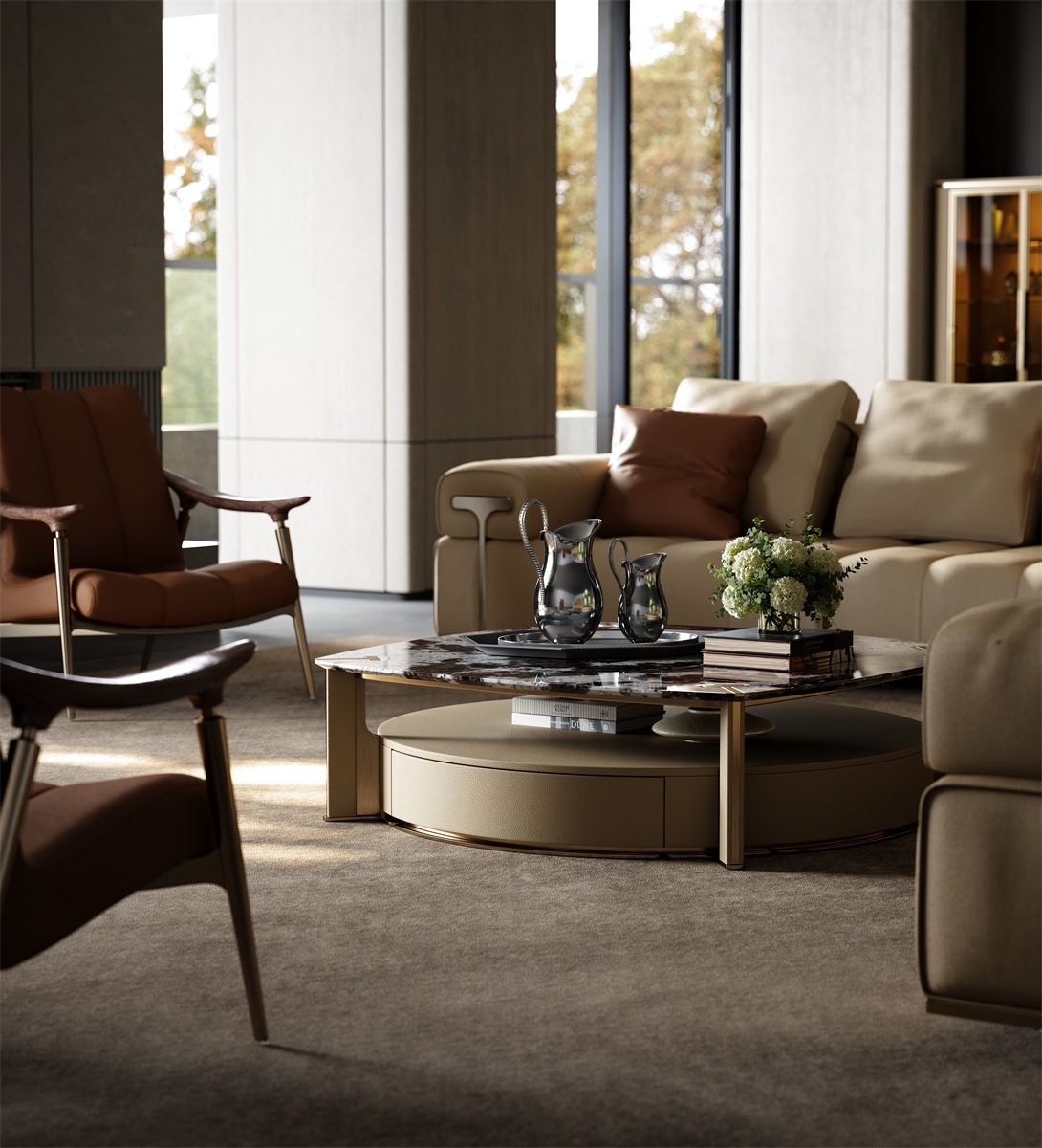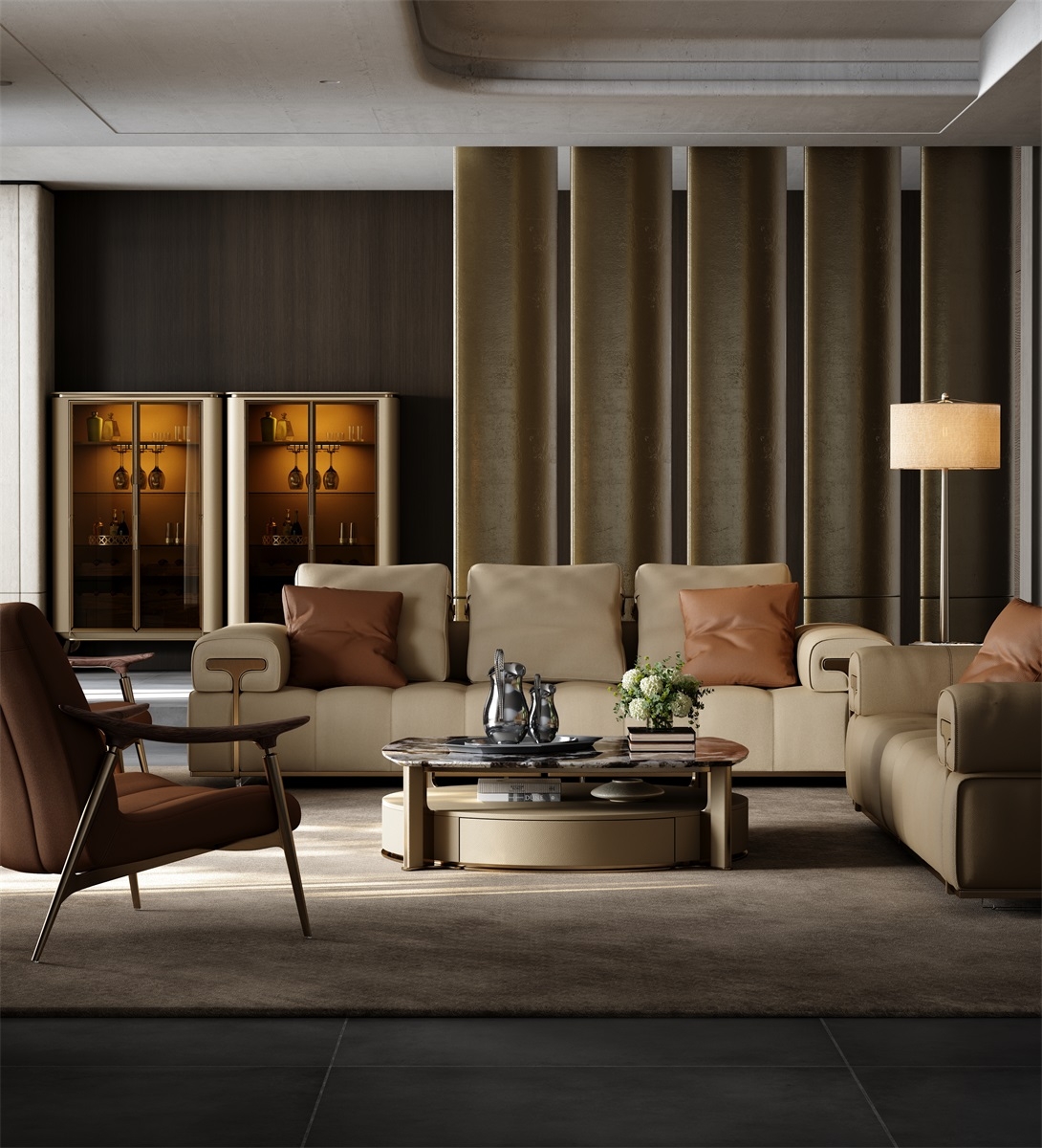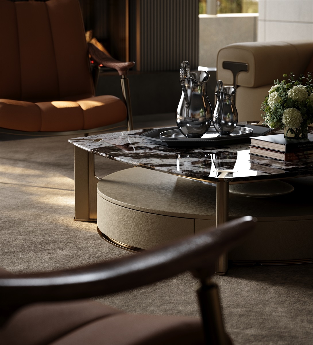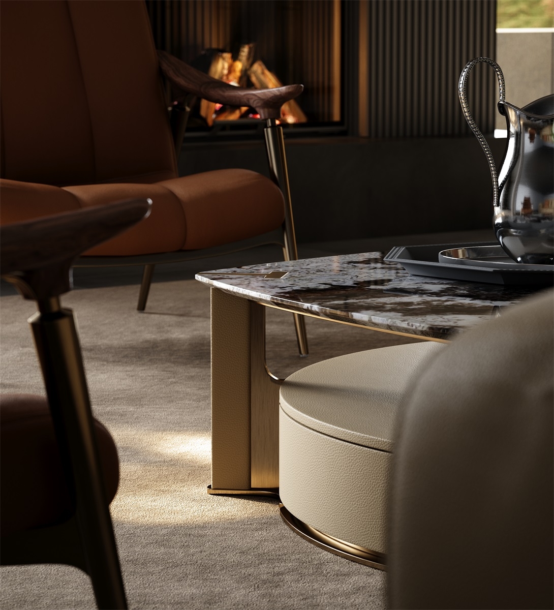 The countertop is made of natural rock slabs with dark textures like art paintings. After high-temperature calcination and anti-seepage treatment, it is wear-resistant, stain-resistant and has its own artistic tension. The lower cabinet is covered with genuine leather. The light brown tone is delicate and skin-friendly. After the ecological tanning process, it feels soft and is wear-resistant and stain-resistant.