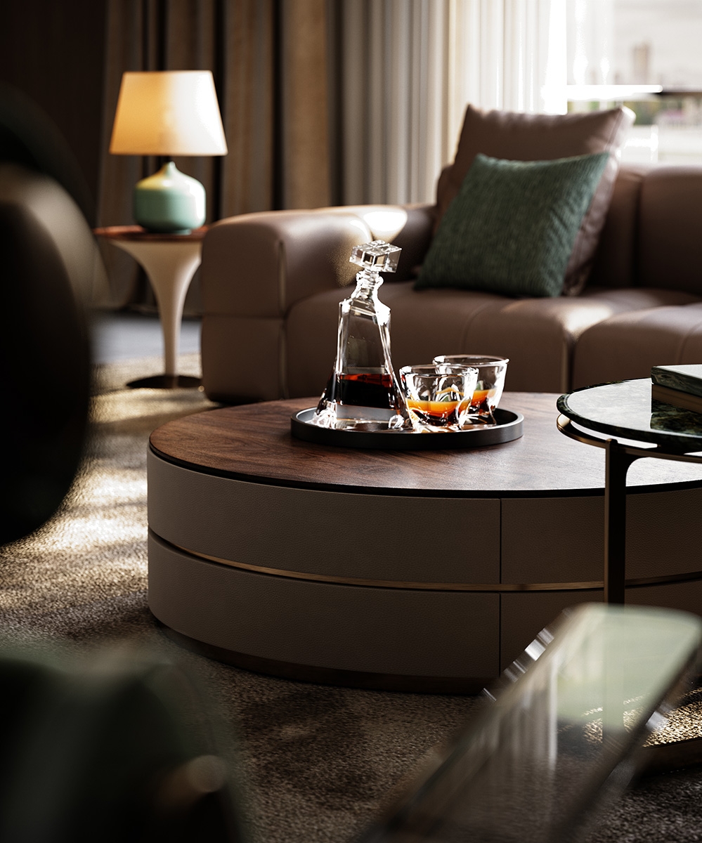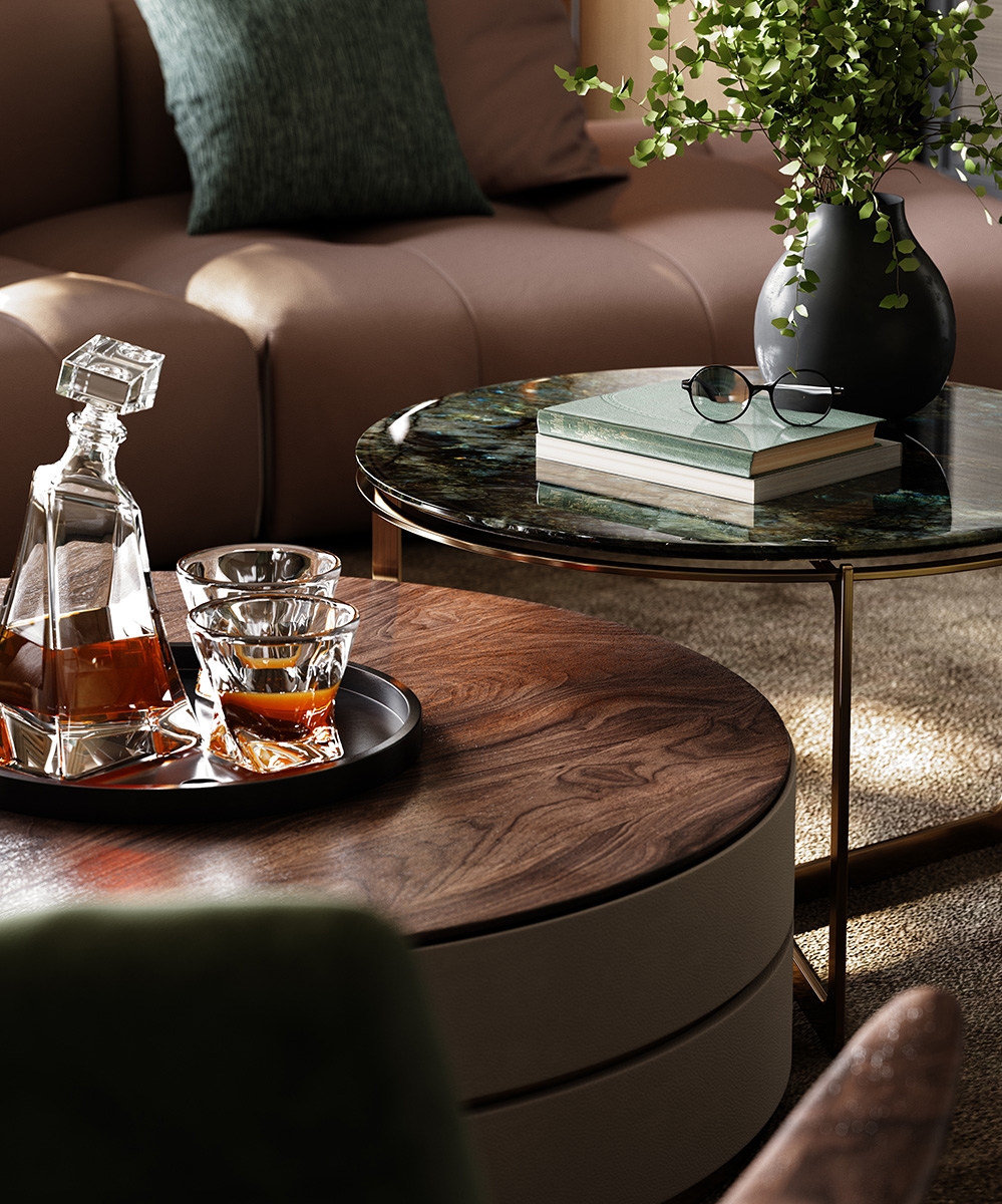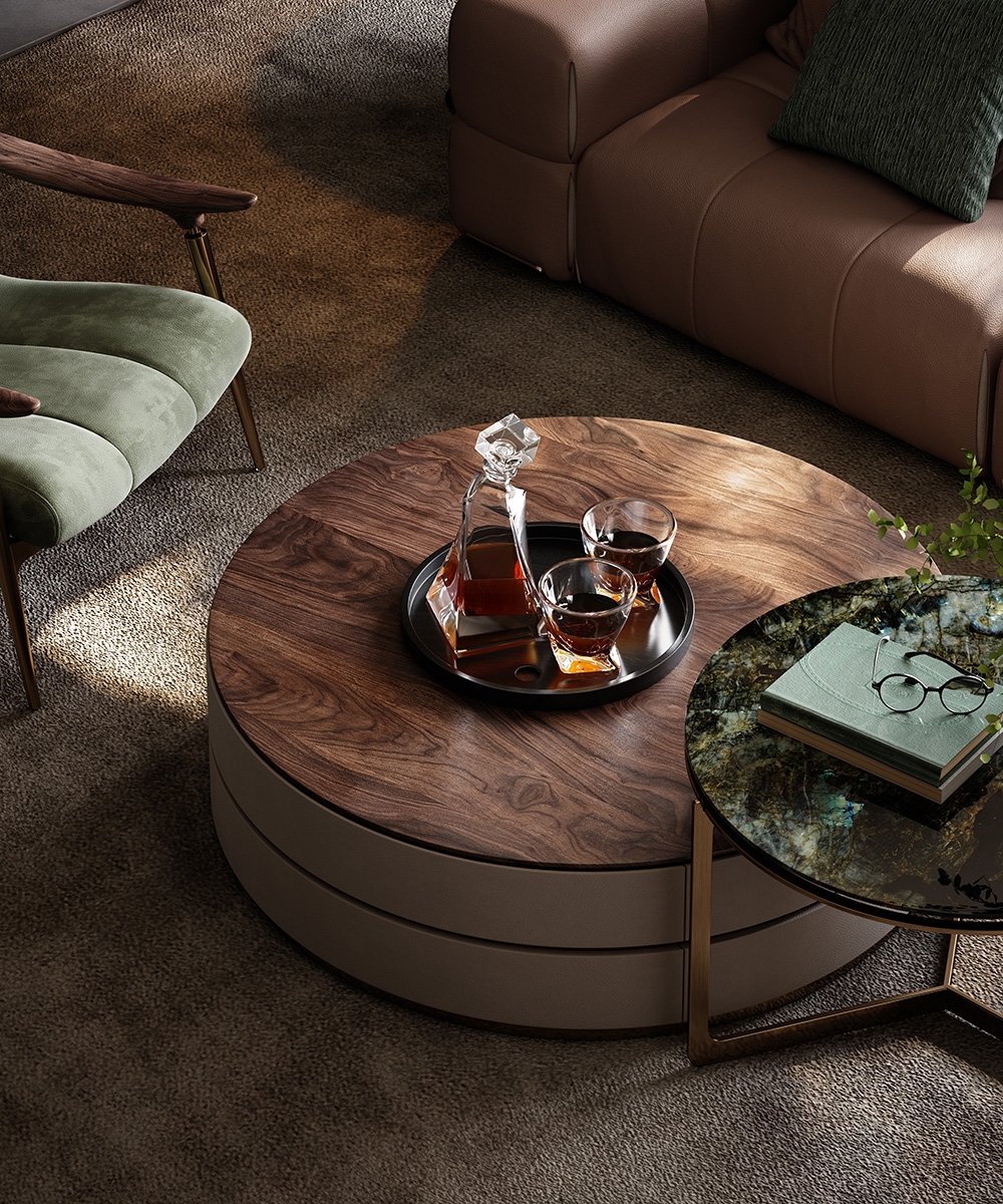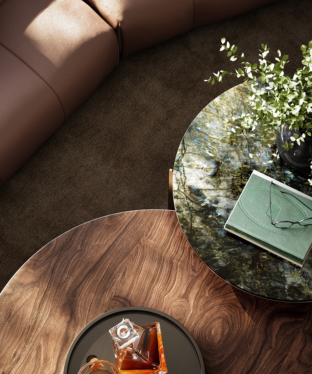 The coffee table is designed with a circular shape as its design concept, combined with different bases to create a harmonious and unified aesthetic. When paired with different sofas, it can also highlight the style of the living room.