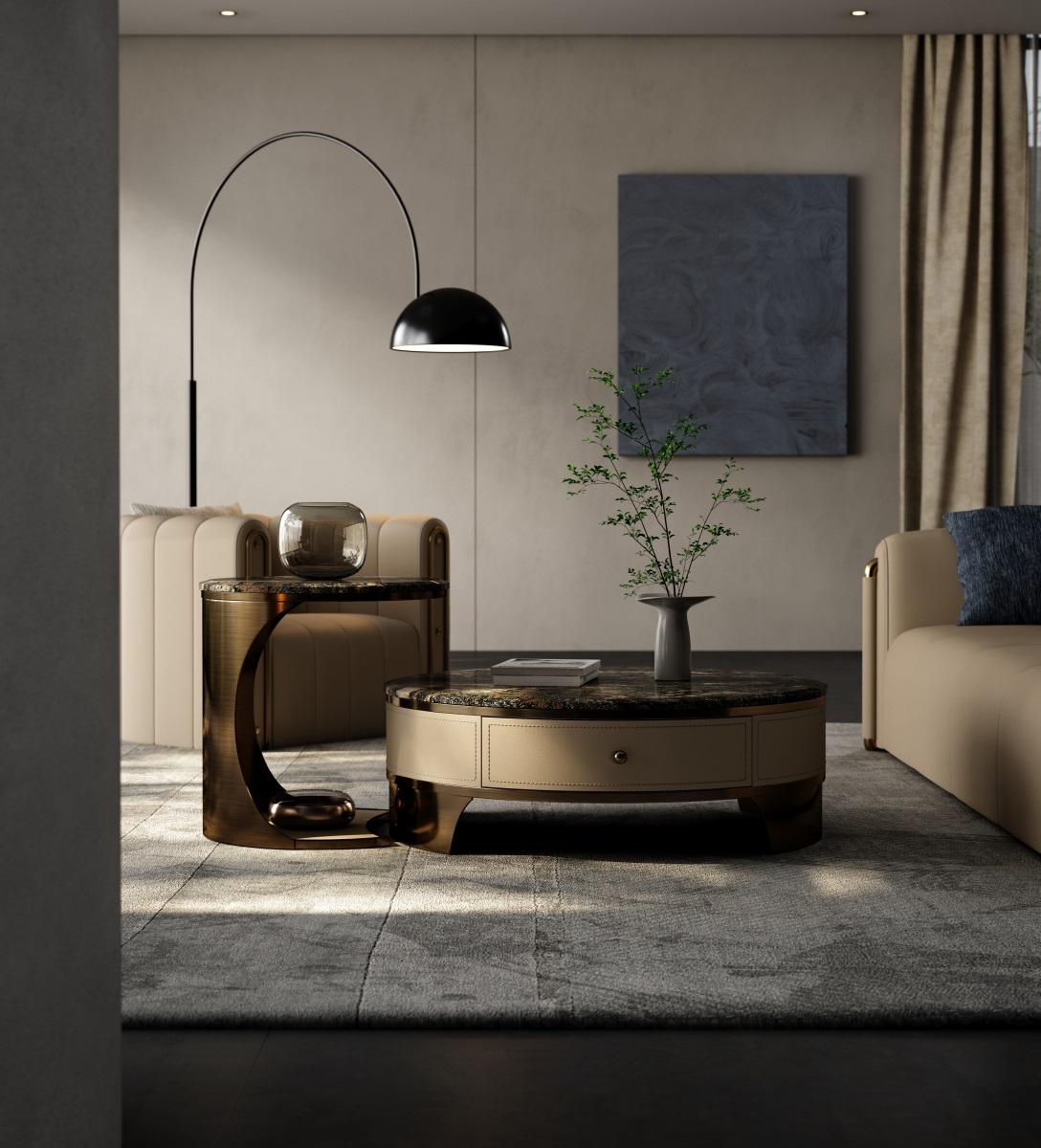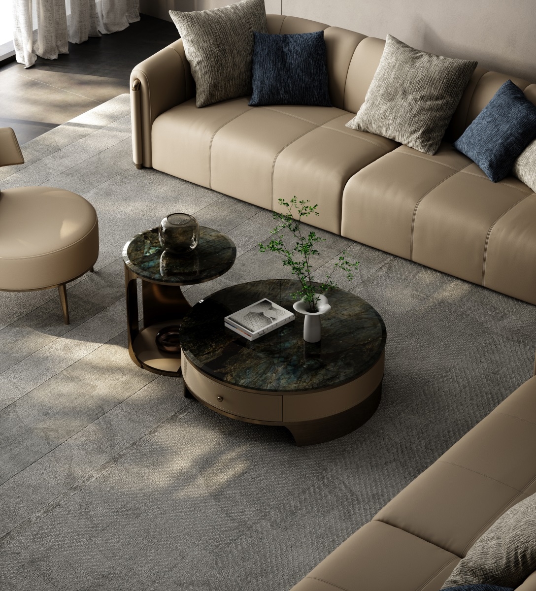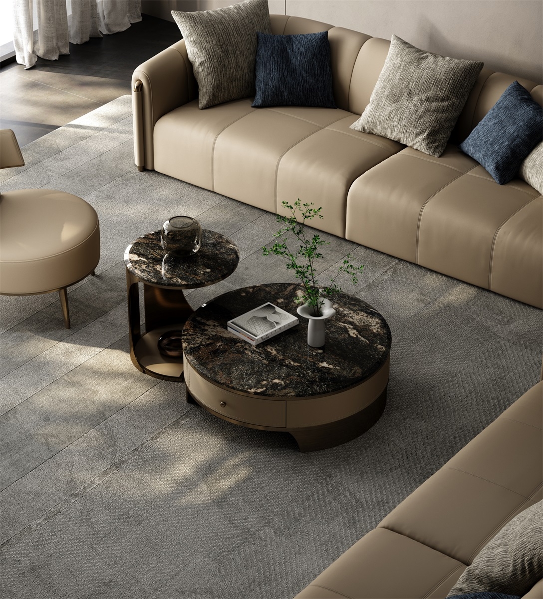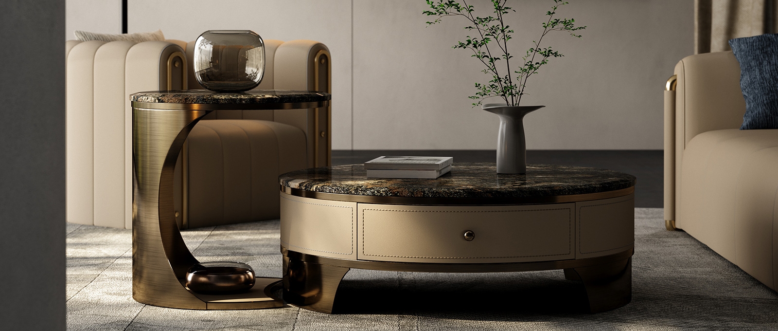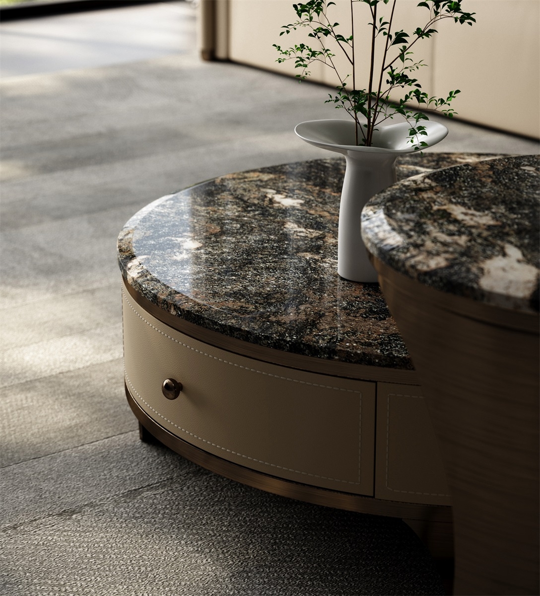 The countertop is made of natural iridescent rock slabs with dark textures like art paintings. After high-temperature calcination and anti-seepage treatment, it is wear-resistant and stain-resistant and has its own artistic tension. The cabinet body is covered with genuine leather. The light brown tone is delicate and skin-friendly. After the ecological tanning process, it is soft to the touch and wear-resistant. The metal frame is electroplated with bronze to present a warm luster.