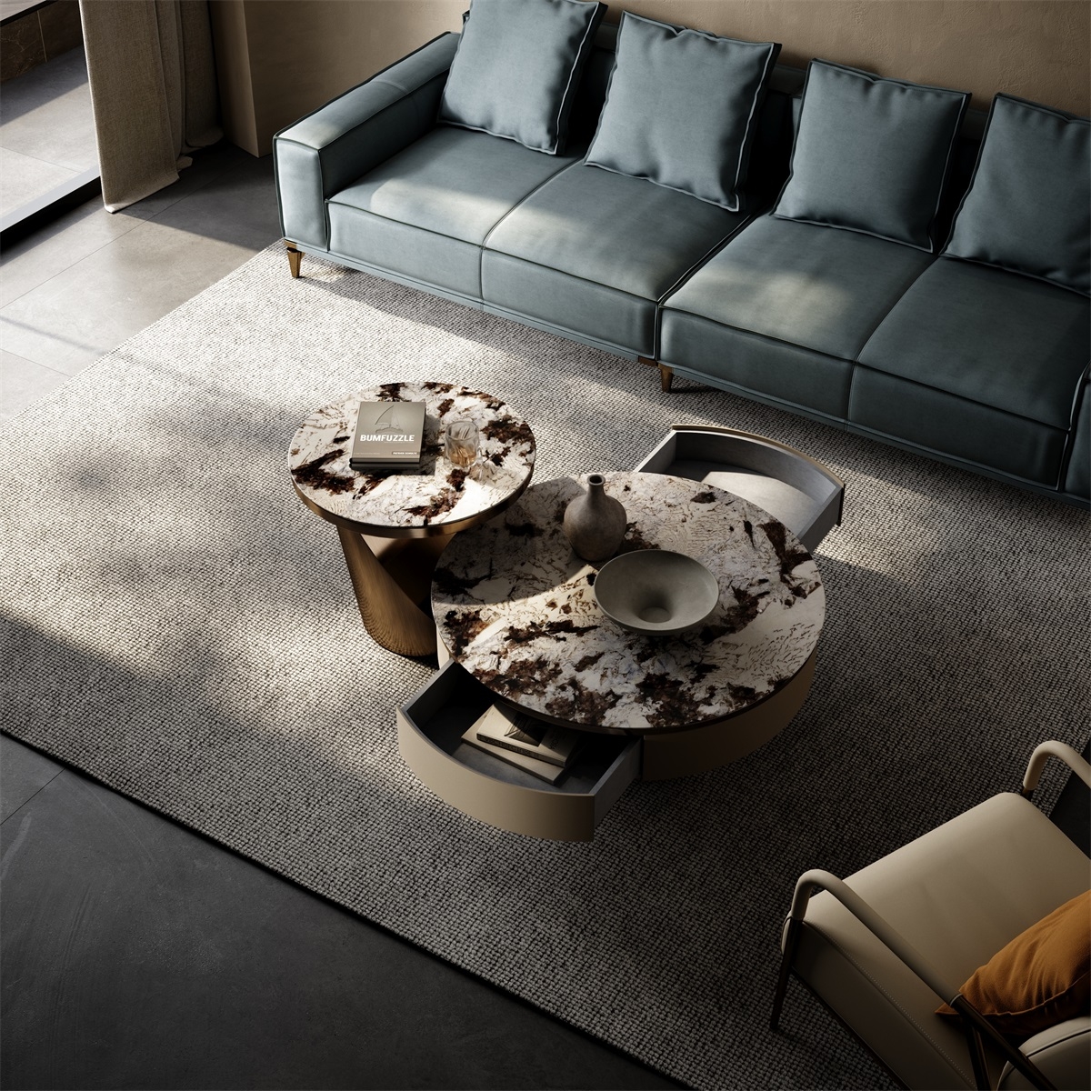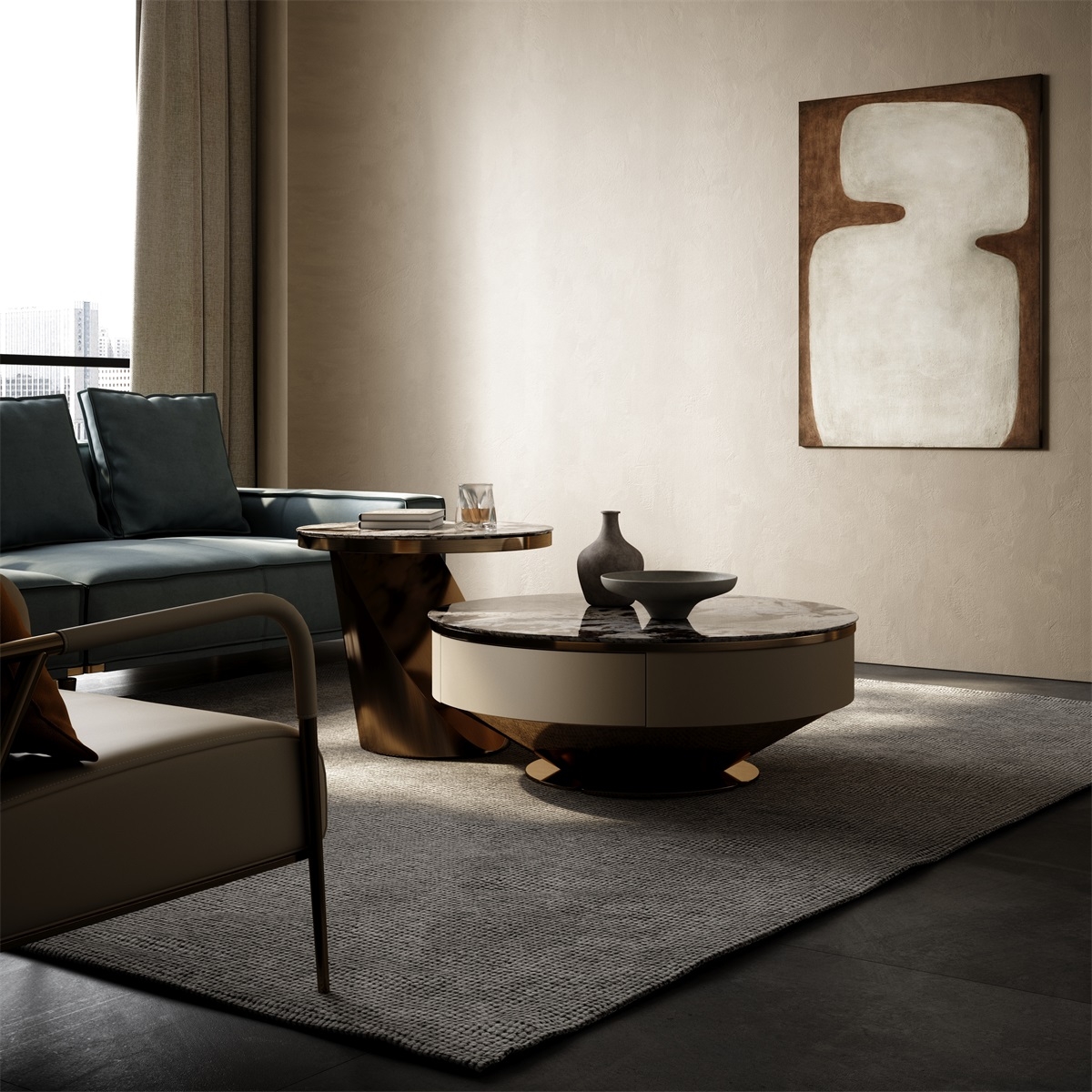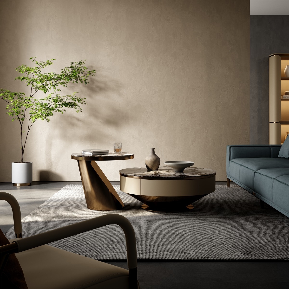 The countertop is made of natural iridescent rock slabs with a texture like an art painting. After high-temperature calcination and anti-seepage treatment, it is wear-resistant and stain-resistant and has its own artistic tension. The cabinet body is covered with genuine leather. The light brown tone is delicate and skin-friendly. After the ecological tanning process, it is soft to the touch and wear-resistant. The metal frame is electroplated with bronze to present a warm luster. The fusion of the three creates a luxurious and elegant texture base for the living room, injecting a high-end atmosphere into the social space.