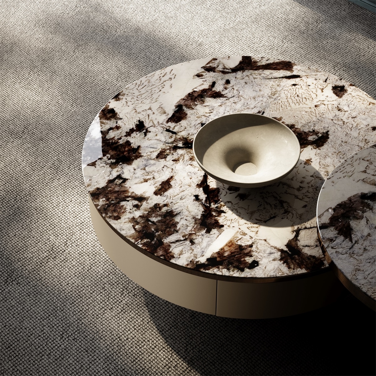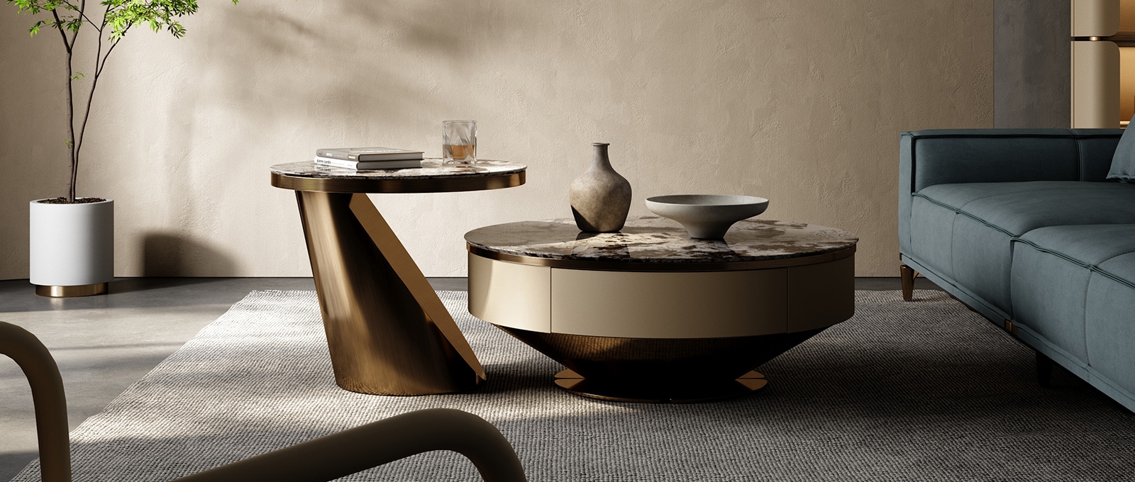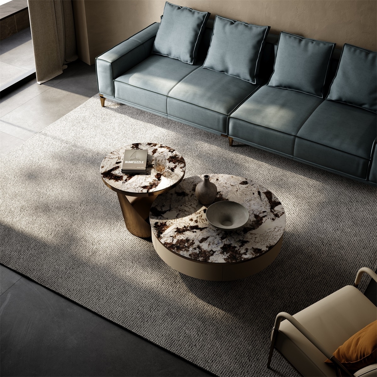 The countertop is made of natural iridescent rock slabs with a texture like an art painting. After high-temperature calcination and anti-seepage treatment, it is wear-resistant and stain-resistant and has its own artistic tension. The cabinet body is covered with genuine leather. The light brown tone is delicate and skin-friendly. After the ecological tanning process, it is soft to the touch and wear-resistant. The metal frame is electroplated with bronze to present a warm luster. The fusion of the three creates a luxurious and elegant texture base for the living room, injecting a high-end atmosphere into the social space.