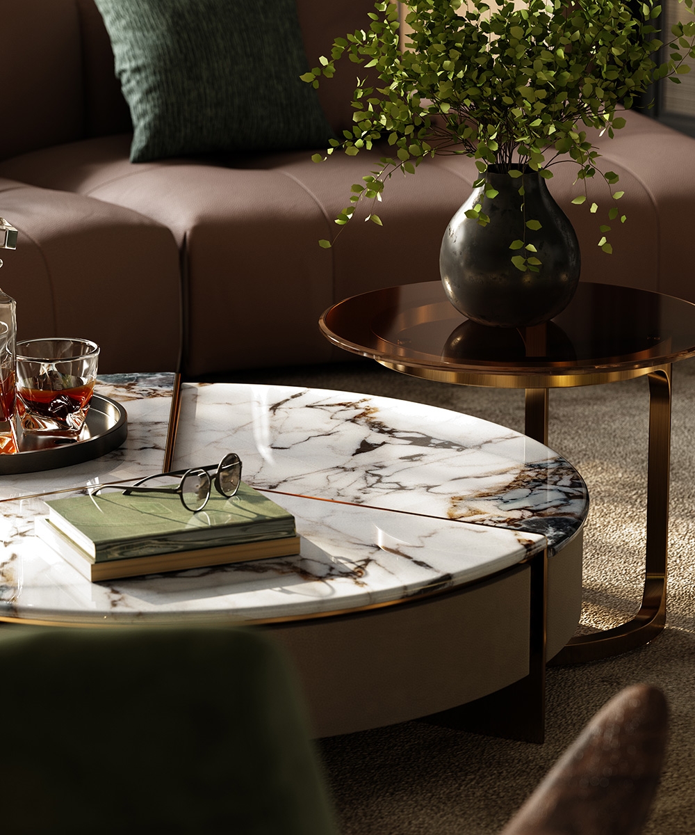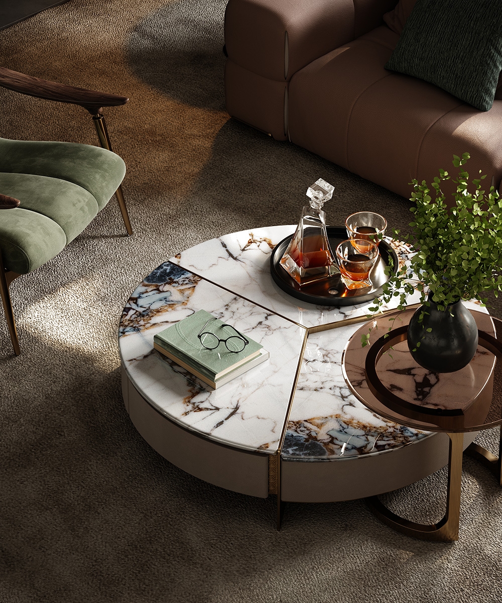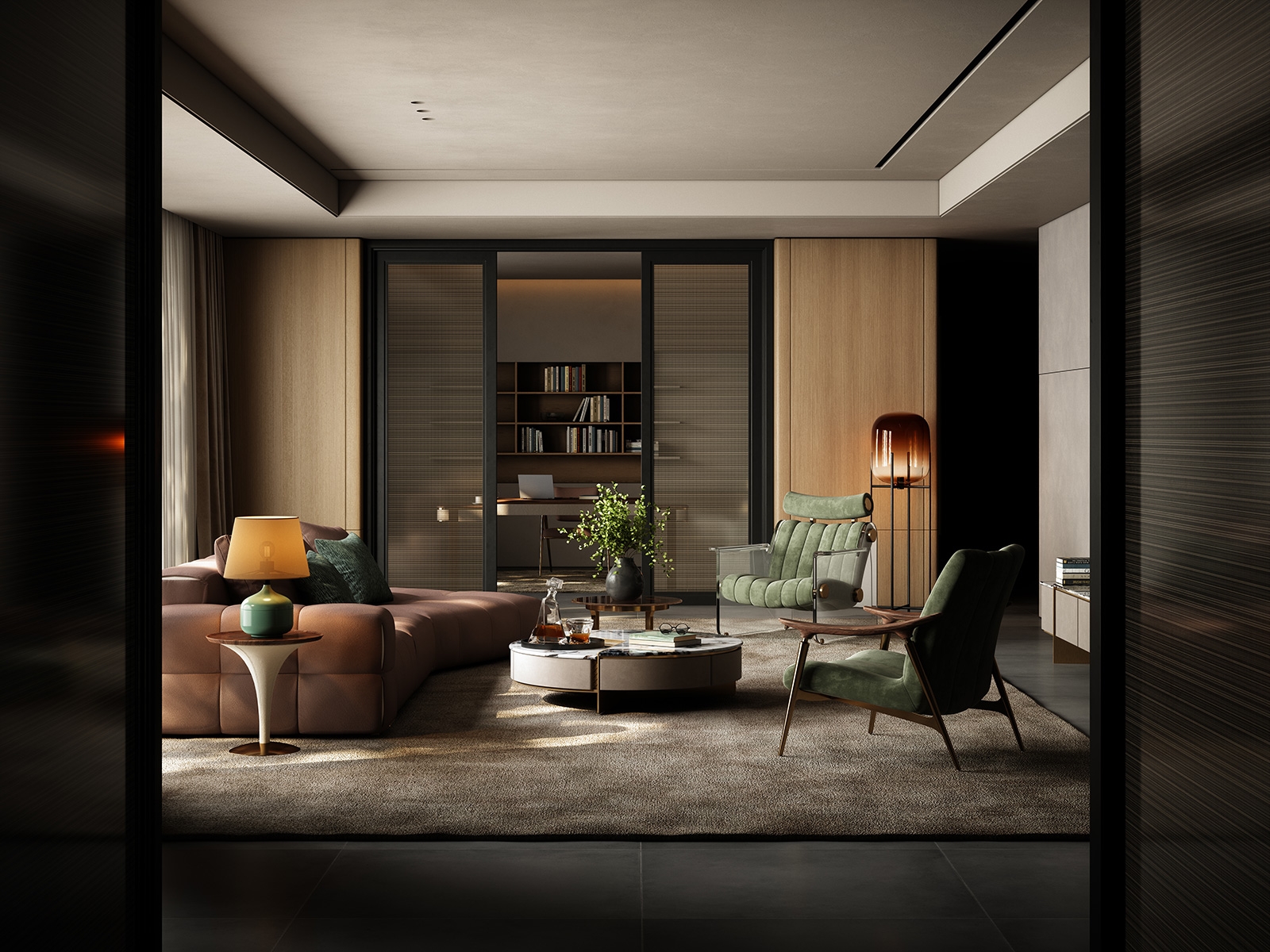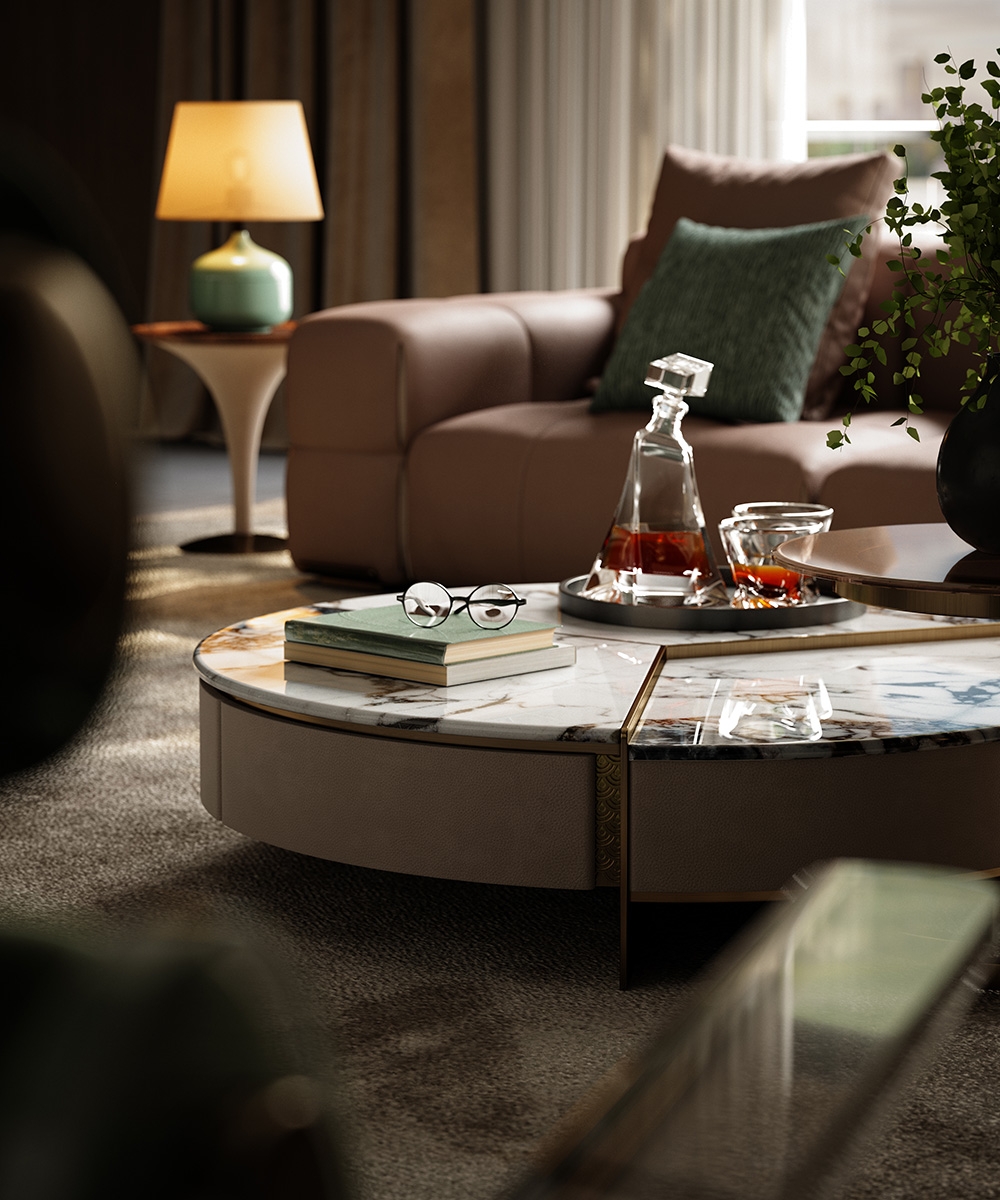The open stone slab countertop is divided into different storage areas, where wine glasses, books, and glasses are displayed in an orderly manner to meet the needs of various social scenarios; the lower leather storage cabinet has a hidden drawer design to store small items, keeping the space tidy, achieving a balance between beauty and practicality, and making the living room a high-end social space.