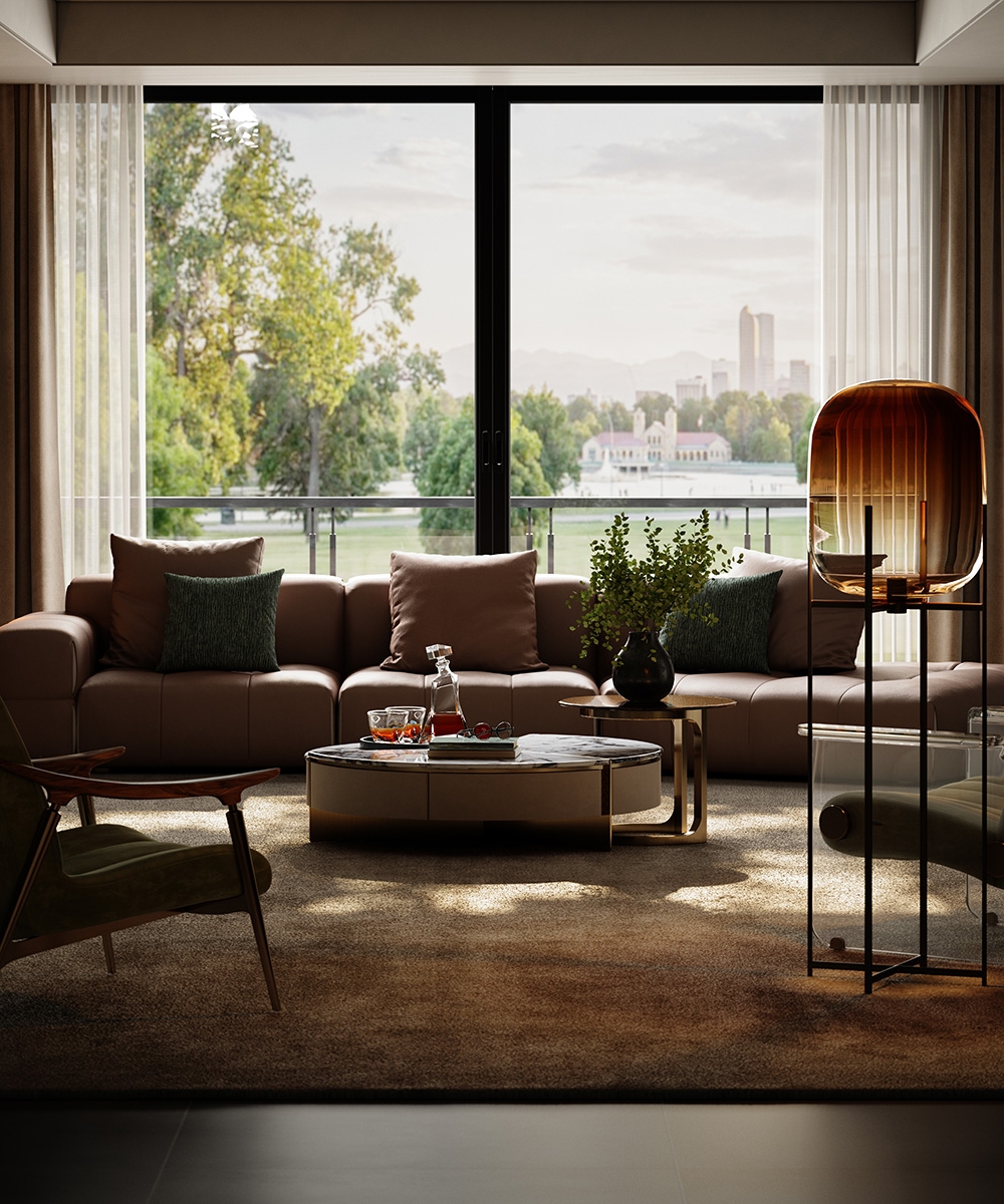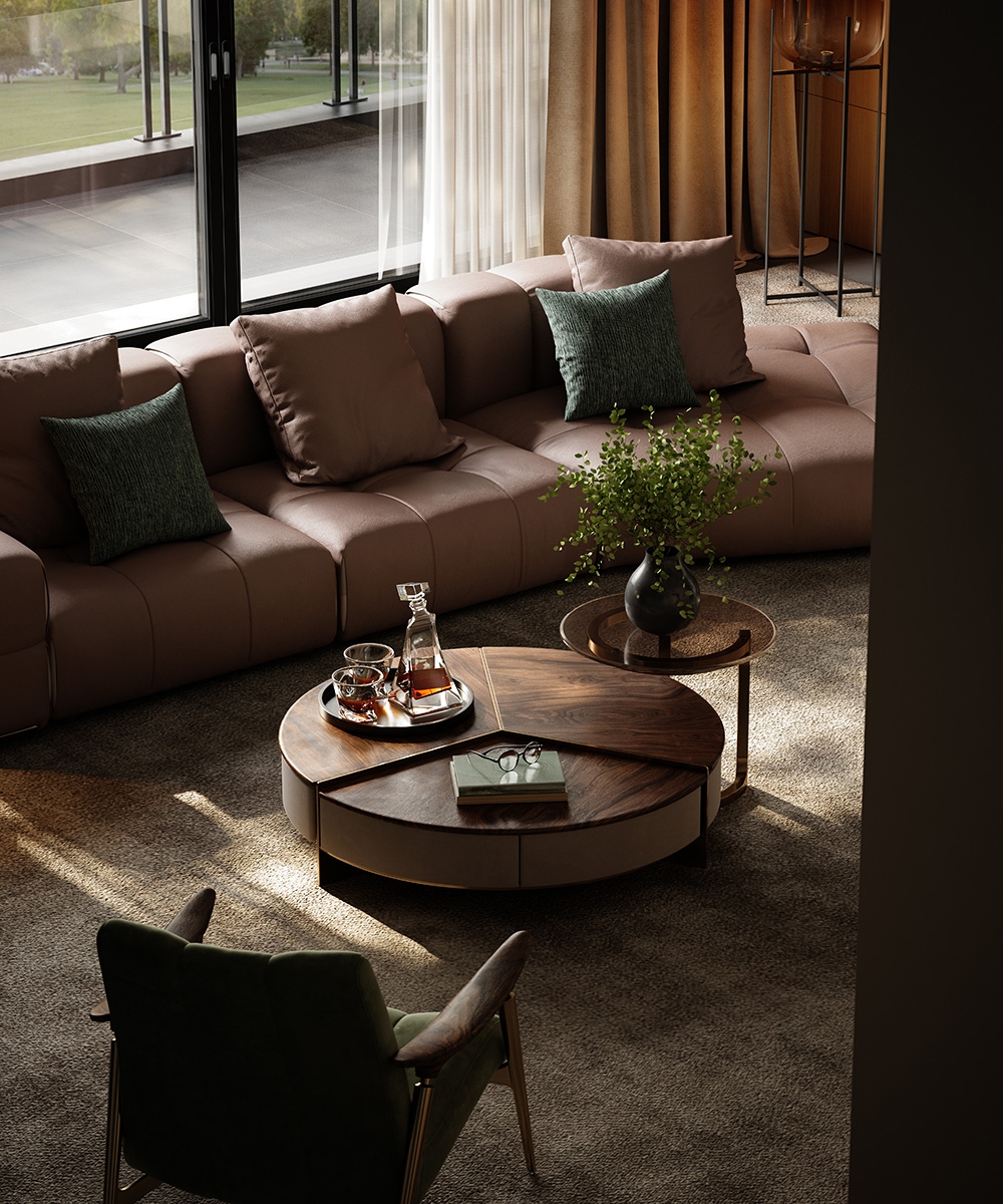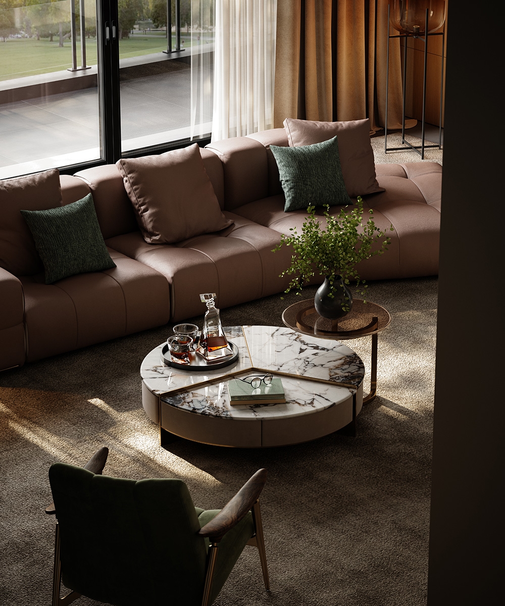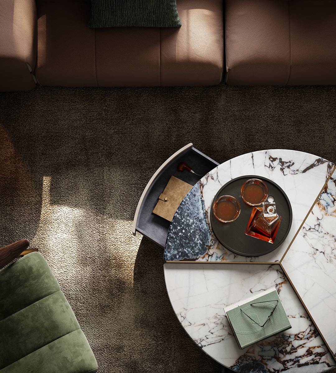 The open stone slab countertop is divided into different storage areas, where wine glasses, books, and glasses are displayed in an orderly manner to meet the needs of various social scenarios; the lower leather storage cabinet has a hidden drawer design to store small items, keeping the space tidy, achieving a balance between beauty and practicality, and making the living room a high-end social space.