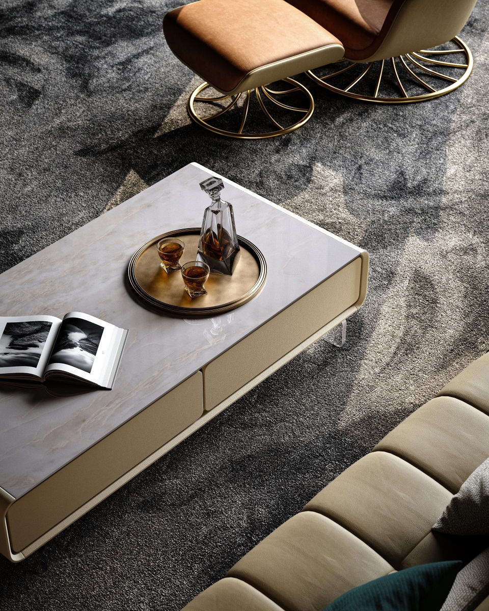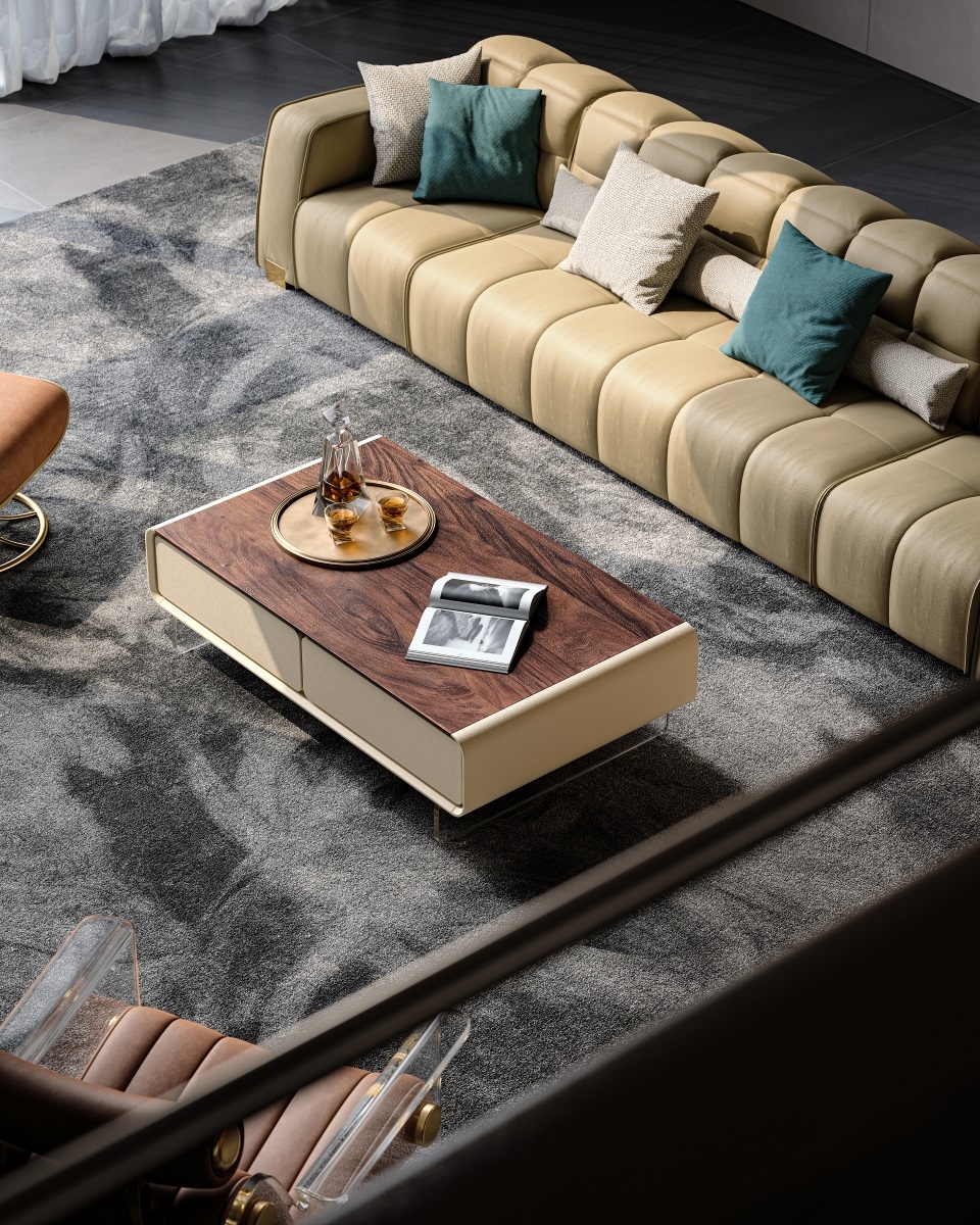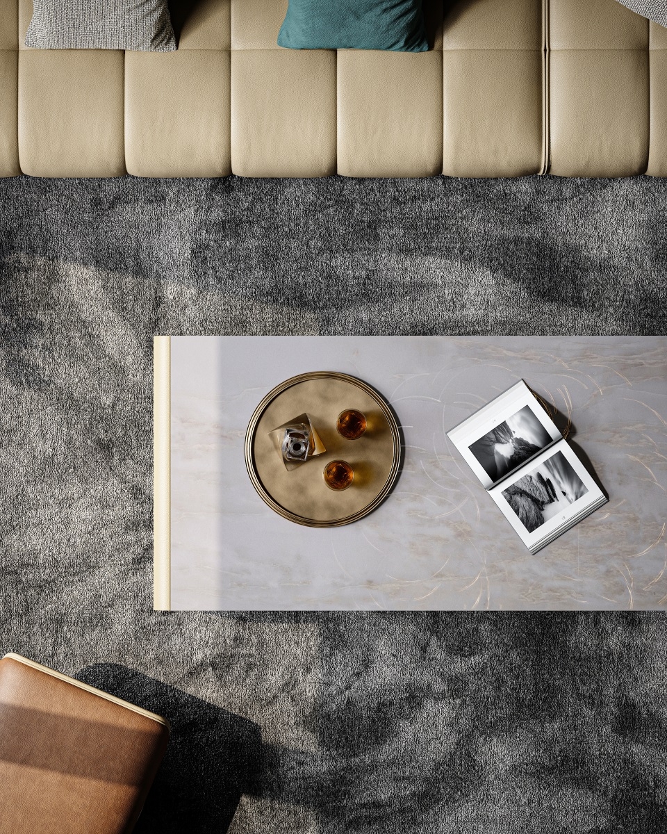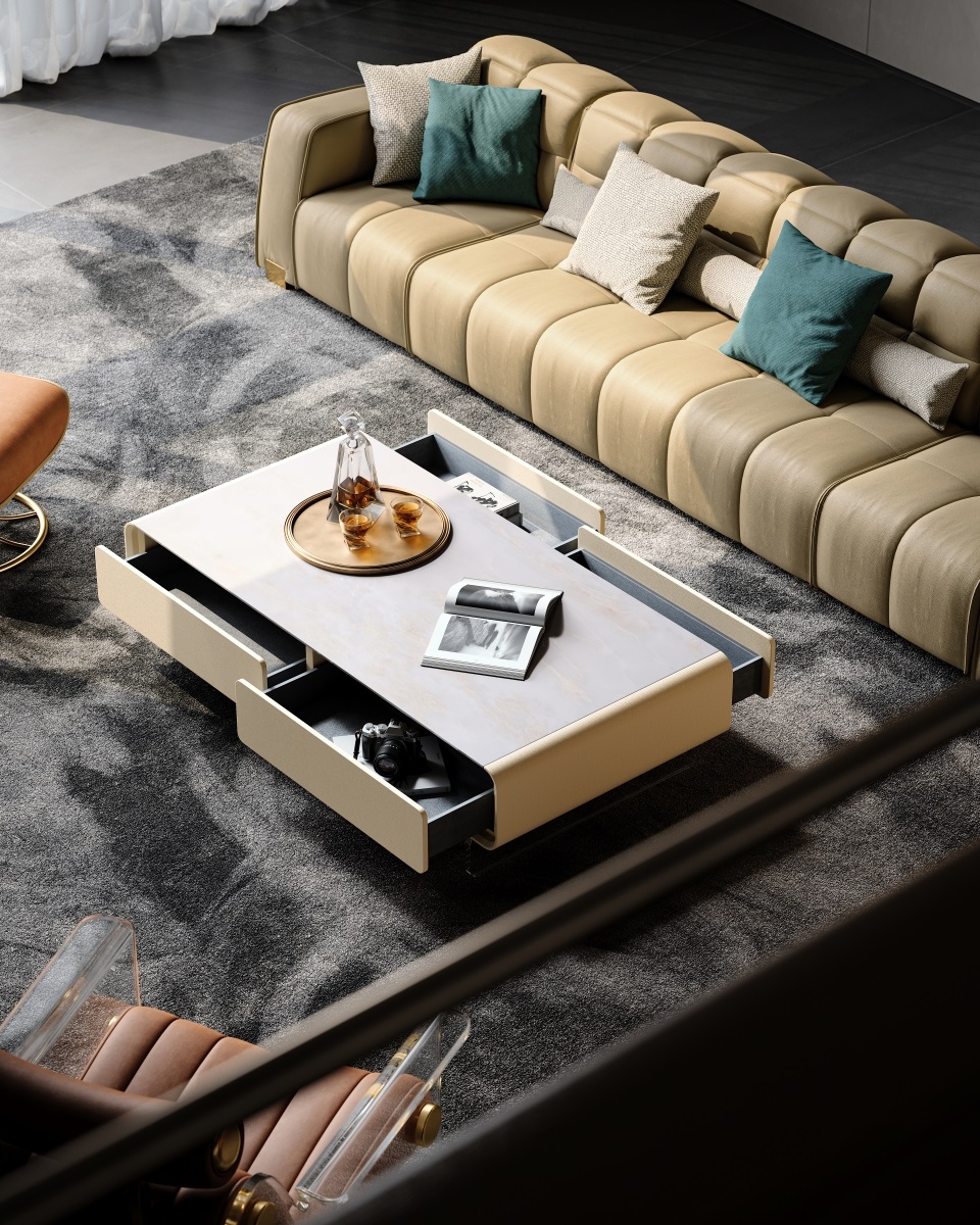 it outlines a refined natural texture. It cleverly hides storage space, integrating delicate