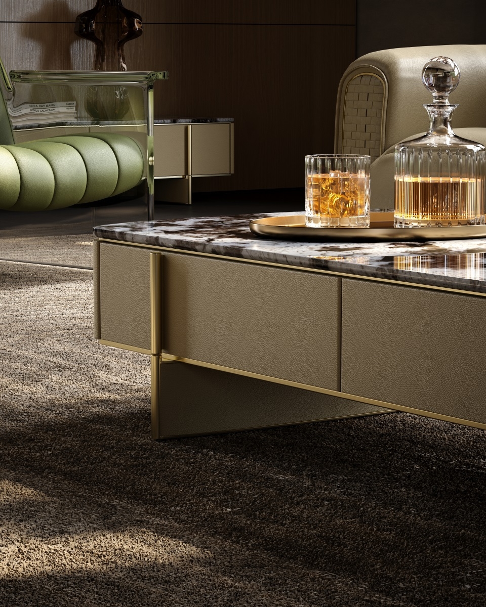 Natural stone or solid wood is inlaid within the metal. Despite the combination of different materials,