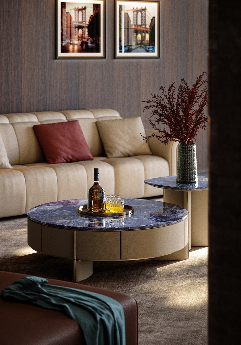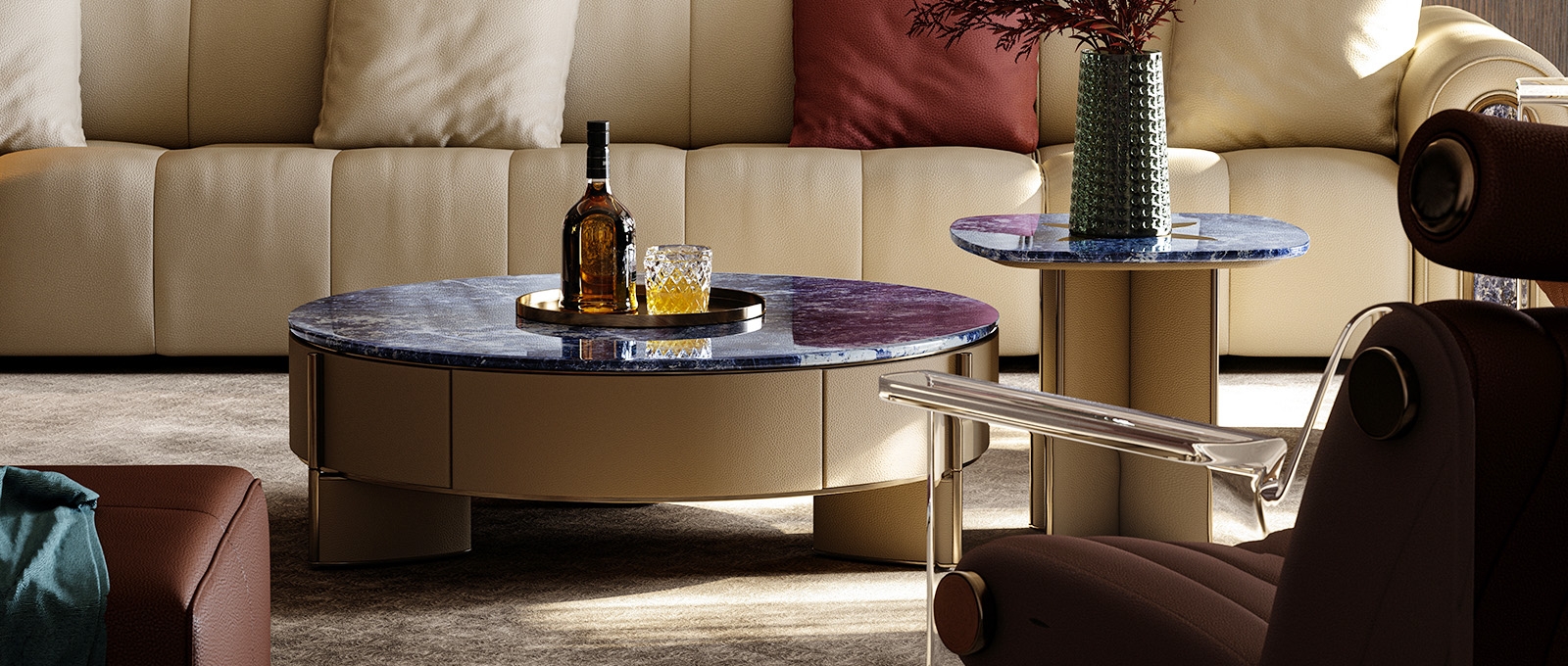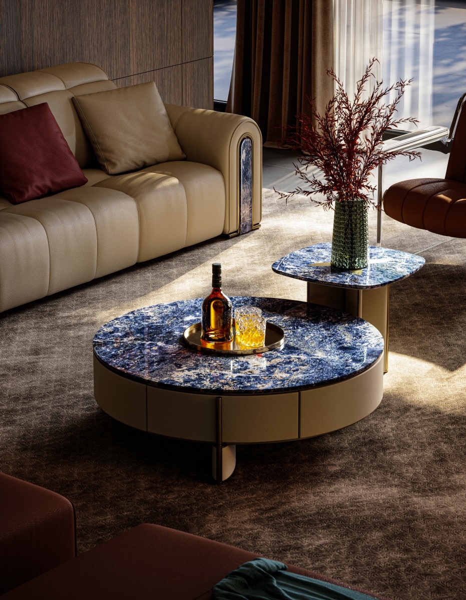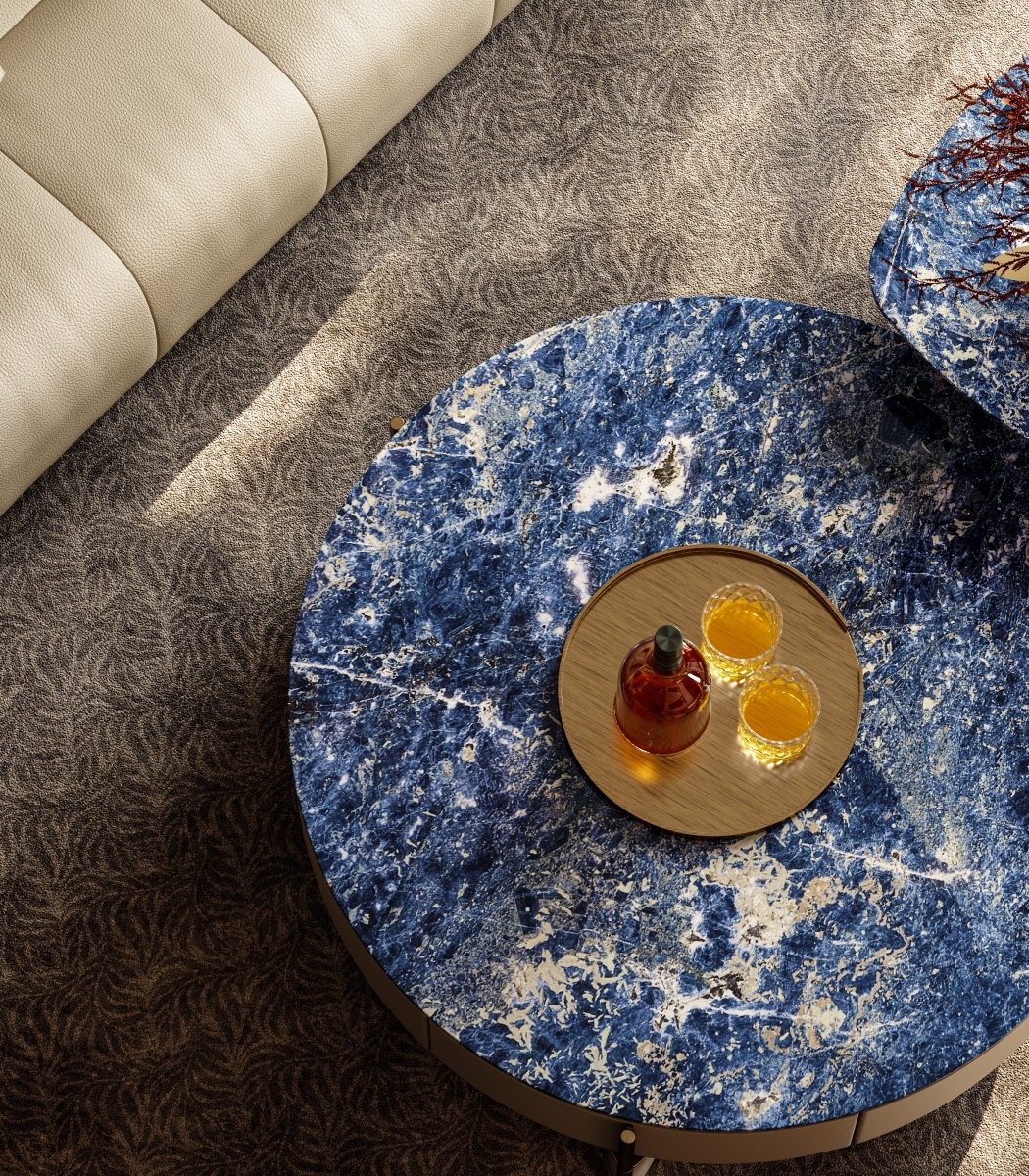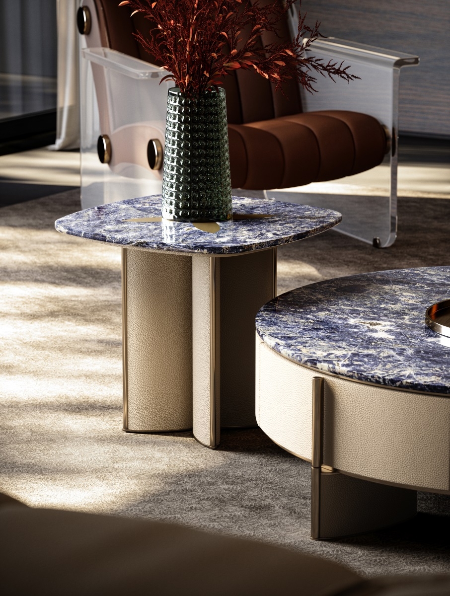 Natural stone or solid wood is inlaid within the metal. Despite the combination of different materials,