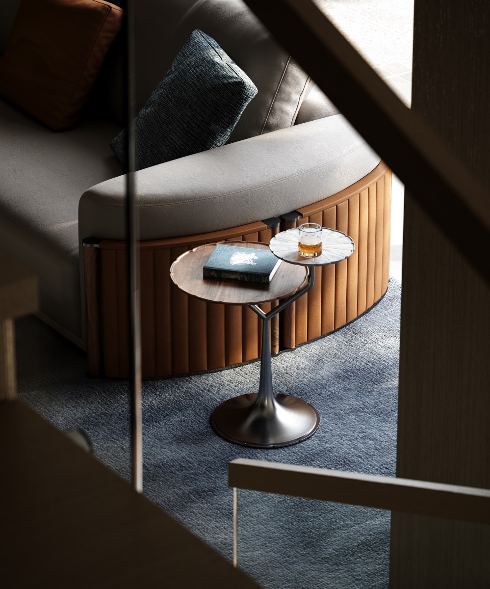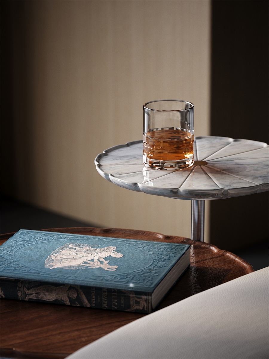 Taking the shape of lotus leaves, using solid wood and marble to create a round lotus leaf shape, using wood grain to outline the natural course of the lotus leaf, and using exquisite craftsmanship to create dynamic leaf veins on the lotus leaf, which are lively and orderly, showcasing natural beauty and design aesthetics.