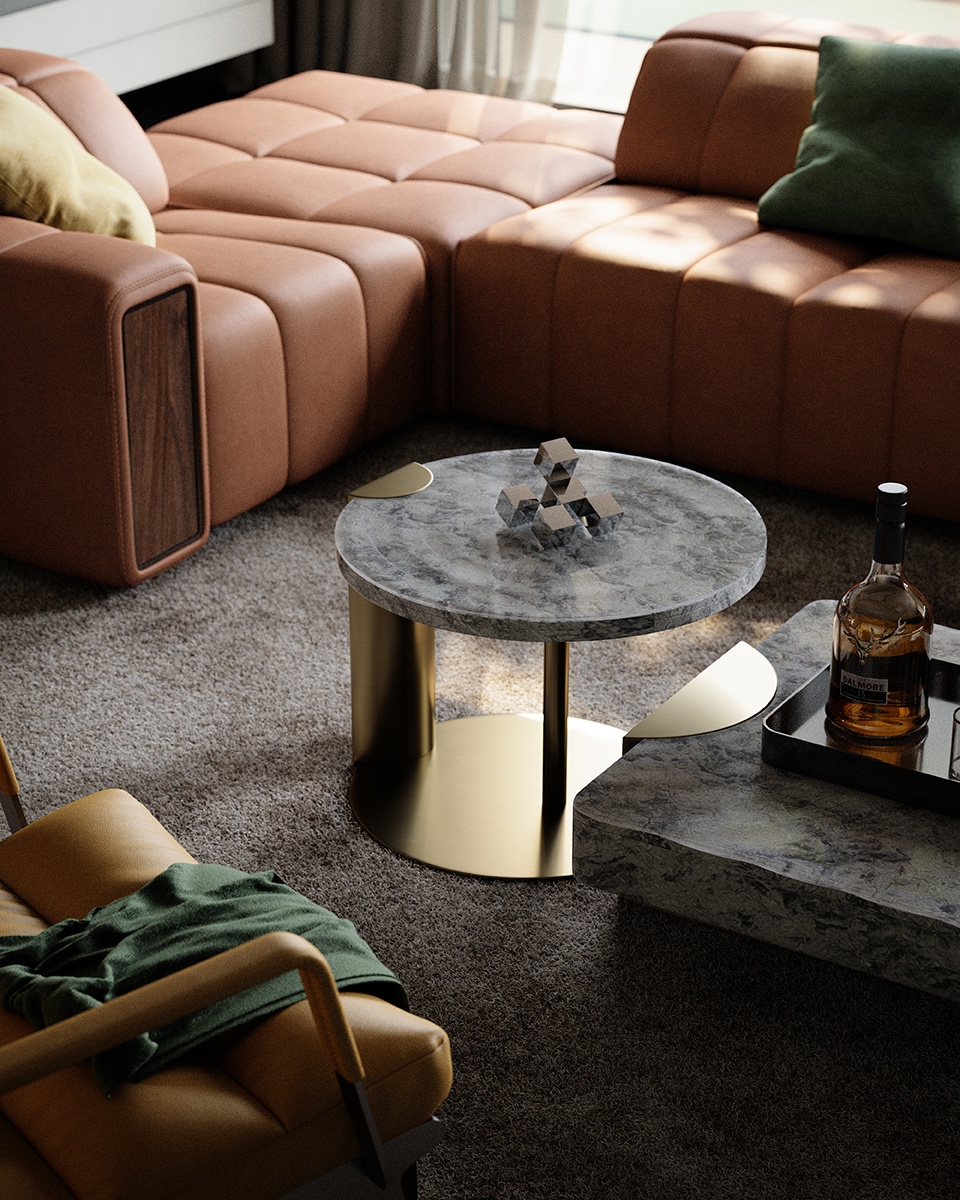 The design is unique, with the circular shape of the panel and base echoing each other. Through the guidance of its semi-circular and circular legs, the coffee table looks lighter.