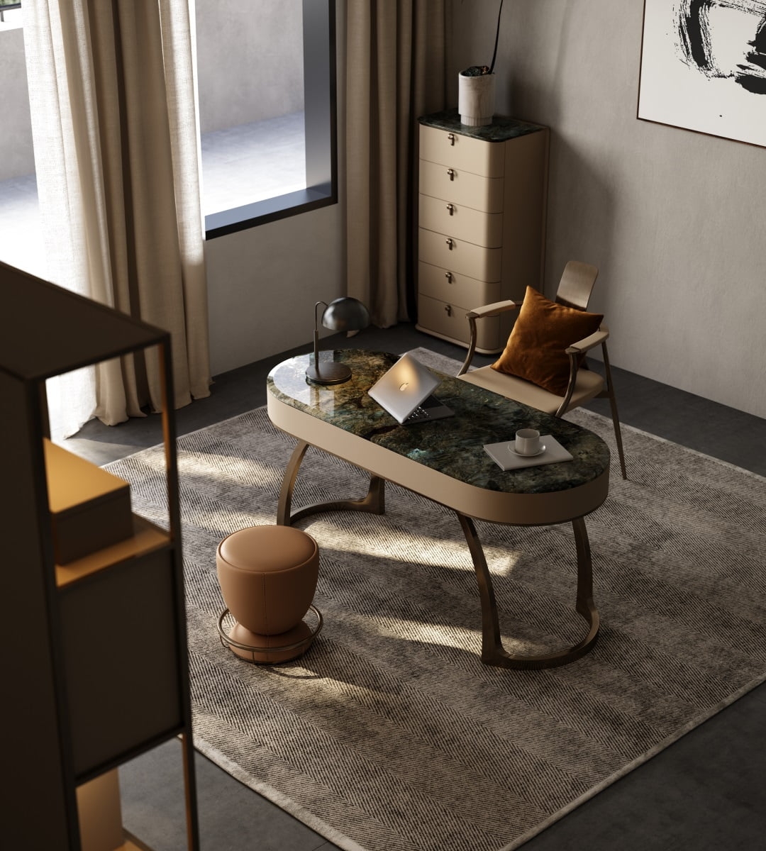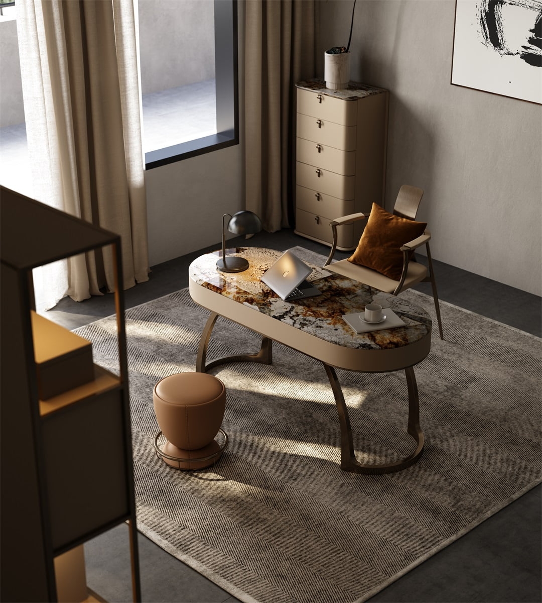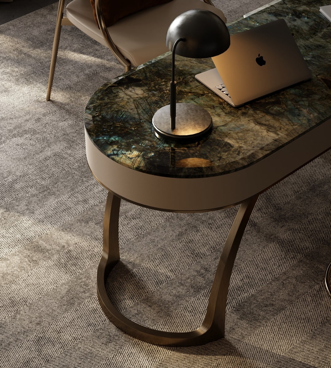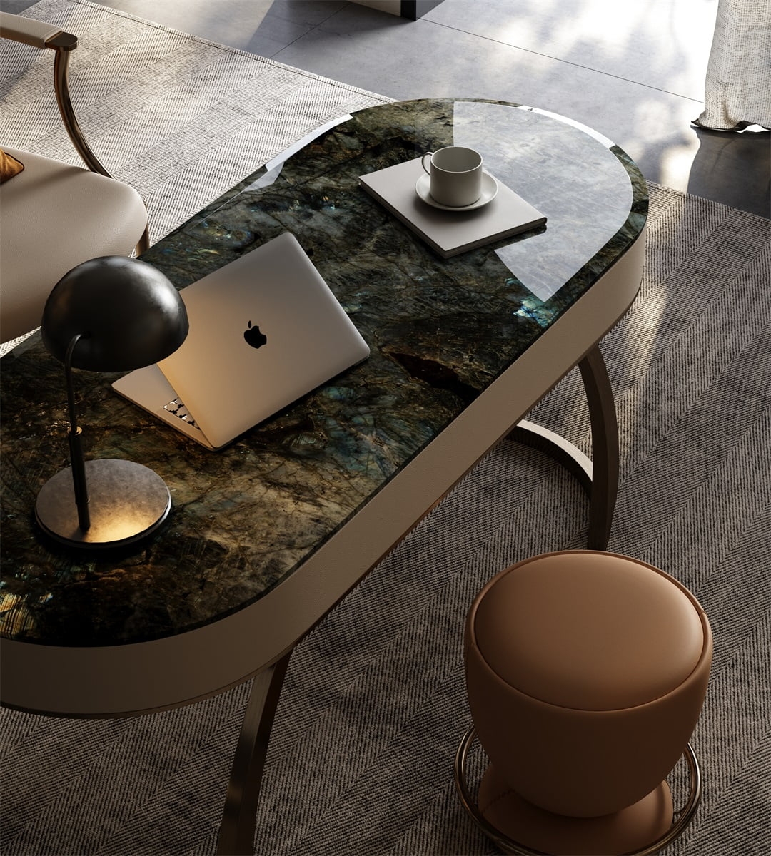 This desk showcases a stunning natural stone tabletop with rich, variegated hues, exuding luxury. The curved, metallic - finished legs in a warm bronze tone add a modern, sculptural touch. Complemented by a sleek black lamp, a laptop, and a cup, it creates an elegant, functional workspace. Ideal for a high - end home office, it blends natural beauty with contemporary design, reflecting meticulous craftsmanship and refined taste.