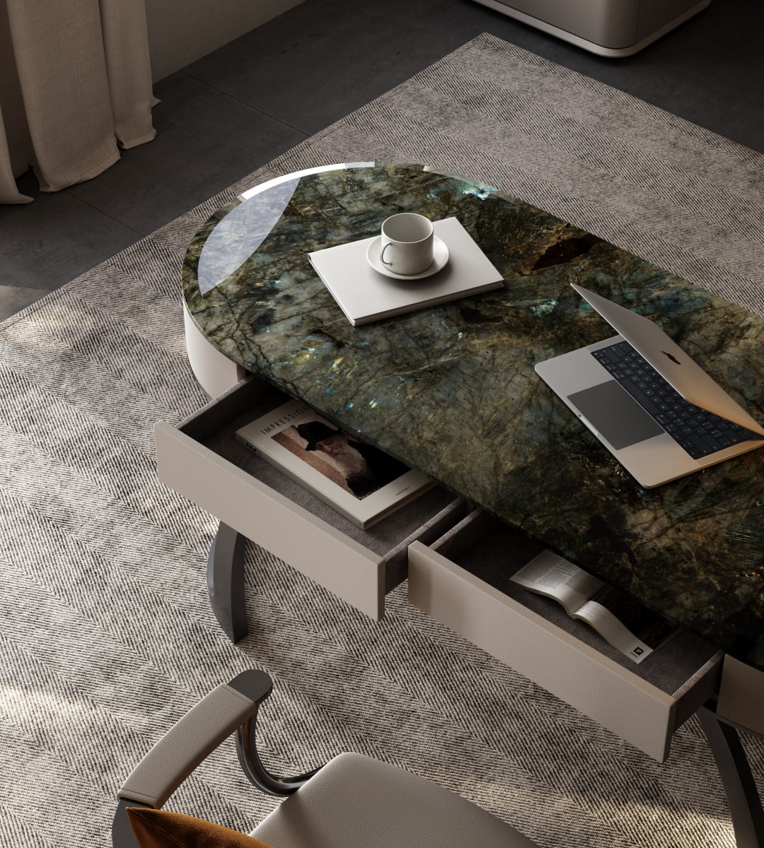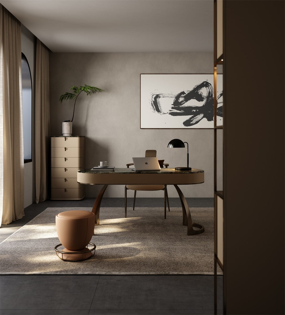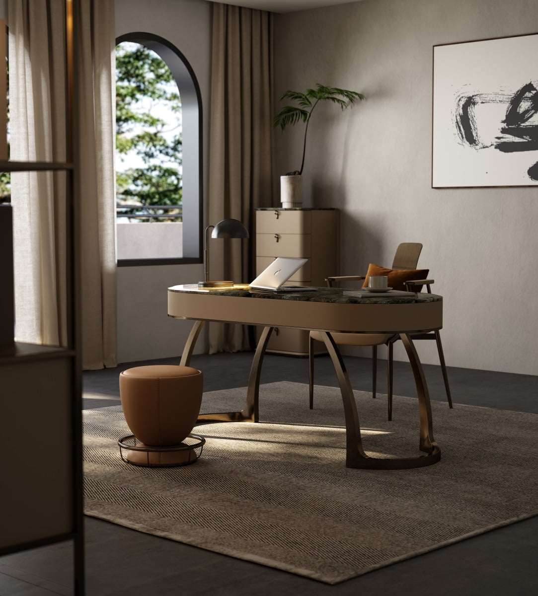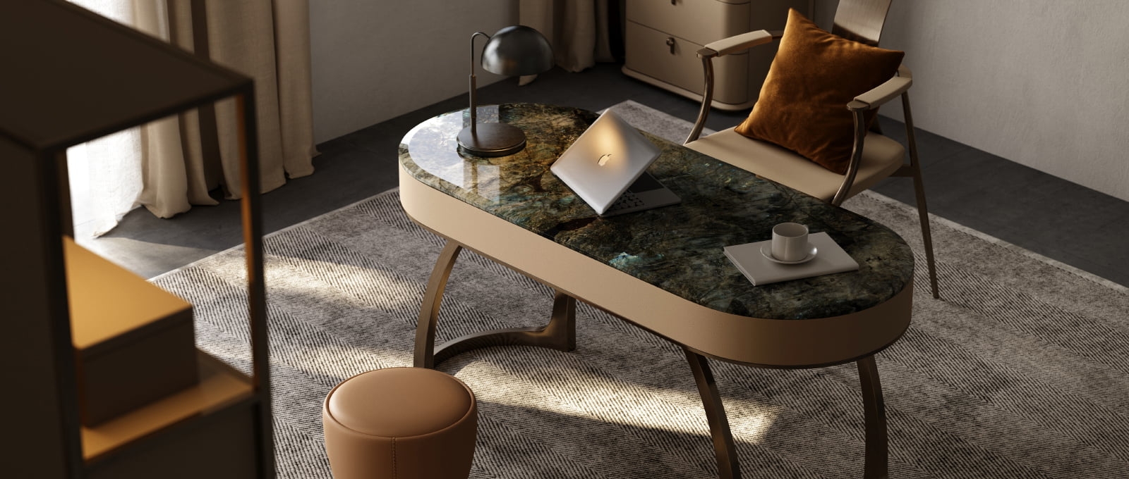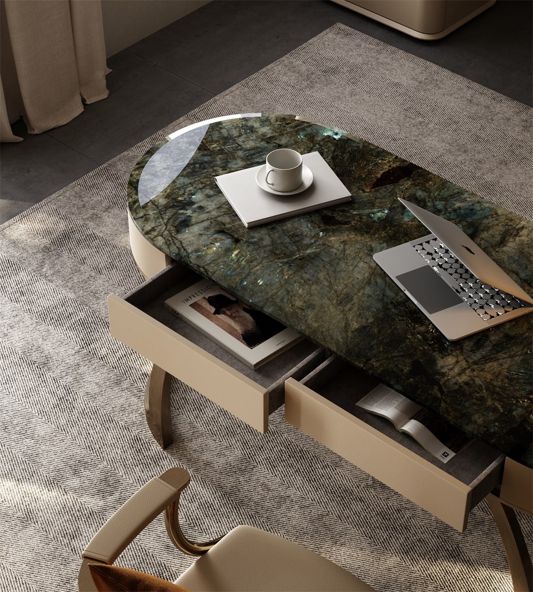 This desk showcases a stunning natural stone tabletop with rich, variegated hues, exuding luxury. The curved, metallic - finished legs in a warm bronze tone add a modern, sculptural touch. Complemented by a sleek black lamp, a laptop, and a cup, it creates an elegant, functional workspace. Ideal for a high - end home office, it blends natural beauty with contemporary design, reflecting meticulous craftsmanship and refined taste.