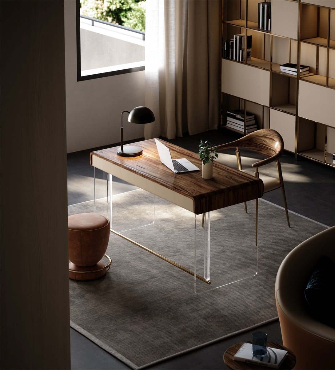The acrylic base gives the desk a wonderful visual sense of floating in the air. Through the contrast of material color, the study space is more transparent and spacious.