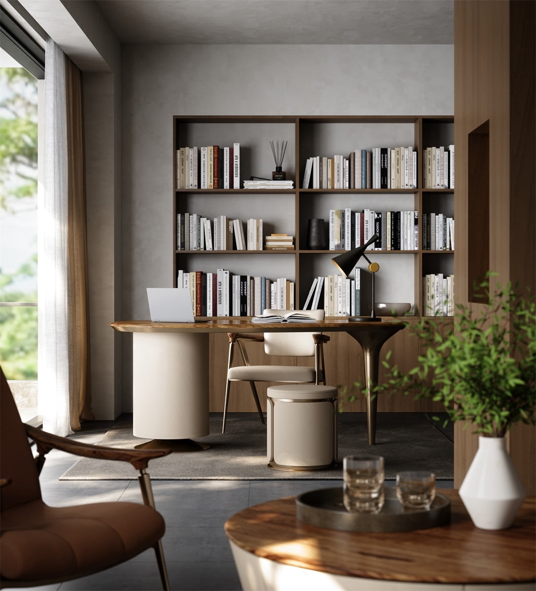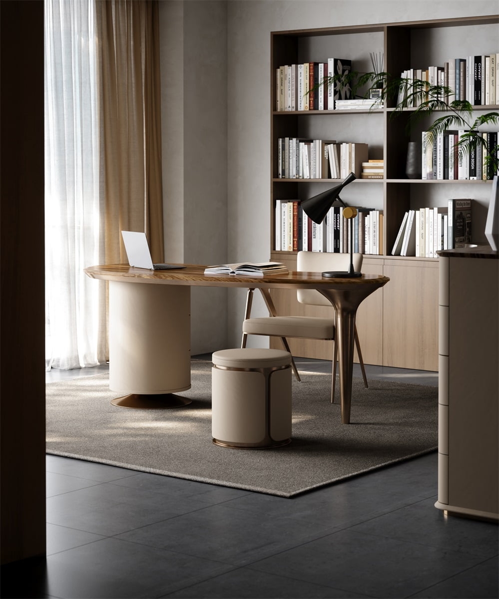 The desktop is made of natural solid wood with a unique texture like the mark of time. After fine polishing and aging, it is wear-resistant, warm and has a retro tension. The linen side cabinet presents a soft luster, and the metal frame outlines neat lines. The combination of the three weaves a retro texture base for the space, injecting a calm atmosphere into the office area.