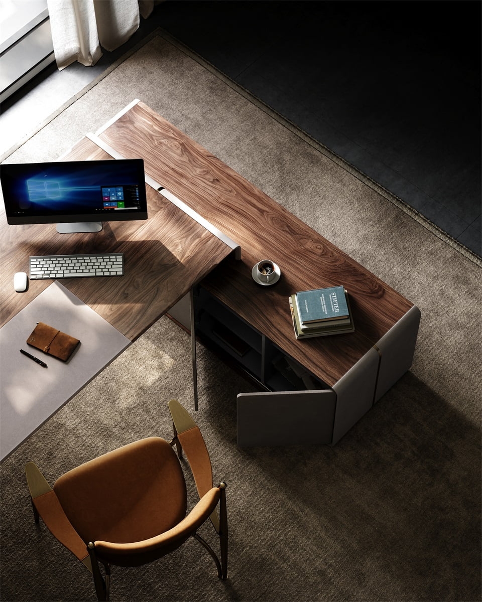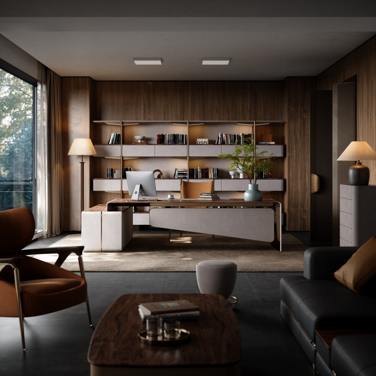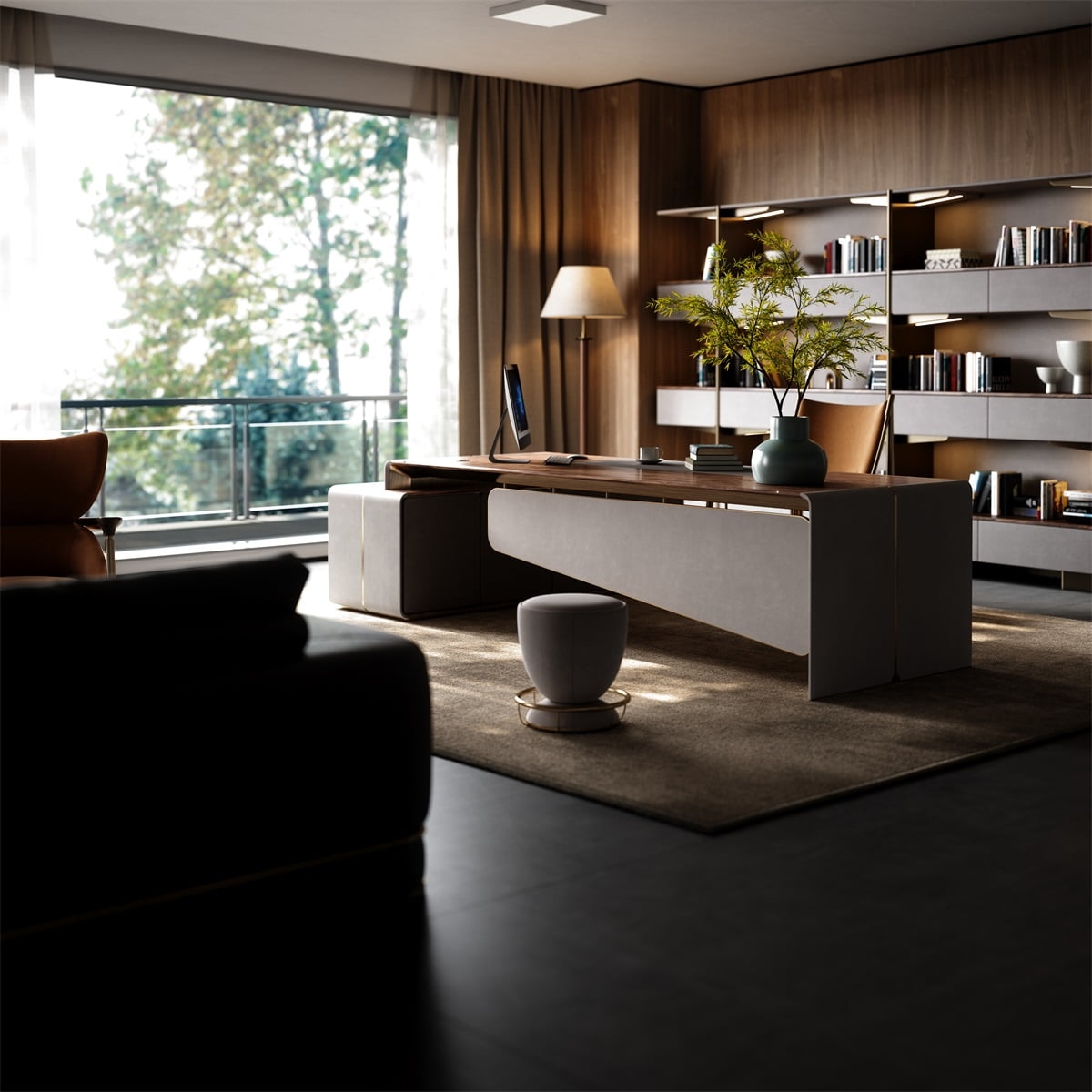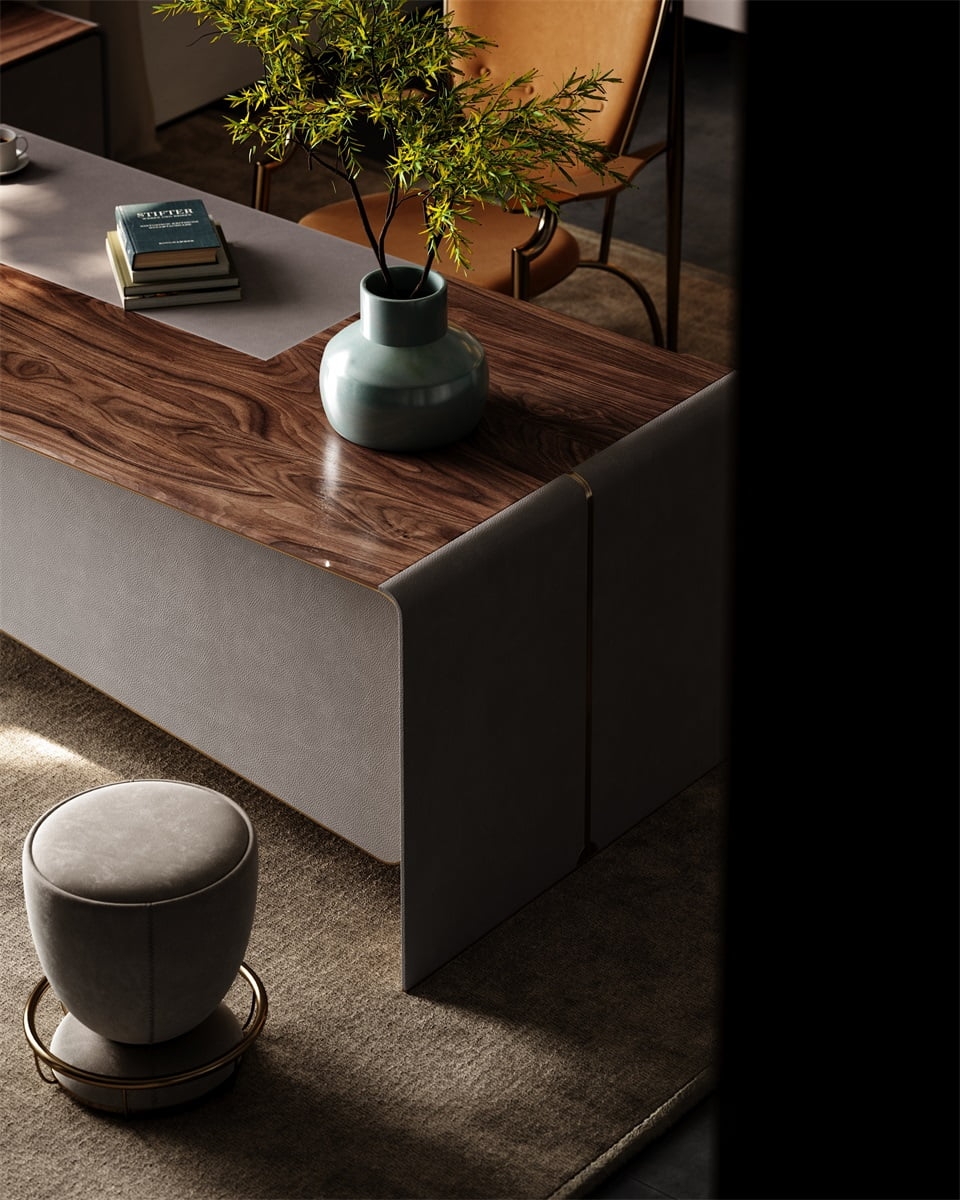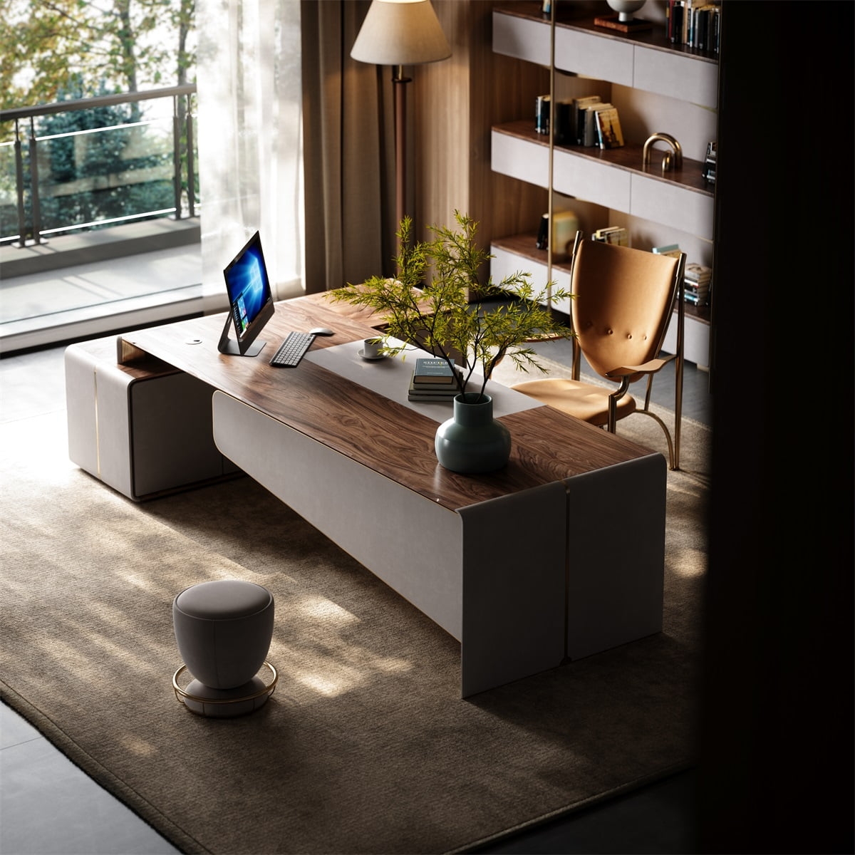 In business scenarios that focus on high-end office efficiency and spatial style, this desk combines solid wood, leather, and metal materials, with an L-shaped layout + multi-zone storage design, becoming the "decision-making center" of the office, allowing every business negotiation and office decision to become a high-end experience embracing quality business.