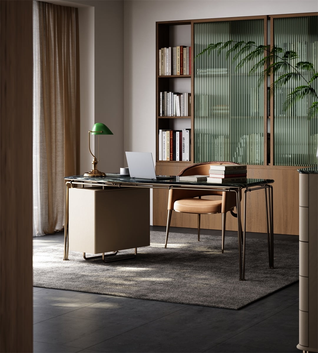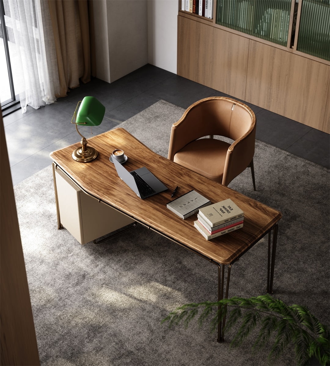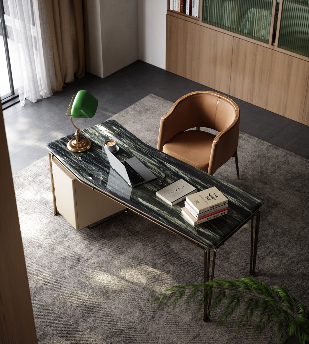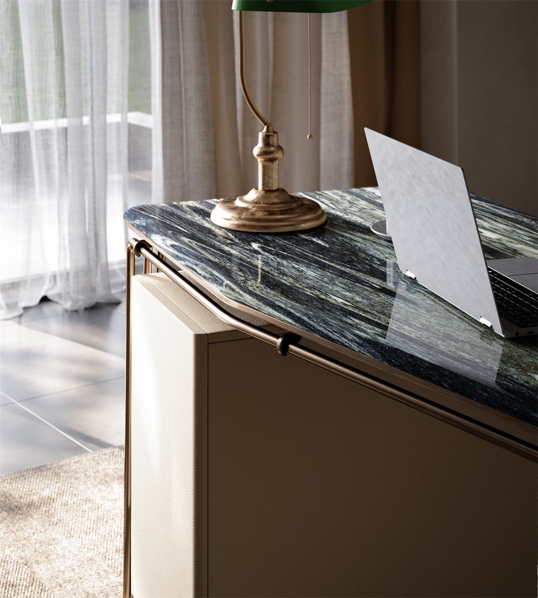 The desktop is made of natural rock slabs with a unique texture like the mark of time. After fine polishing and anti-seepage treatment, it is wear-resistant, stain-resistant and has a retro tension. The linen side cabinet presents a soft luster, and the metal frame outlines neat lines. The combination of the three weaves a retro texture base for the space, injecting a calm atmosphere into the office area.