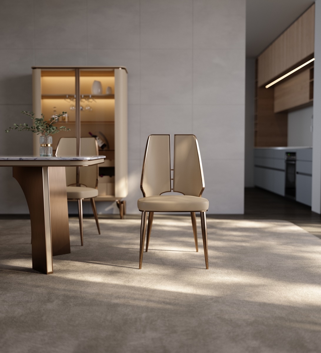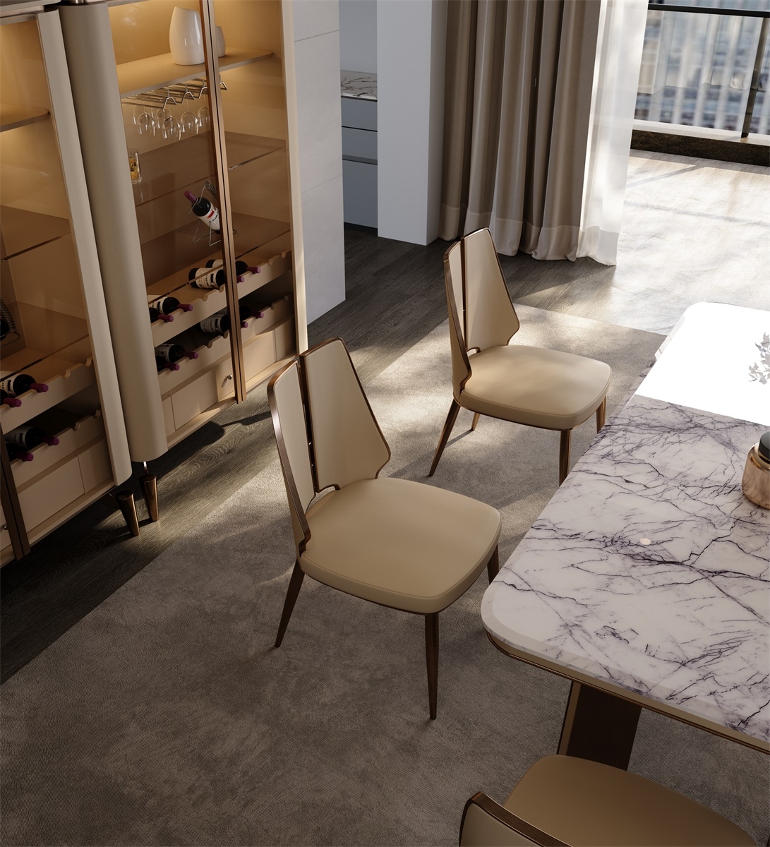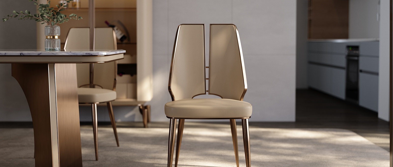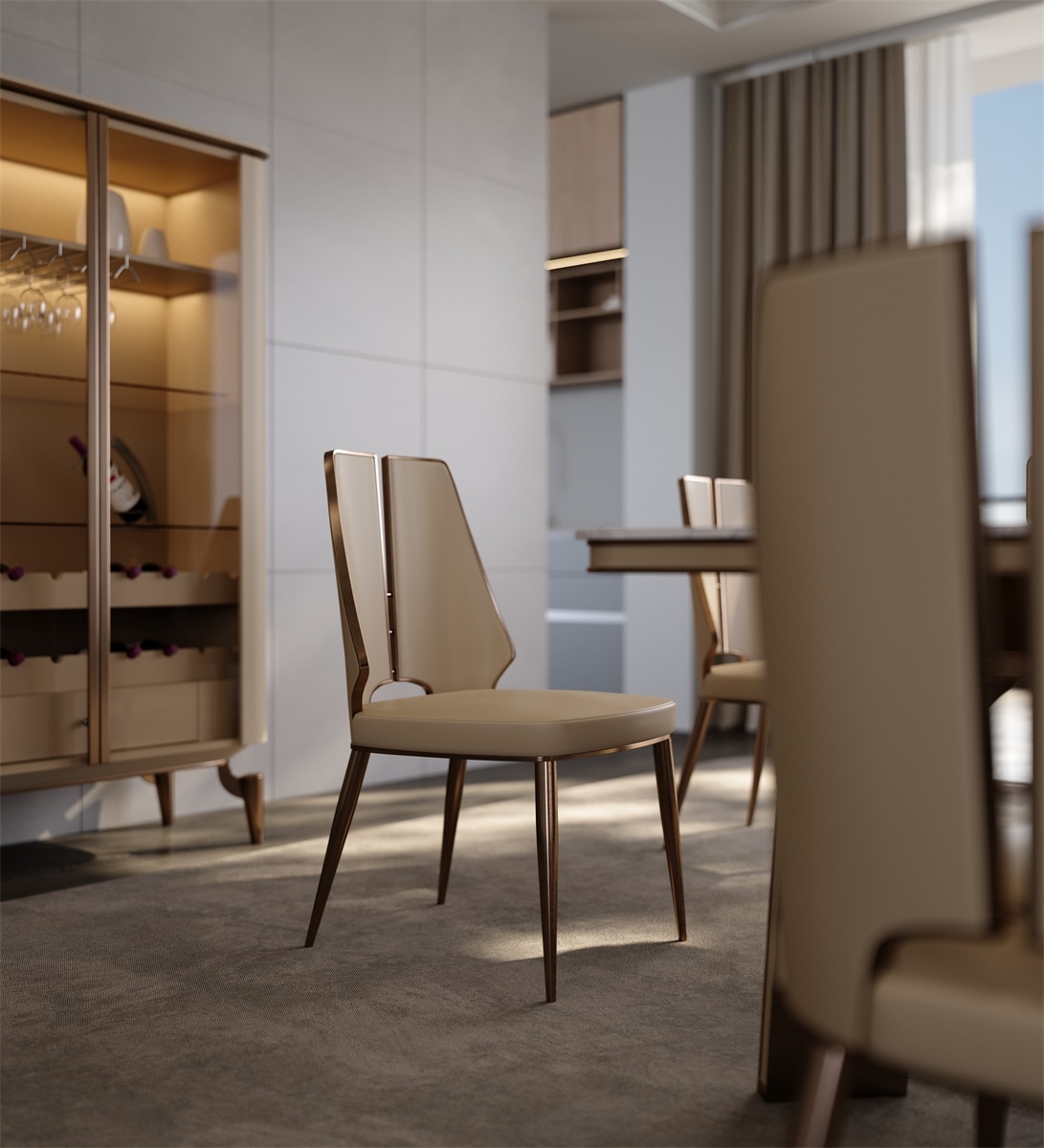 The seat and backrest are made of first-layer yellow cowhide. The light beige leather is delicate and soft. After ecological tanning, it retains the natural texture and breathability of the leather. It is skin-friendly and durable. The chair legs are made of metal, and the electroplating process presents an exquisite metallic luster. The softness of the leather and the hardness of the metal complement each other, outlining a warm and elegant texture for the restaurant.