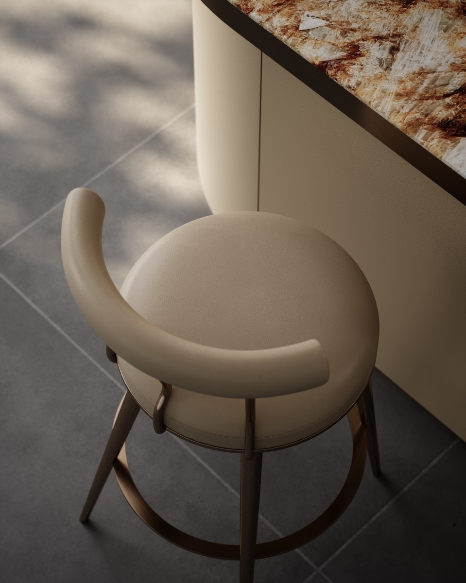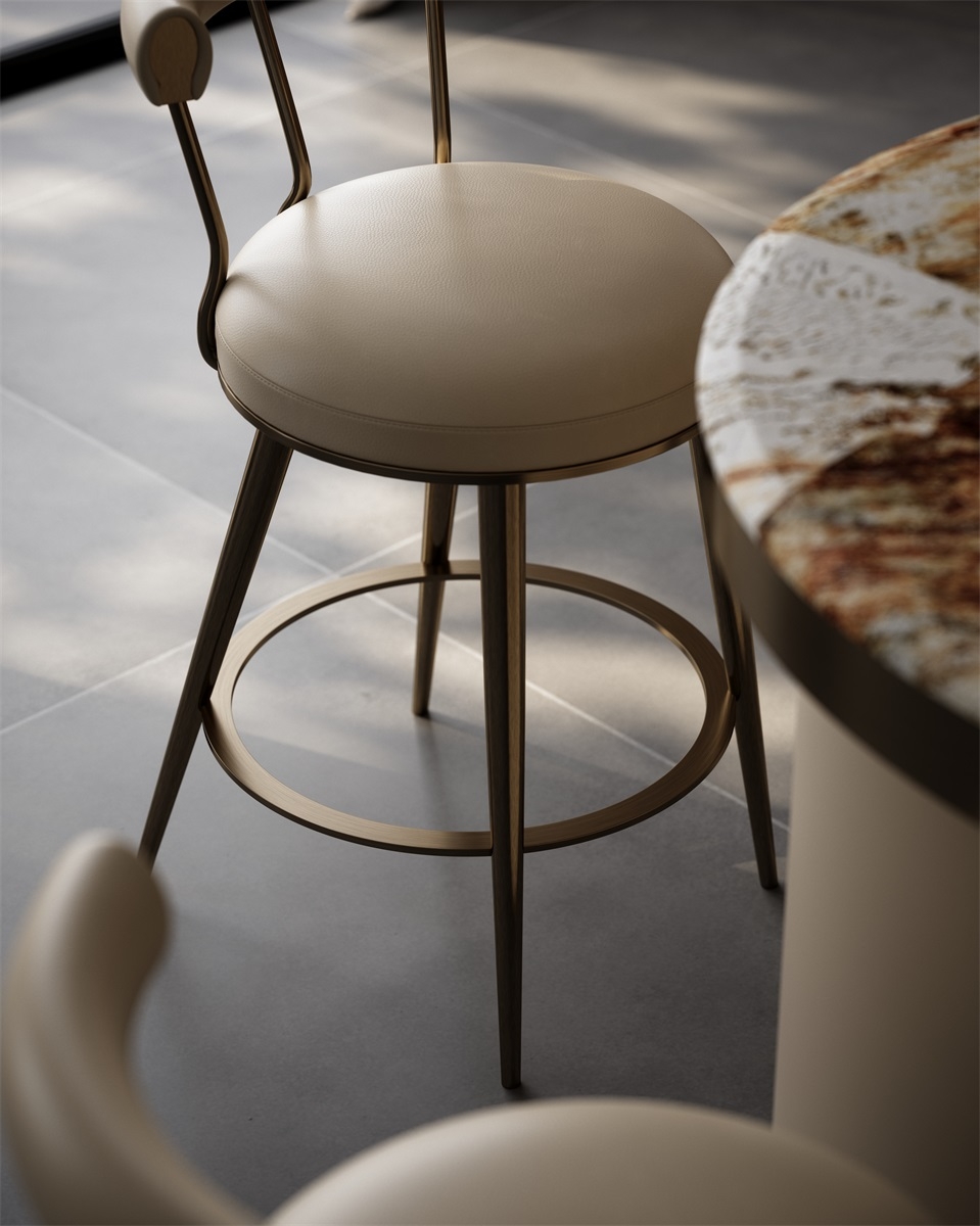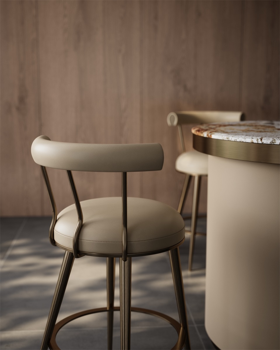 cylindrical metal legs pair with curved, arc-shaped surfaces, creating a round and comfortable form.