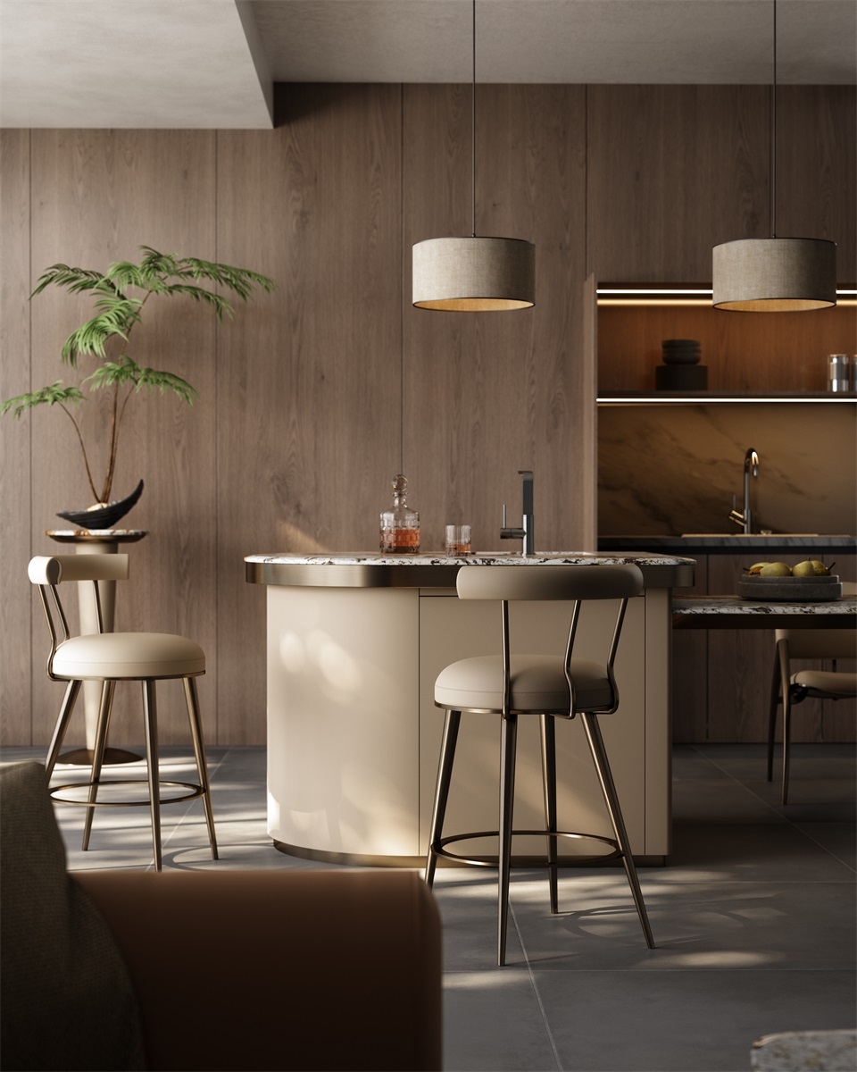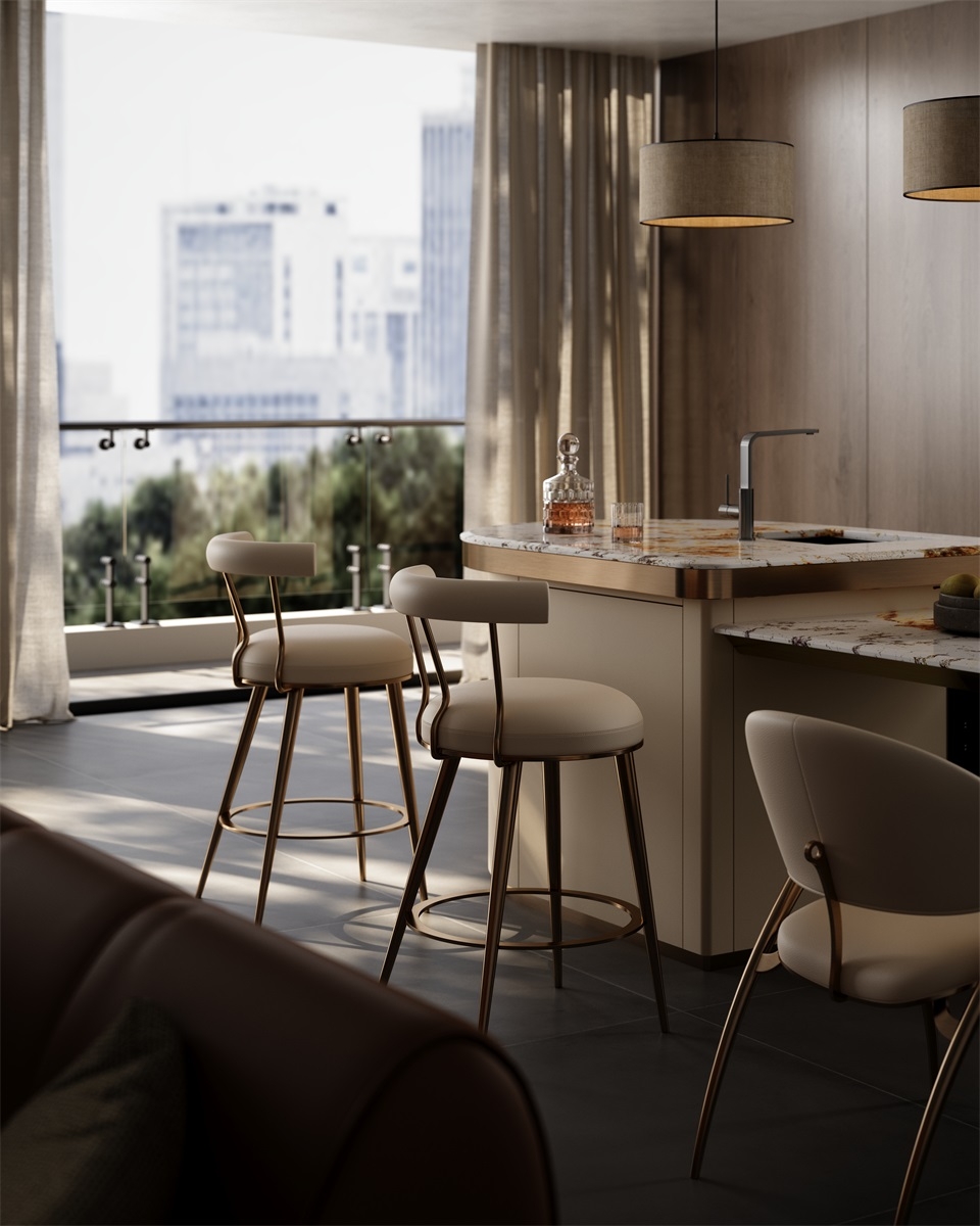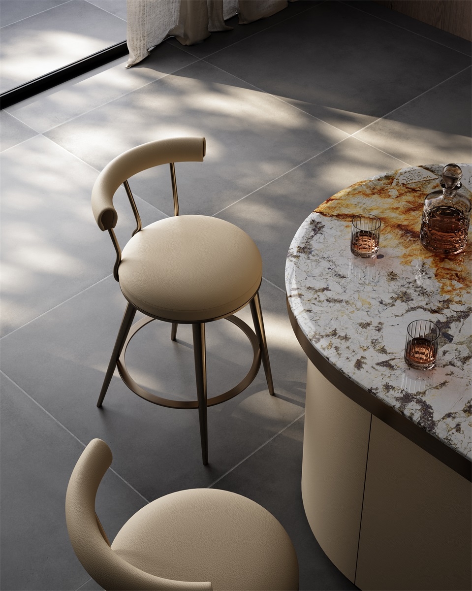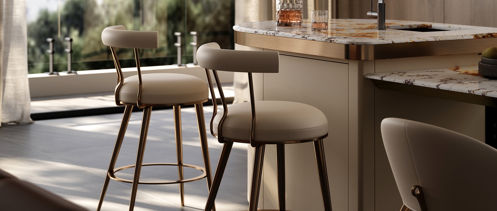 cylindrical metal legs pair with curved, arc-shaped surfaces, creating a round and comfortable form.