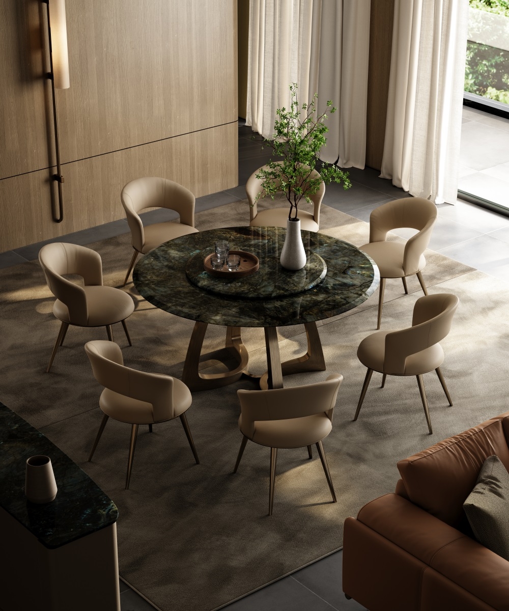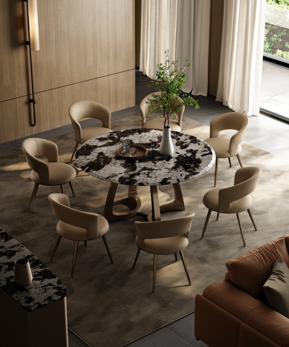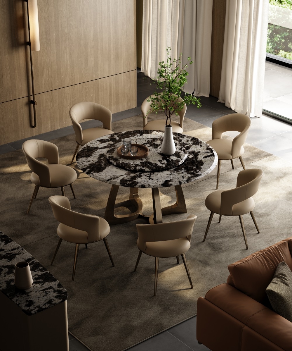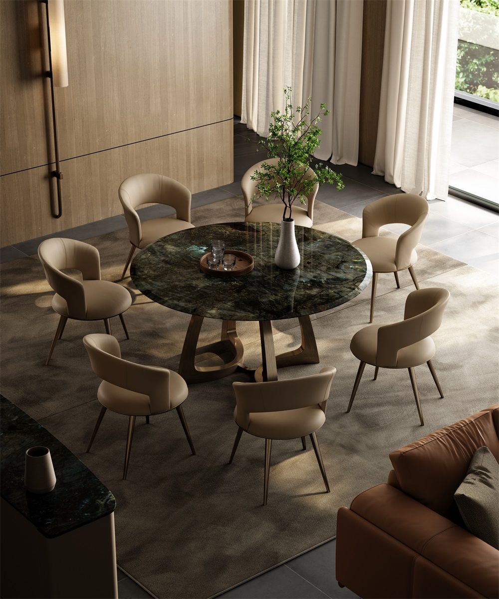 The countertop is made of natural marble with a unique texture like an art painting. It has been finely polished and anti-seepage treated to be wear-resistant, stain-resistant and full of artistic tension. The petal-shaped metal base is forged with exquisite craftsmanship. The cold luster of the metal complements the warm texture of the marble. The combination of the two weaves an artistic texture base for the space, injecting an elegant atmosphere into the social area.