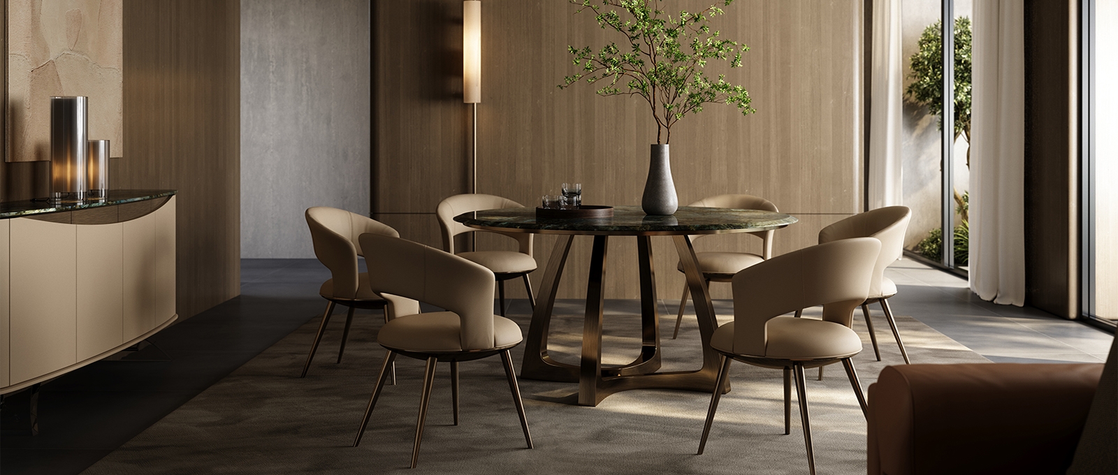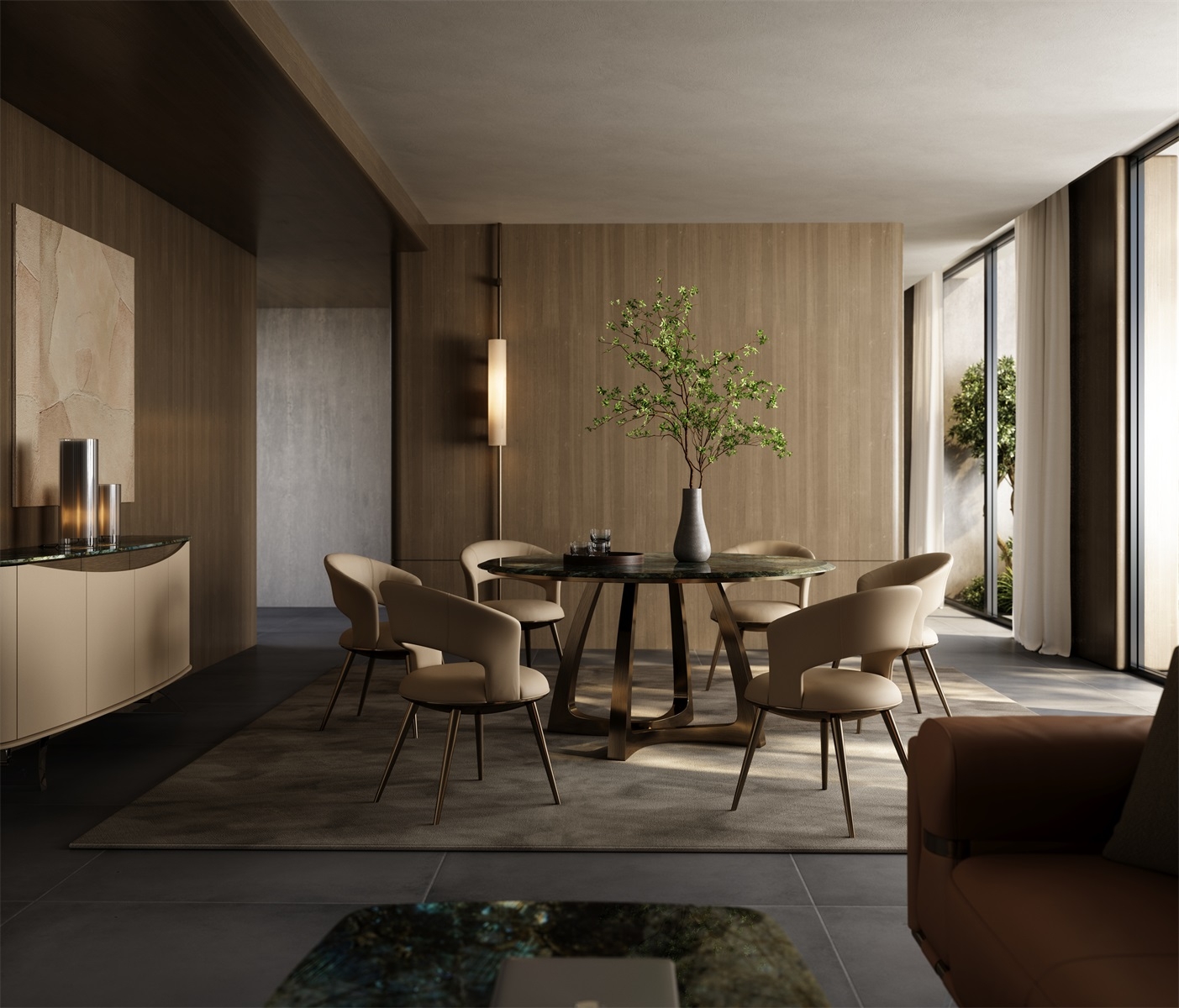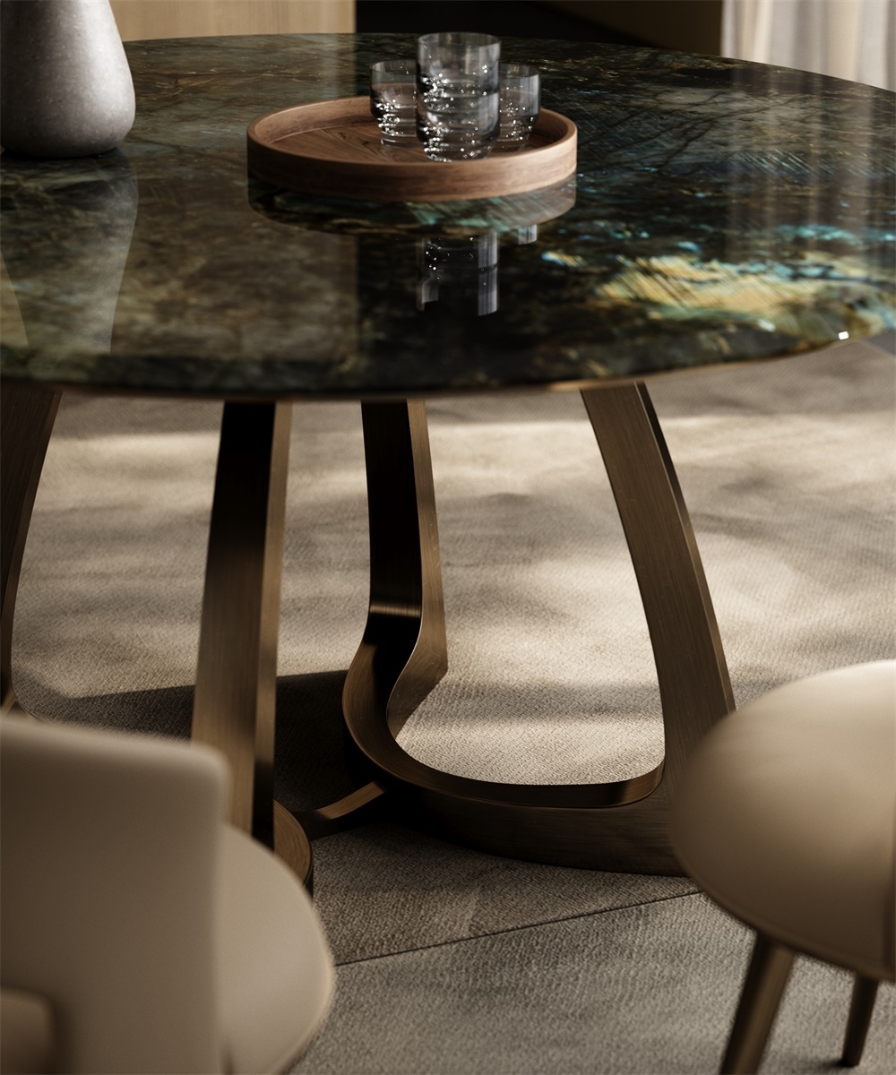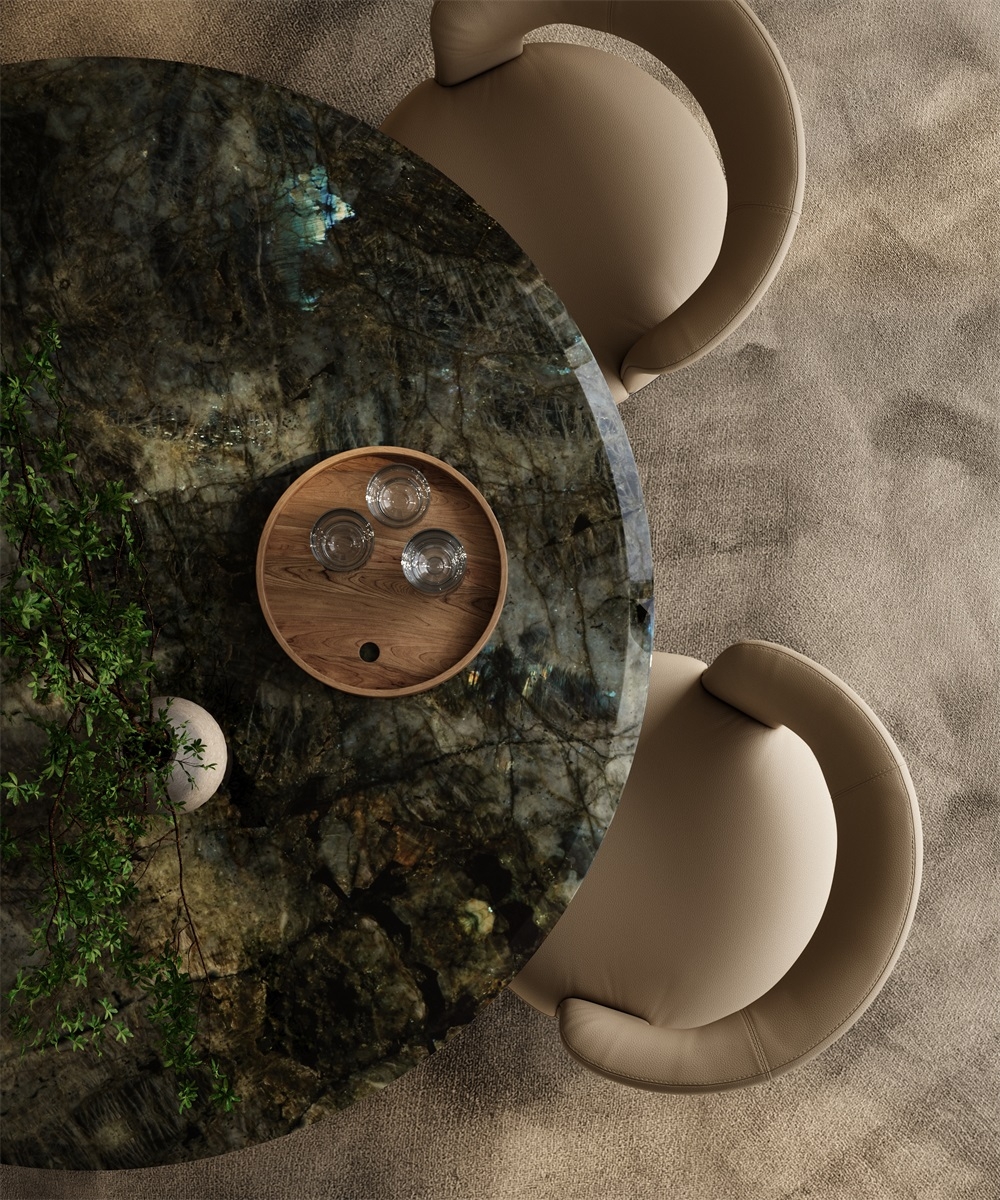 The countertop is made of natural marble with a unique texture like an art painting. It has been finely polished and anti-seepage treated to be wear-resistant, stain-resistant and full of artistic tension. The petal-shaped metal base is forged with exquisite craftsmanship. The cold luster of the metal complements the warm texture of the marble. The combination of the two weaves an artistic texture base for the space, injecting an elegant atmosphere into the social area.