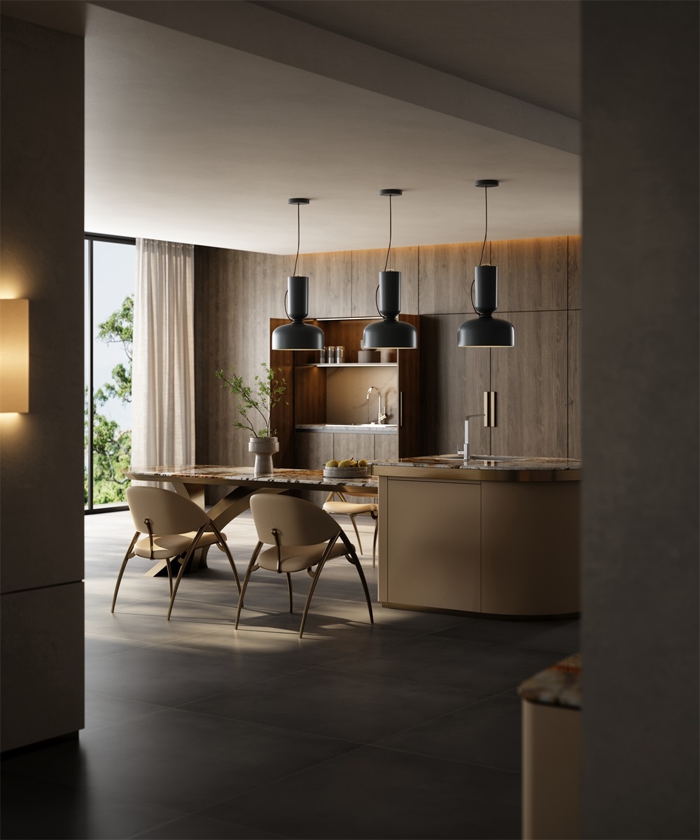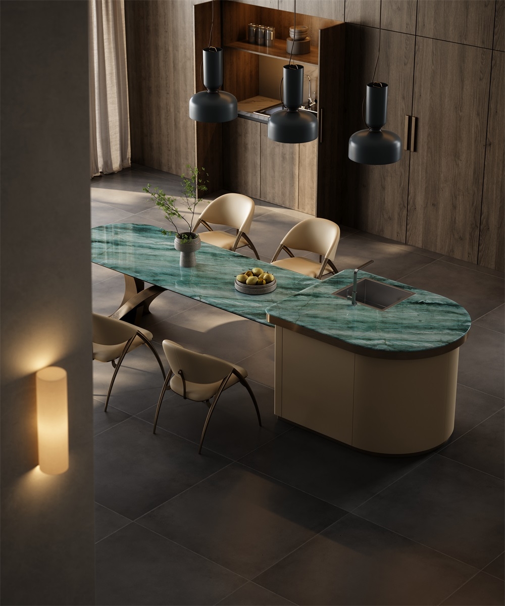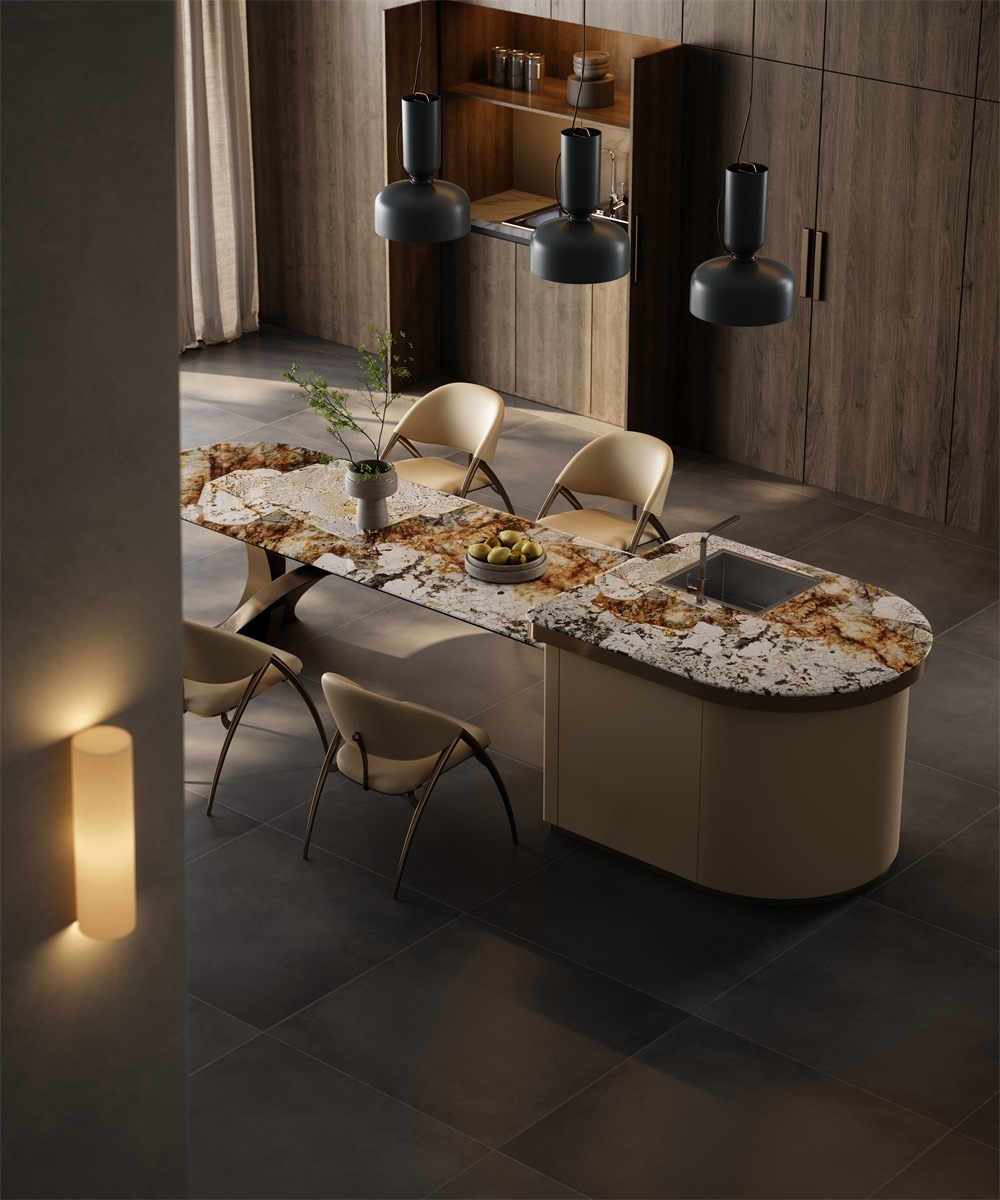 The countertop is made of natural rock slabs with a unique texture like an art painting. After fine grinding and anti-seepage treatment, it is wear-resistant, stain-resistant and has artistic tension. The metal special-shaped supports outline neat lines, and the leather storage cabinet provides a soft touch. The combination of the three weaves an artistic texture base for the space, injecting an elegant atmosphere into the dining and kitchen area.