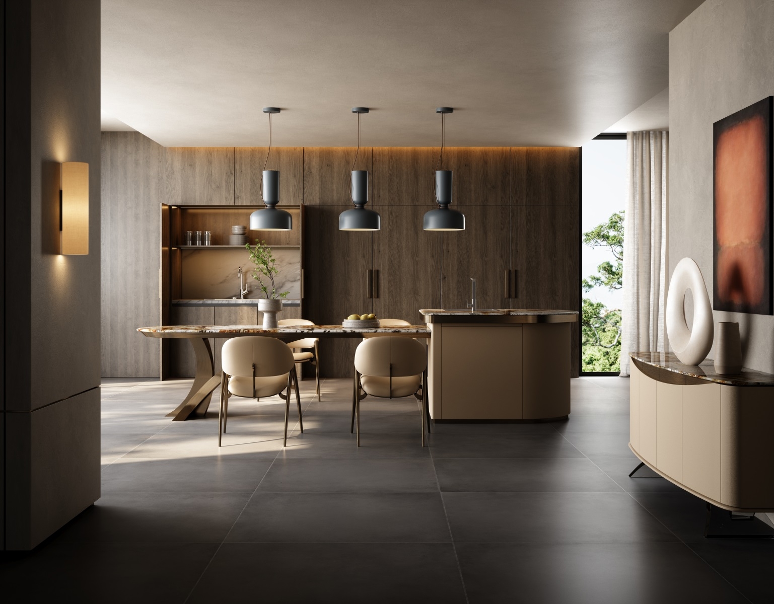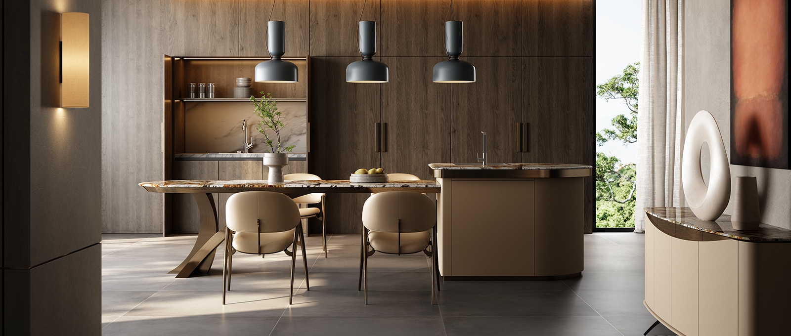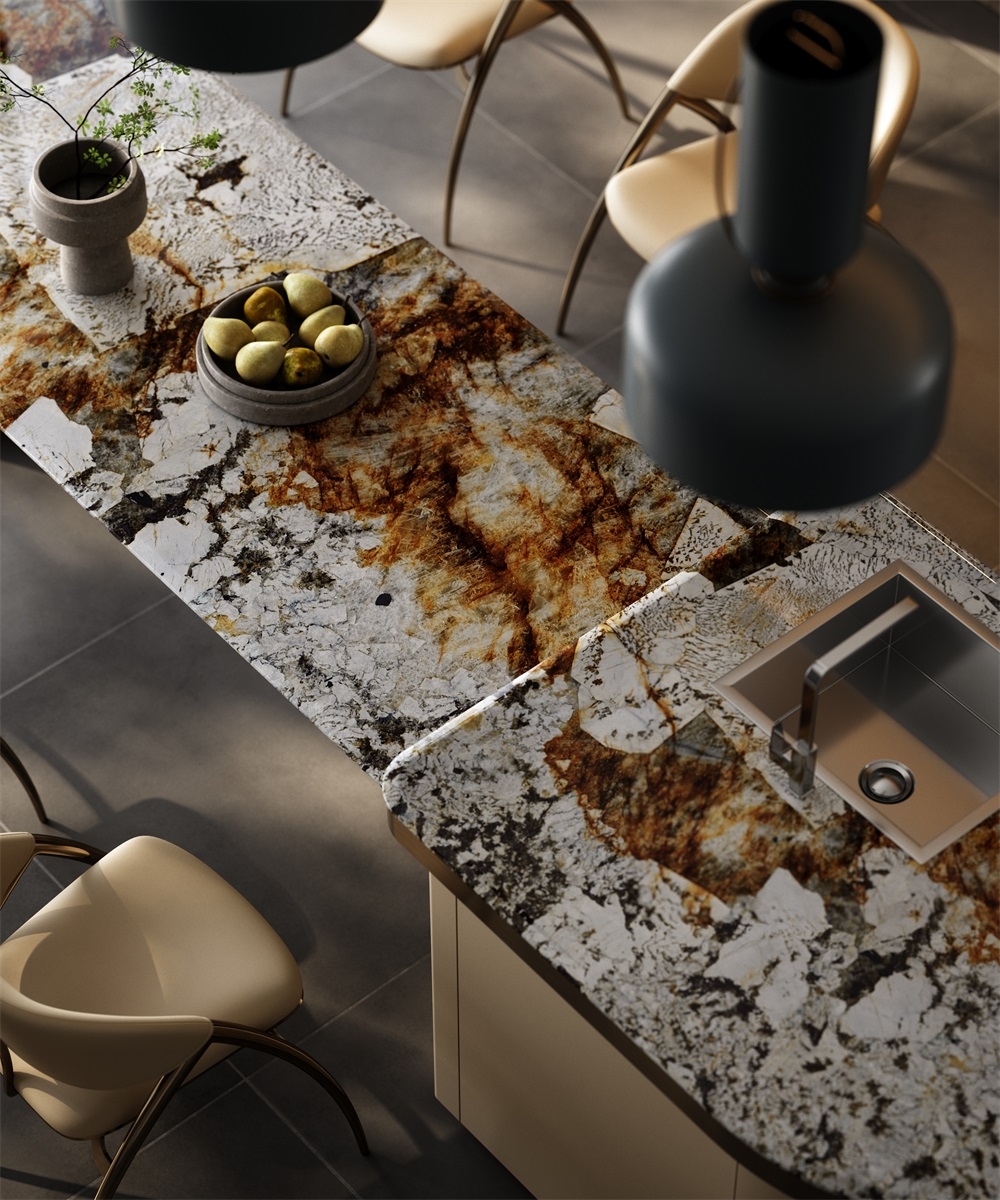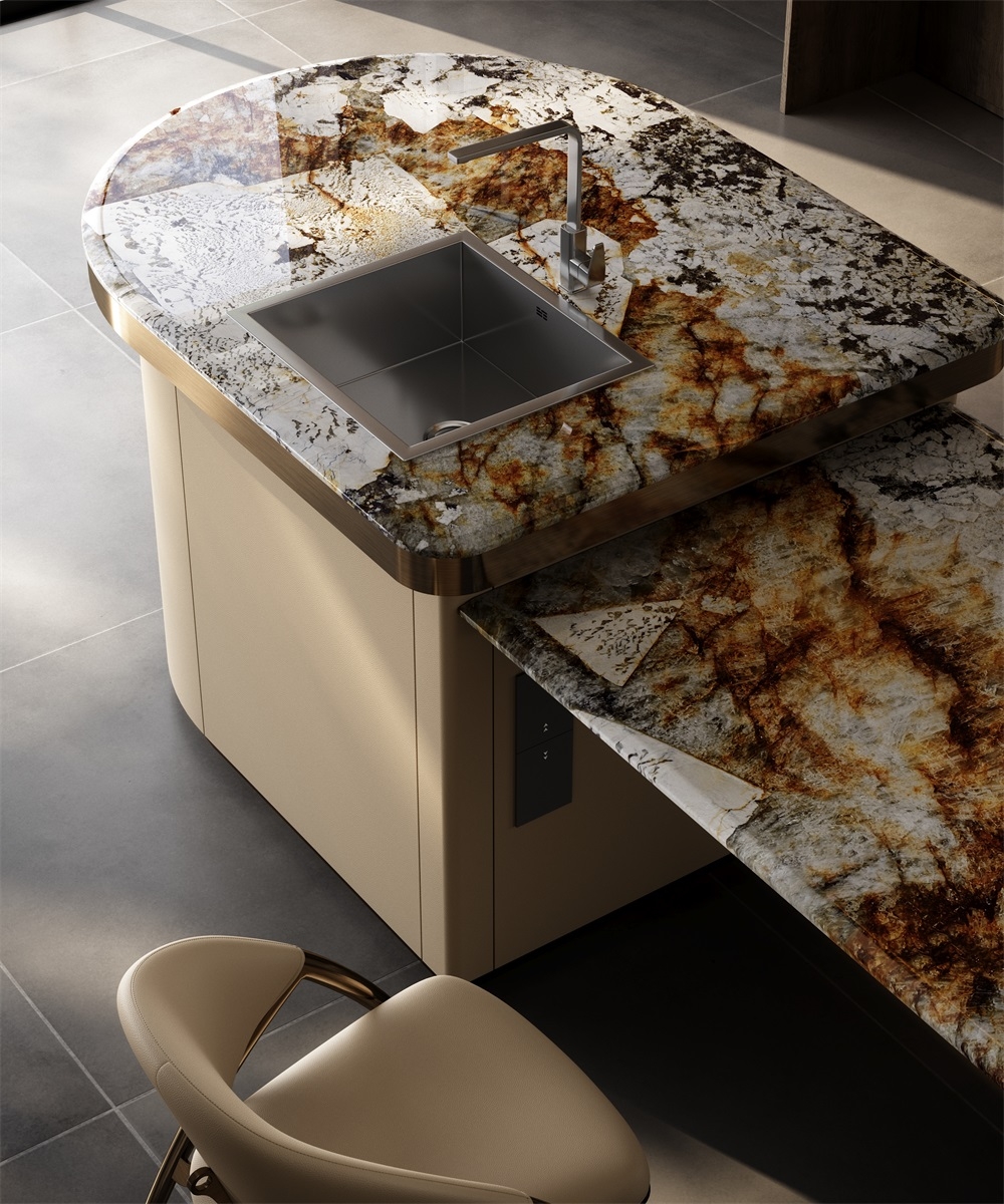 The countertop is made of natural rock slabs with a unique texture like an art painting. After fine grinding and anti-seepage treatment, it is wear-resistant, stain-resistant and has artistic tension. The metal special-shaped supports outline neat lines, and the leather storage cabinet provides a soft touch. The combination of the three weaves an artistic texture base for the space, injecting an elegant atmosphere into the dining and kitchen area.