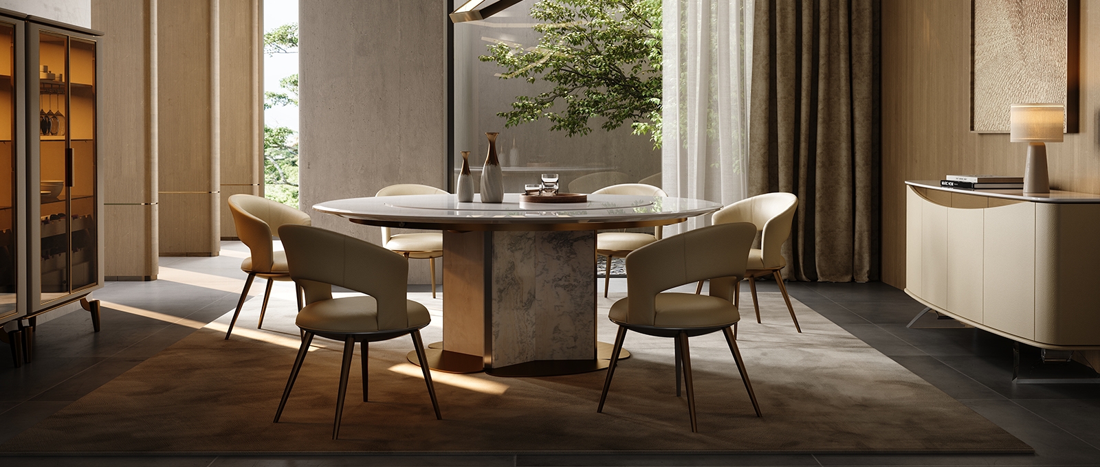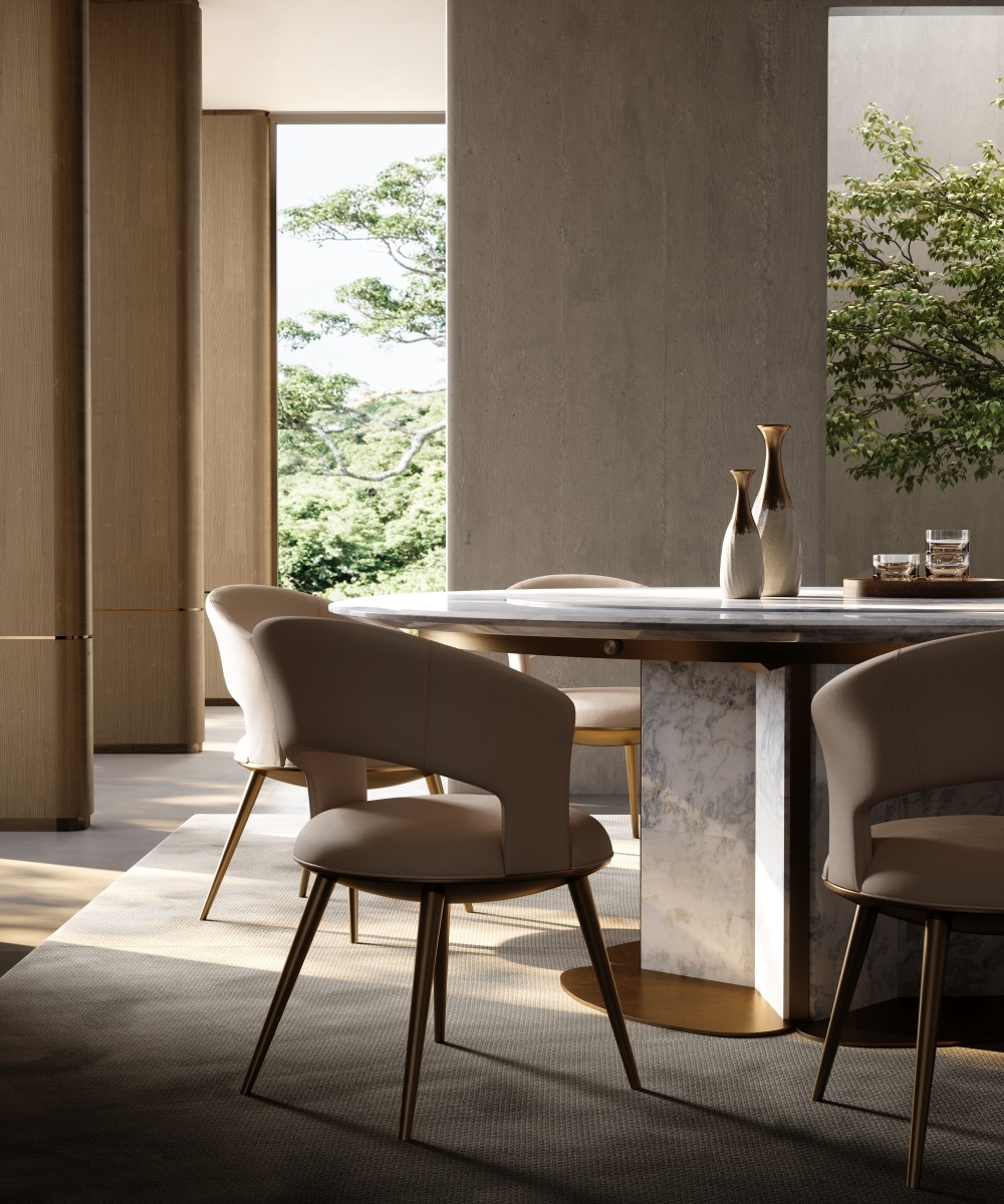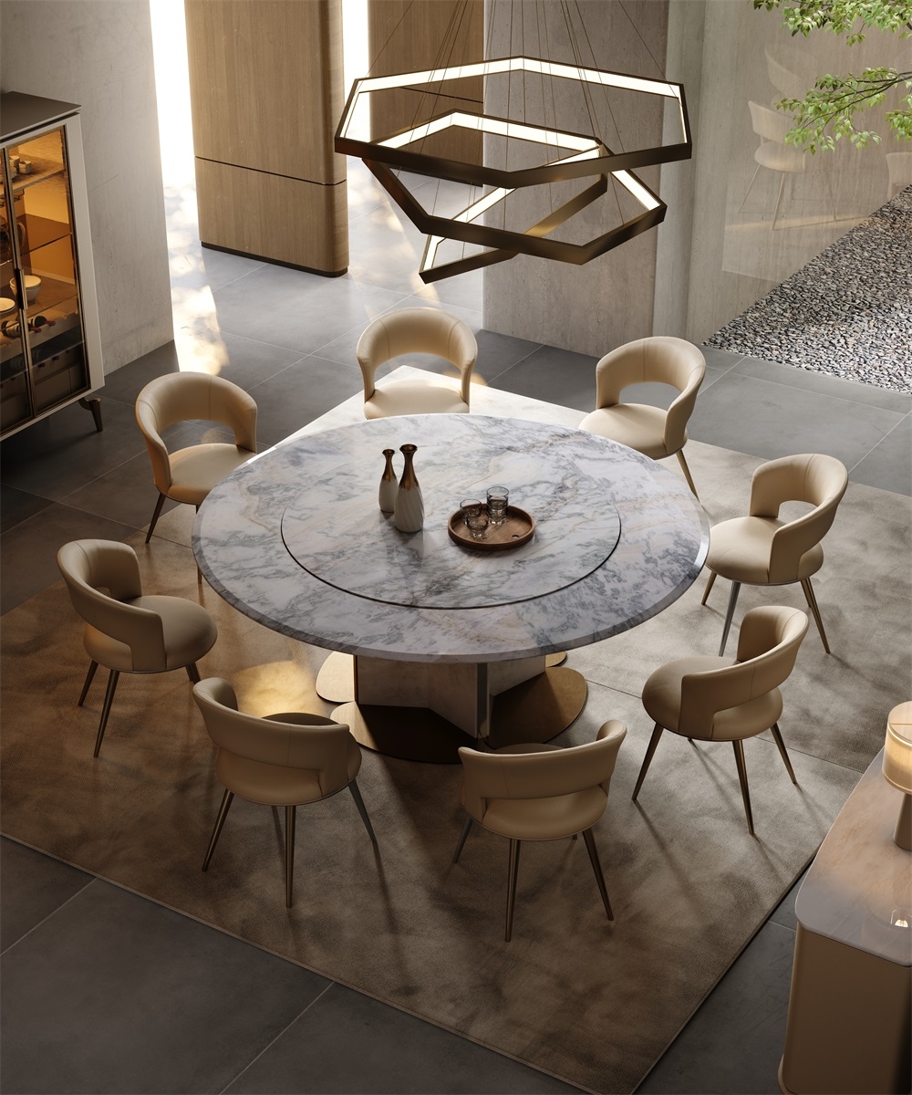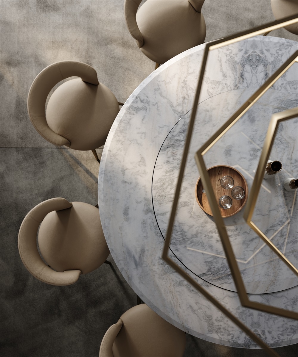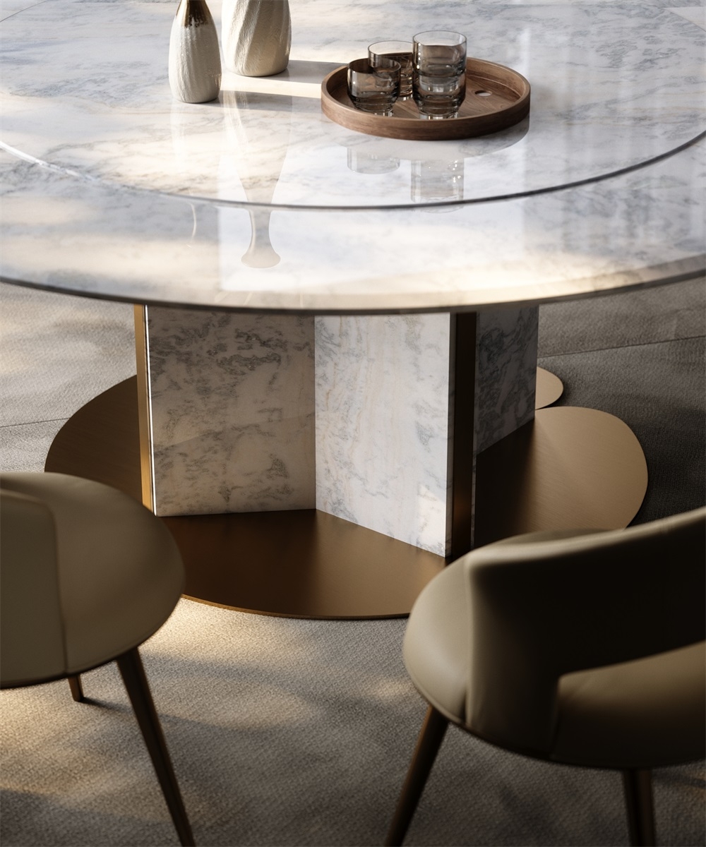 In a space that focuses on the social art atmosphere of home and practical dining needs, this dining table combines marble and metal materials with a petal-shaped metal base design, becoming the "social core" of the restaurant and living room, turning every meal and gathering into a pleasant experience blended with quality life.