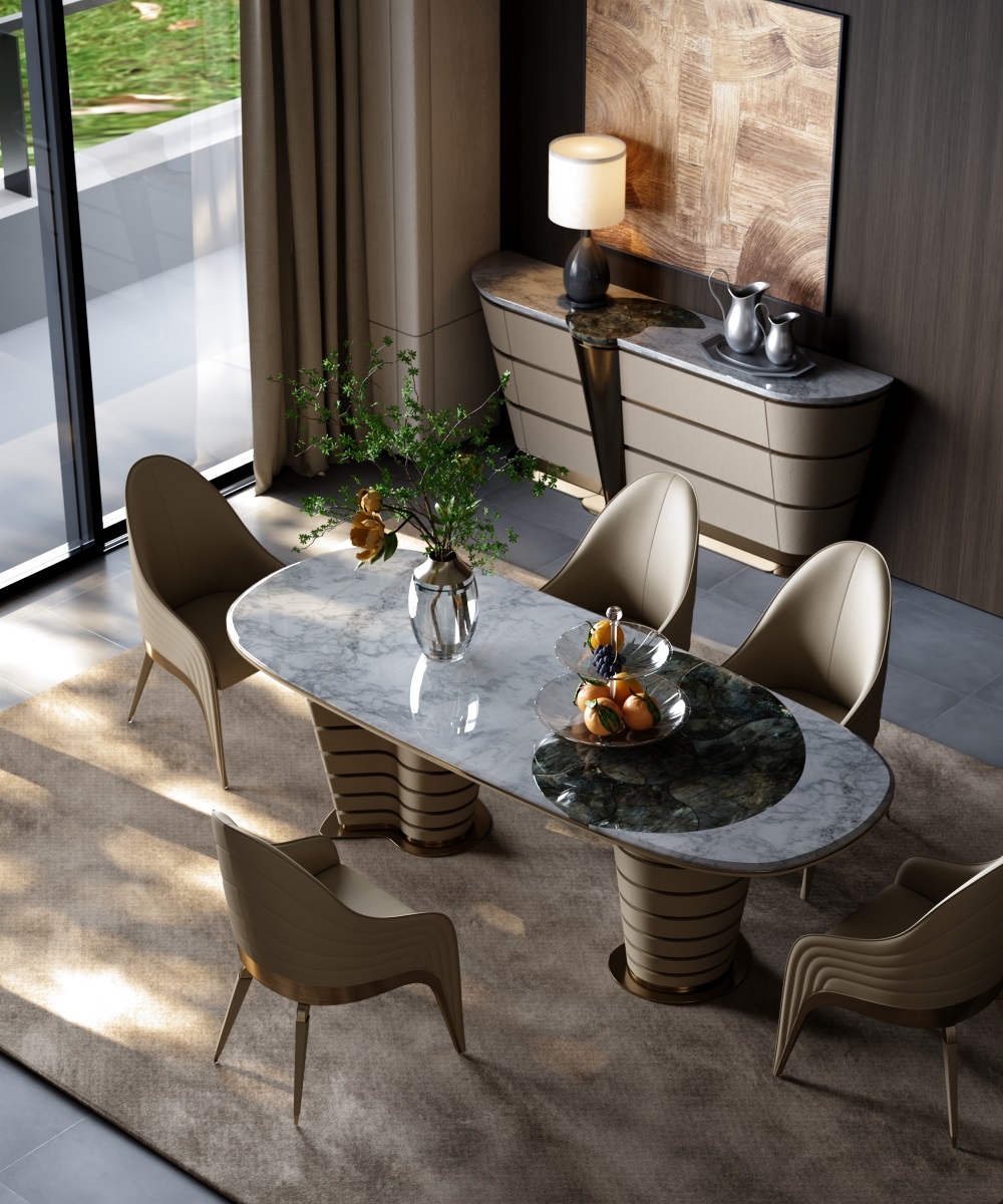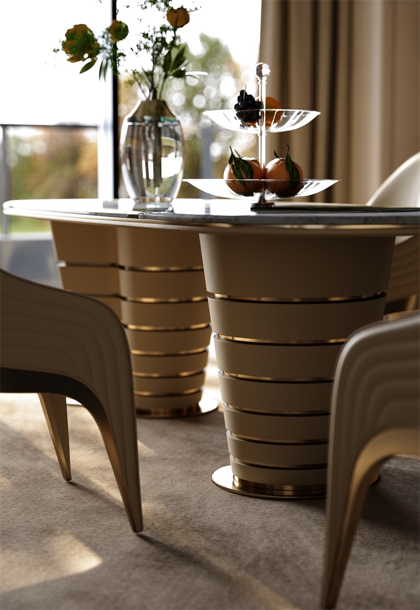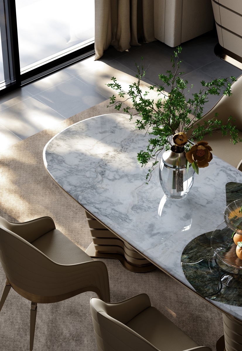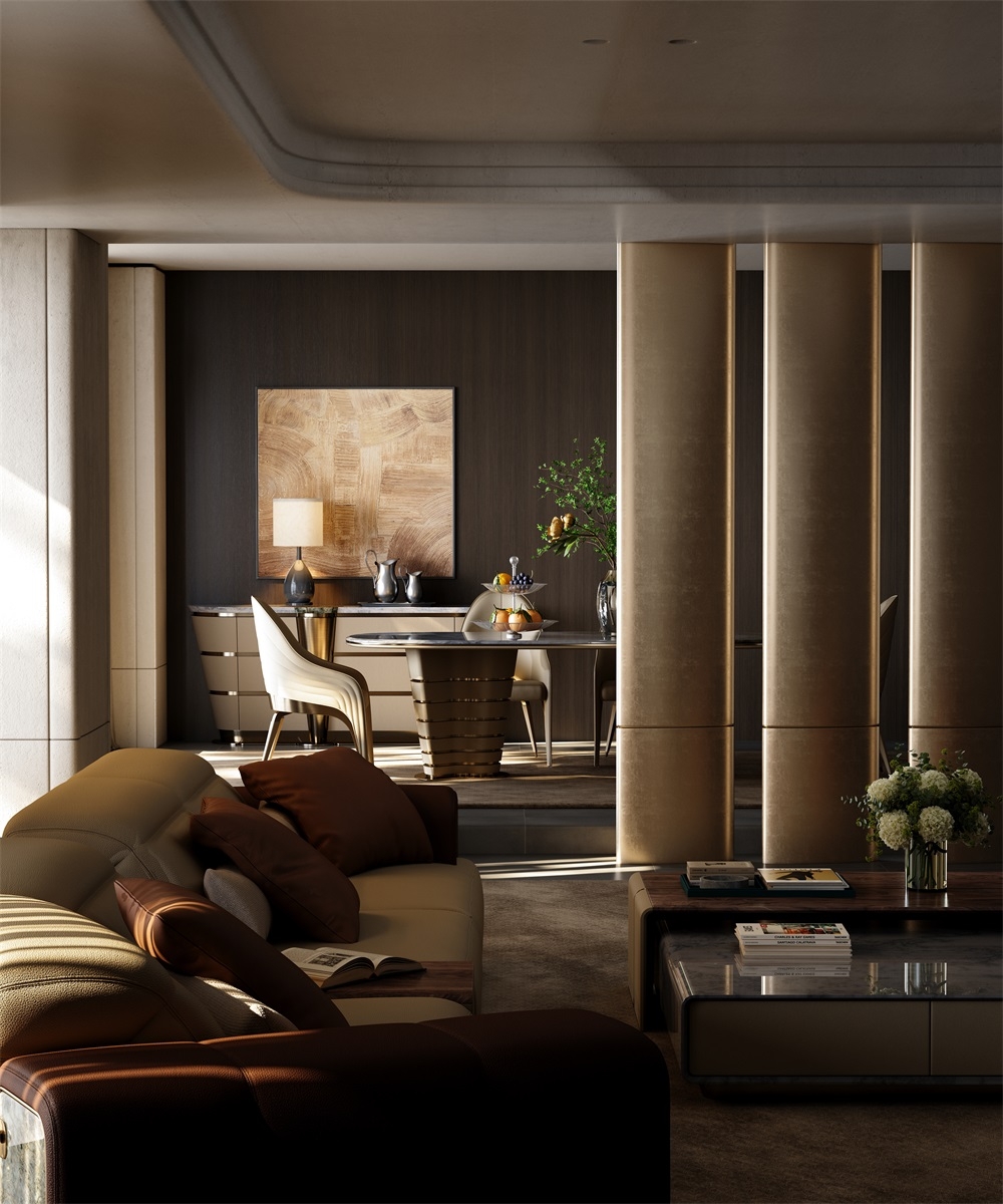 The countertop is made of natural rock slabs, with unique textures like art paintings. After high-temperature calcination + anti-seepage treatment, it is wear-resistant and stain-resistant with high-quality tension. The base is made of leather + metal. The warm texture of leather and the tough luster of metal are intertwined with the natural texture of rock slabs. The three are integrated to weave a high-quality texture base for the space, injecting an artistic atmosphere into the social area.