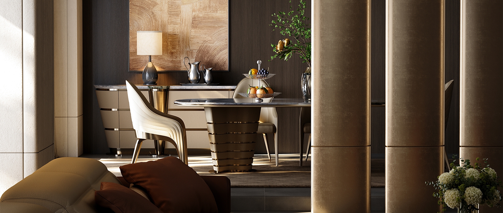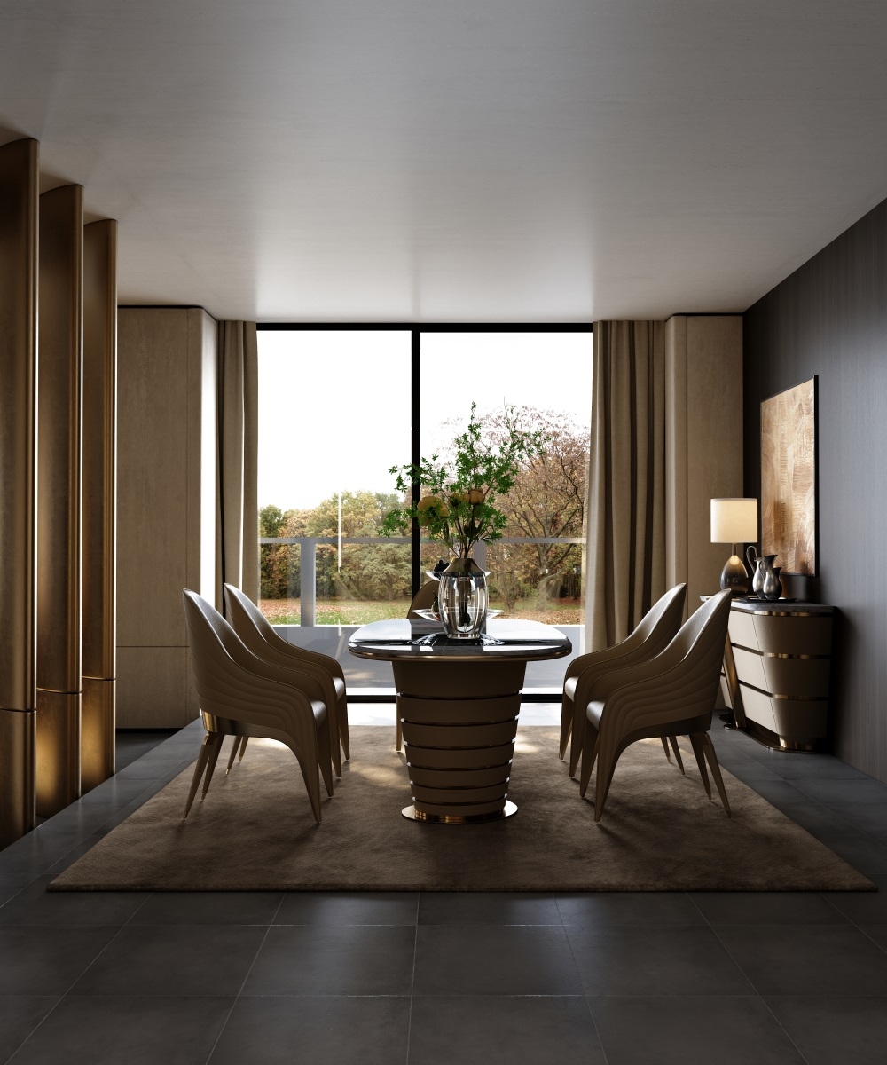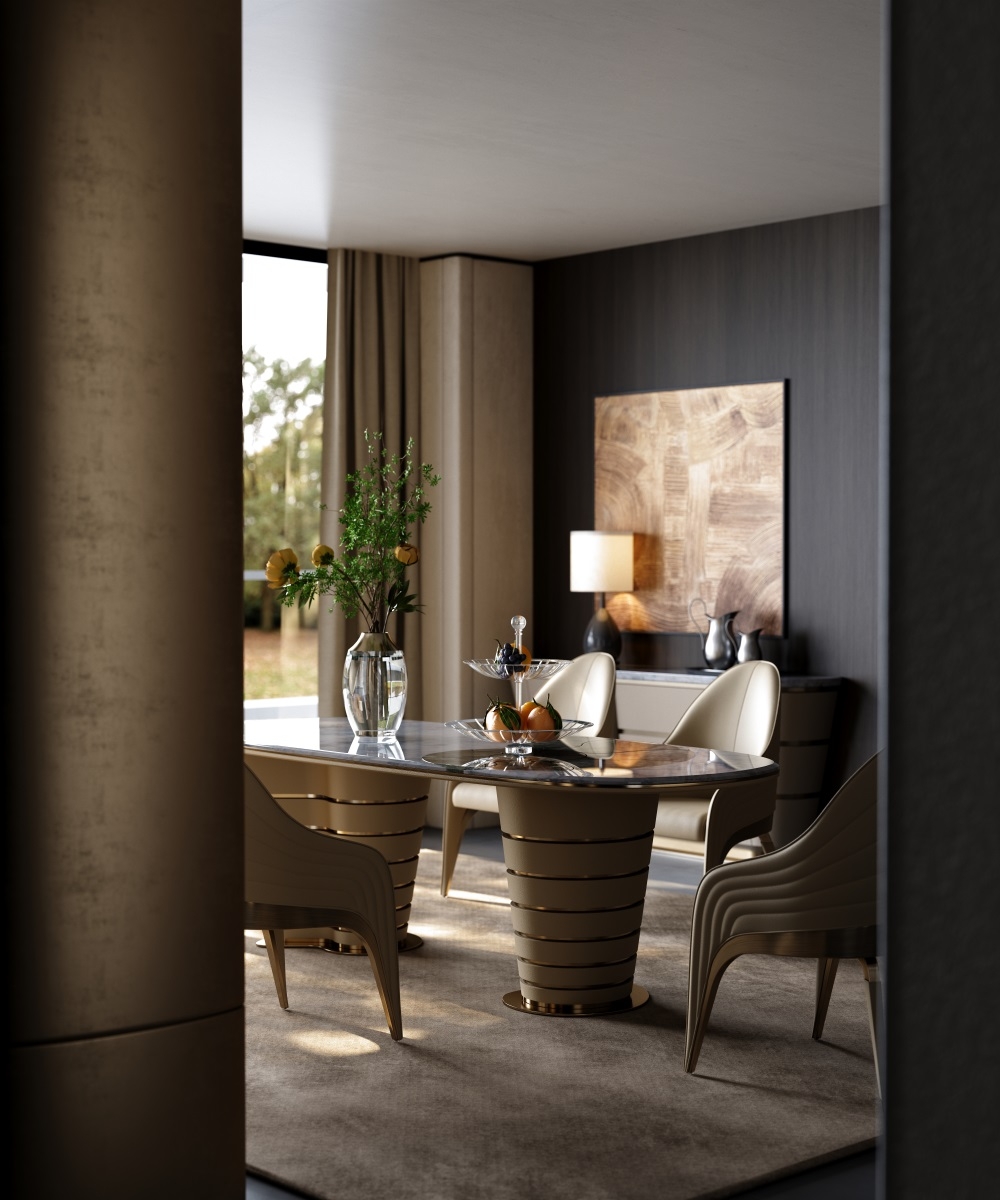 The countertop is made of natural rock slabs, with unique textures like art paintings. After high-temperature calcination + anti-seepage treatment, it is wear-resistant and stain-resistant with high-quality tension. The base is made of leather + metal. The warm texture of leather and the tough luster of metal are intertwined with the natural texture of rock slabs. The three are integrated to weave a high-quality texture base for the space, injecting an artistic atmosphere into the social area.