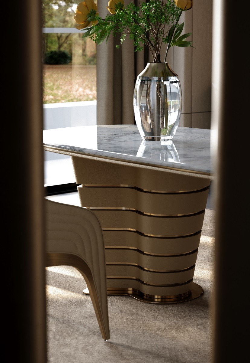 The conch made of pure luxury stone is completely embedded in the luxury stone countertop through the mosaic process, seamless and natural. At the same time, the base uses metal and leather to layer the spiral and graceful conch outline, symbolizing the progressive development of people.