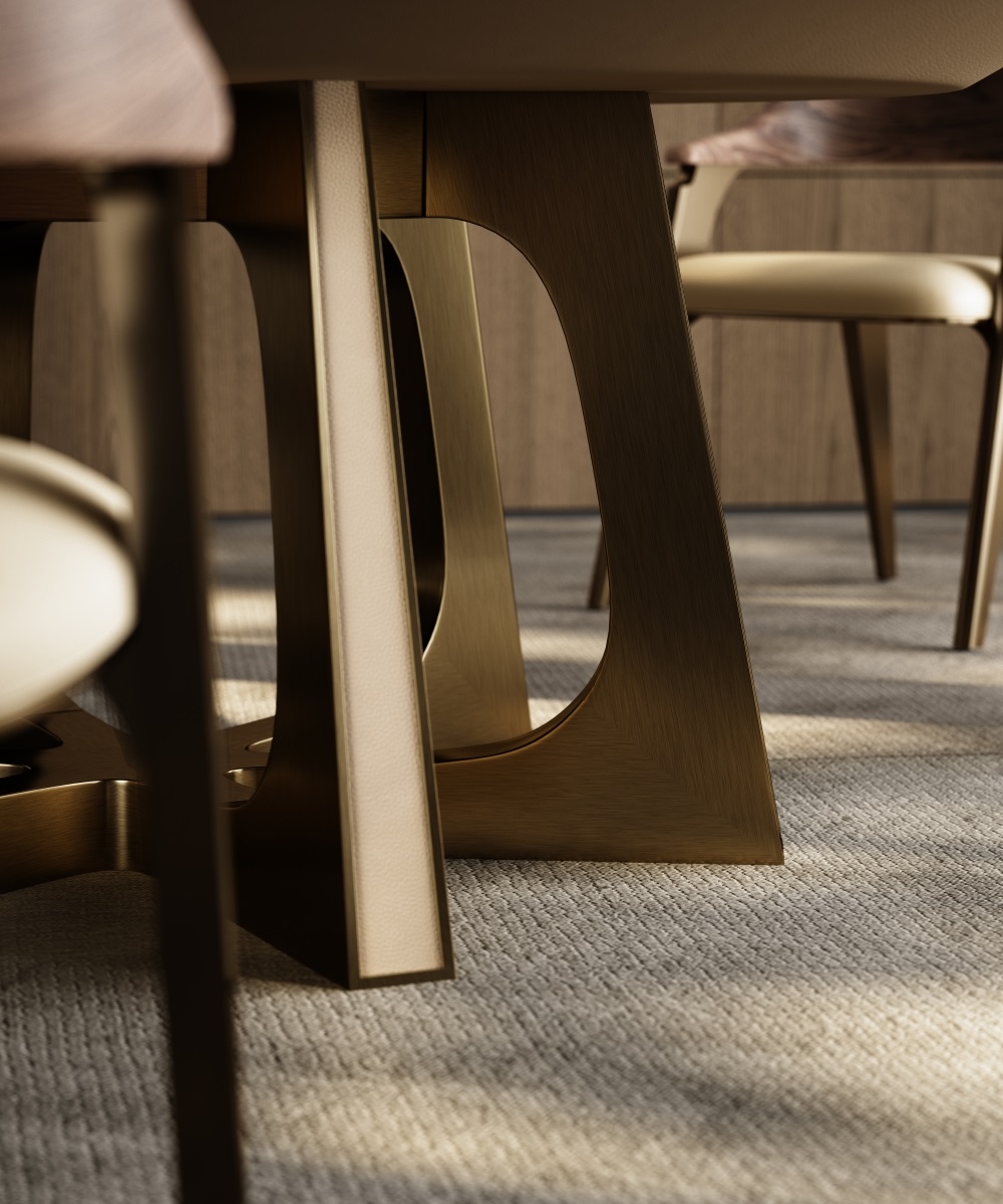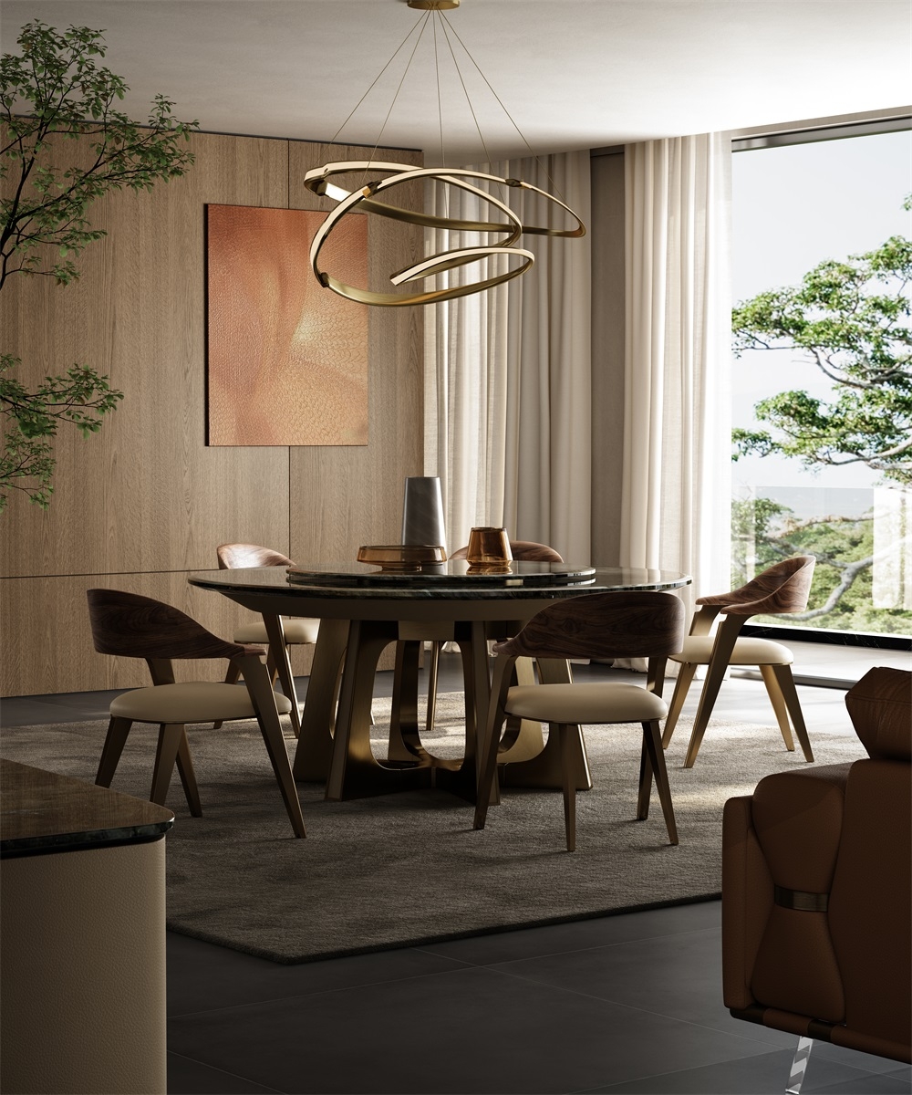 Marble tabletop + petal metal legs + artistic storage design, breaking the traditional dining table form. The marble tabletop supports dining and tasting scenes, and the artistic ornaments create an atmosphere; the petal metal legs provide stable support, visually light and agile, allowing the social area to bid farewell to stereotypes and return to a free and pleasant gathering place, achieving a balance between beauty and stability.