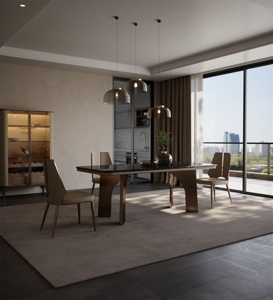 Solid wood tabletop + curved solid wood legs + artistic ceramic design, breaking the stereotyped dining table form. The solid wood tabletop supports dining and tasting scenes, and the ceramic ornaments create an atmosphere; the curved solid wood legs provide stable support, visually light and agile, allowing the social area to bid farewell to stereotypes and return to a free and pleasant gathering space, achieving a balance between beauty and stability.