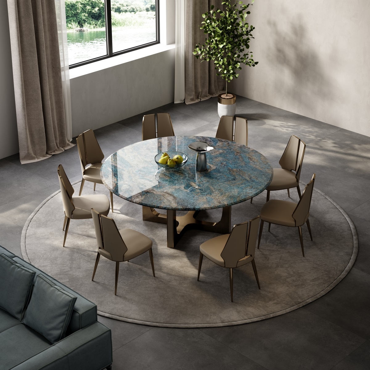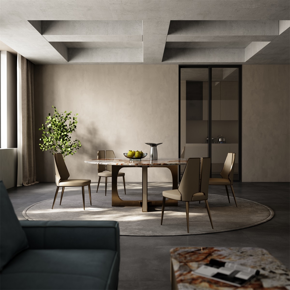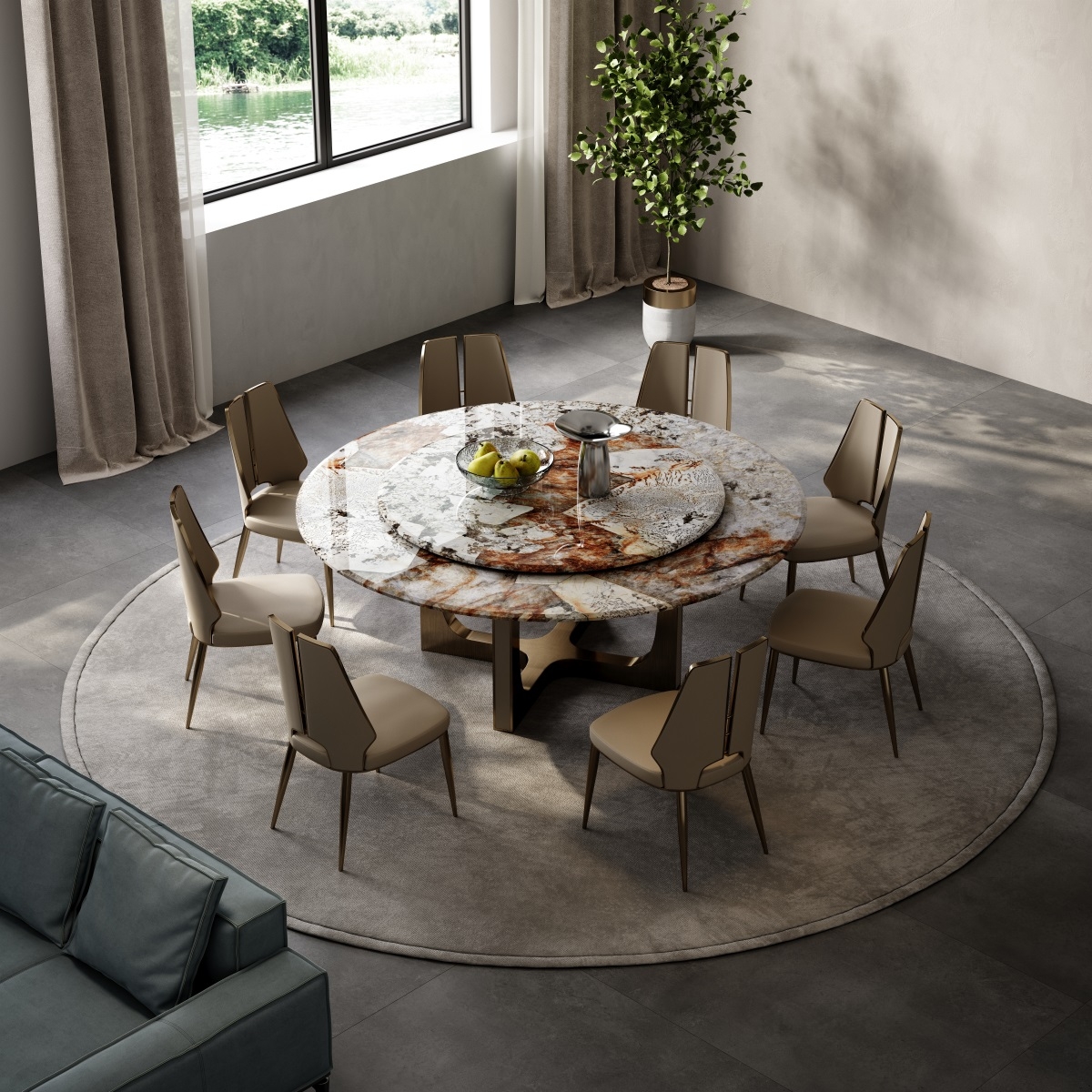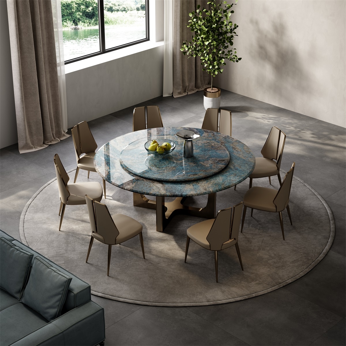 The simple square supporting structure contrasts with the round table, reflecting the oriental design concept of the round sky and square earth. Through modern minimalist design techniques, it shows the exquisite dining table aesthetics pursued by contemporary people.