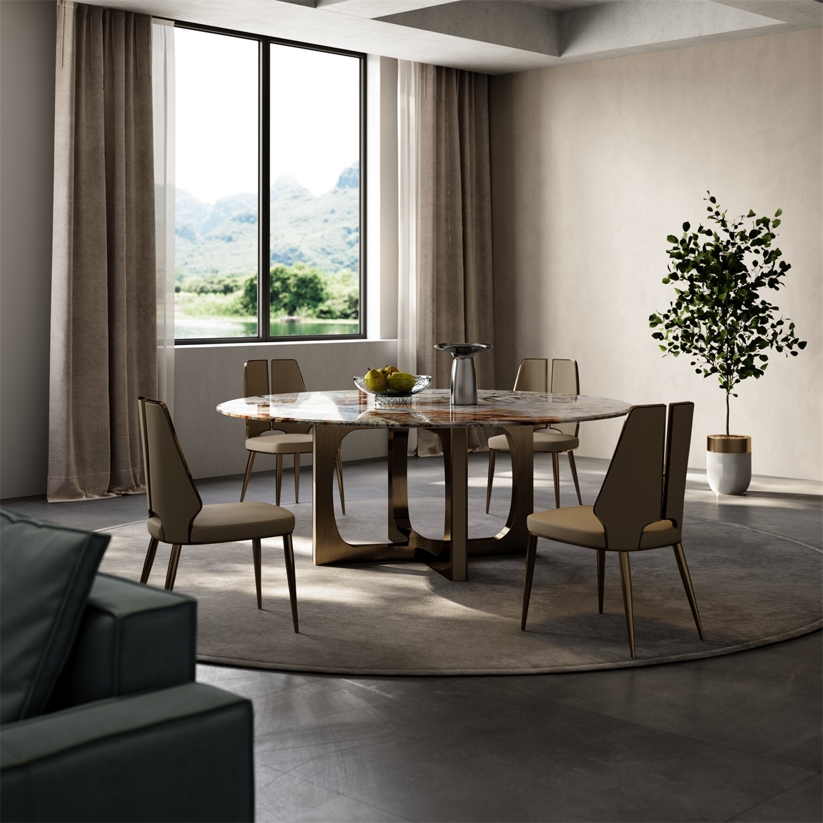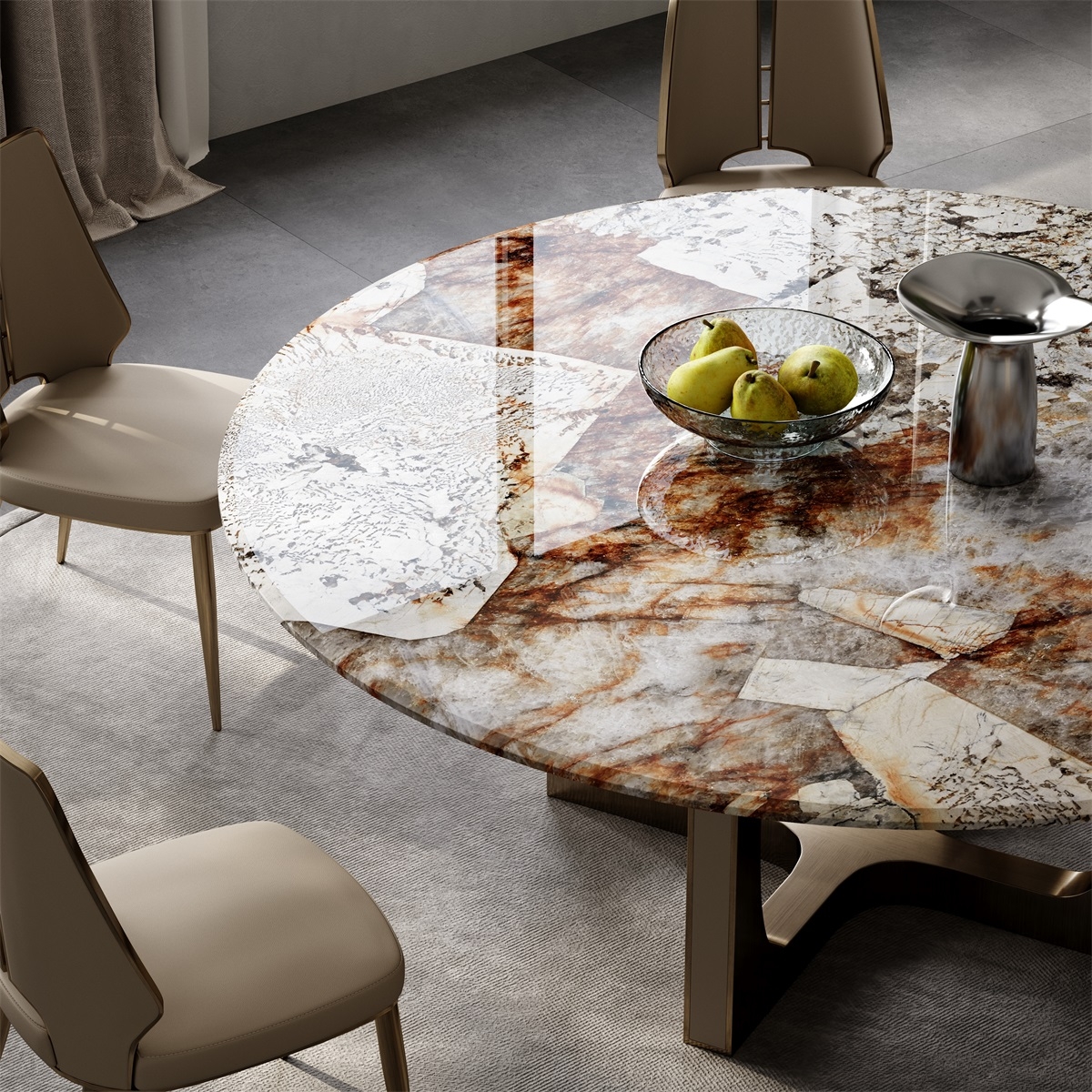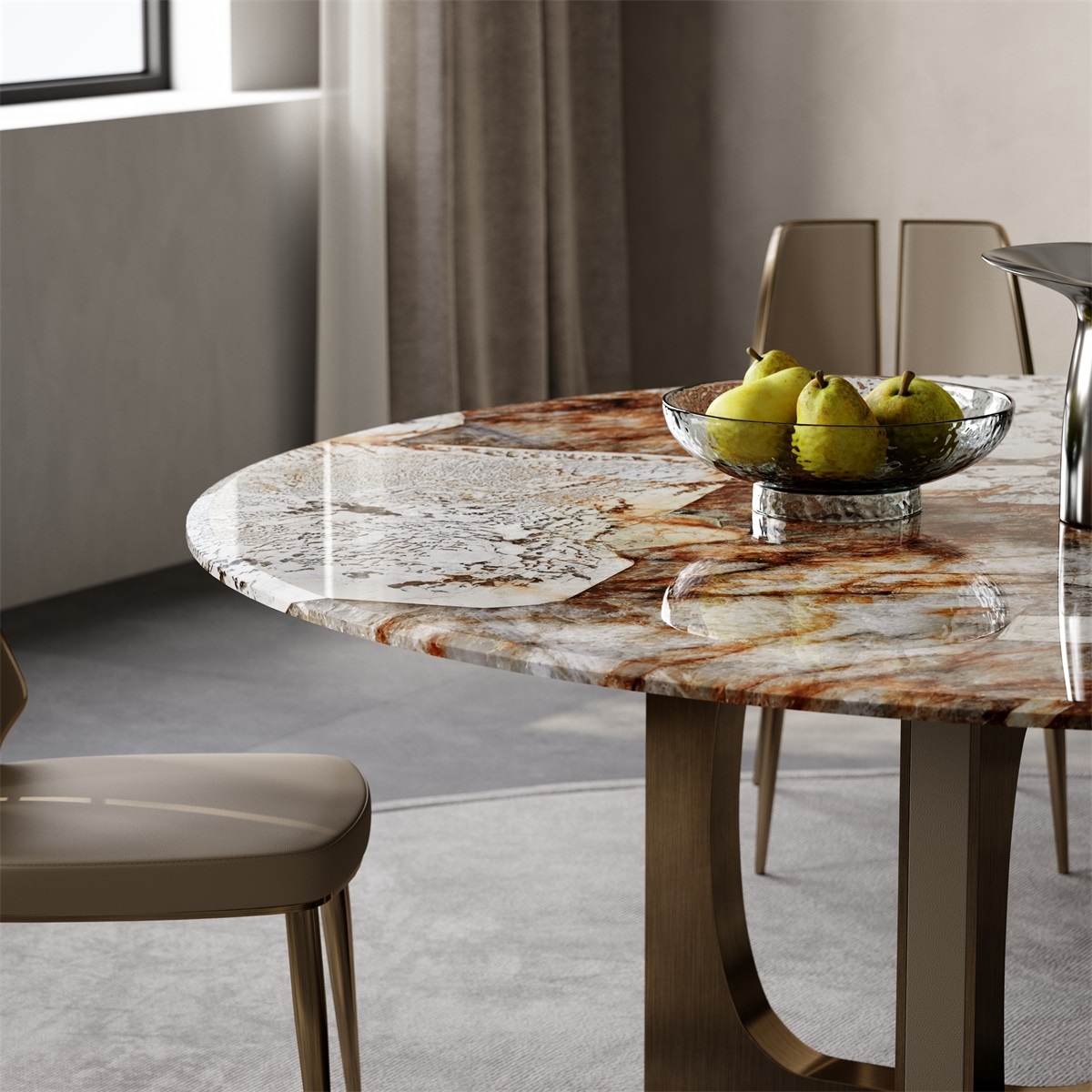 The countertop is made of natural rock slabs with a unique texture like an art painting. After high-temperature calcination and anti-seepage treatment, it is wear-resistant, stain-resistant and has its own high-level tension. The base is made of metal, with hard lines and warm luster interwoven, and matched with the color embellishment of art ornaments.