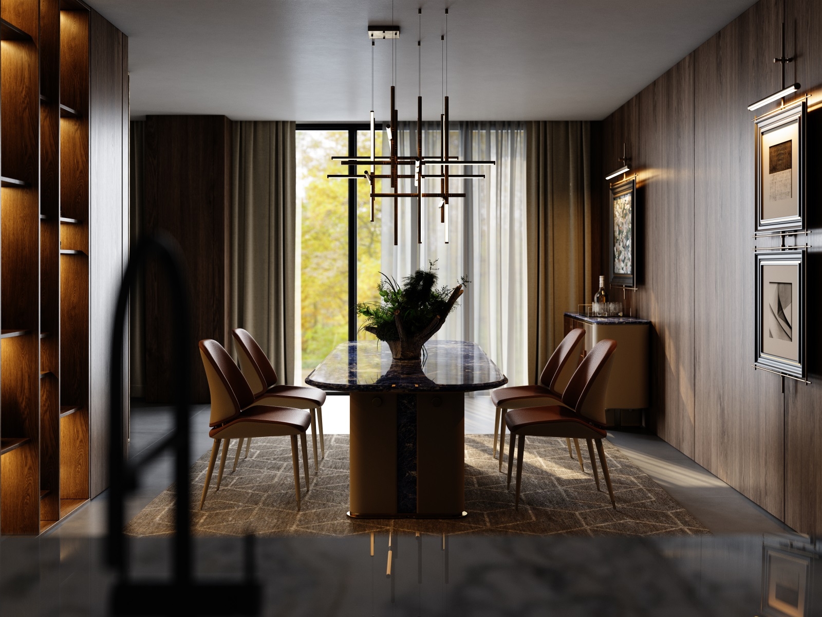 The product creates a strong sense of space with clean, generous lines. Its linear metal structure stands