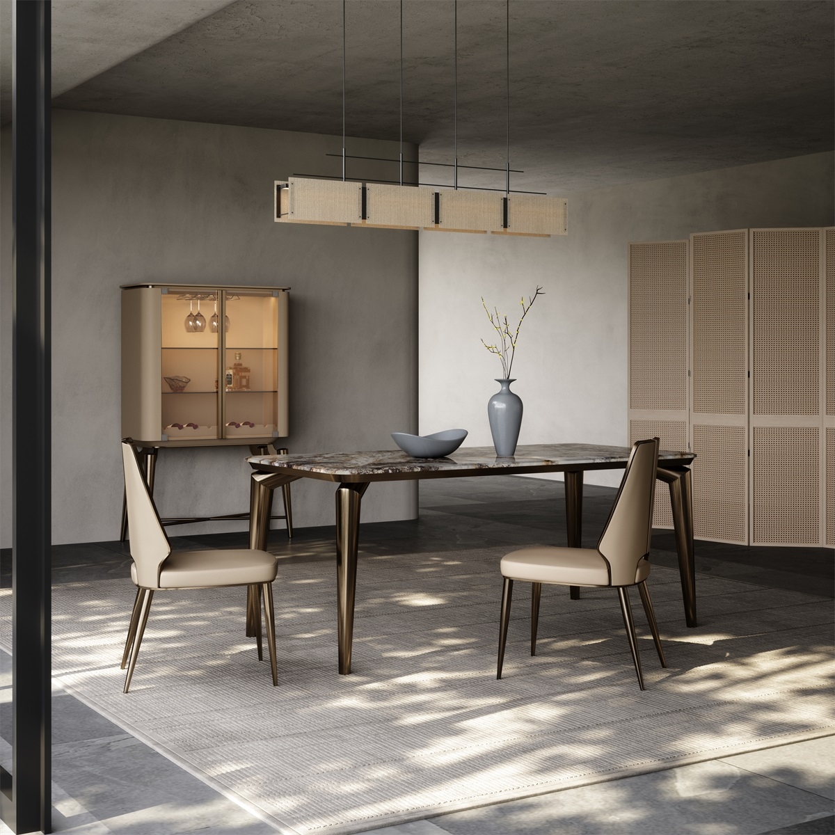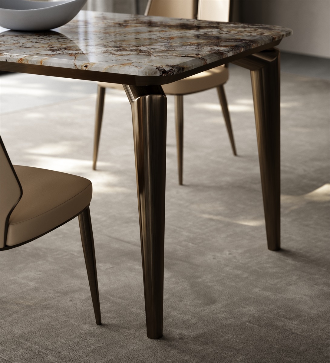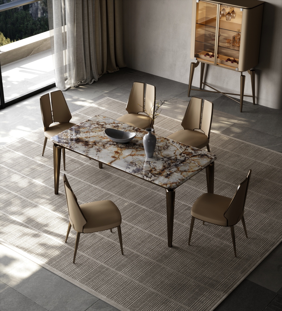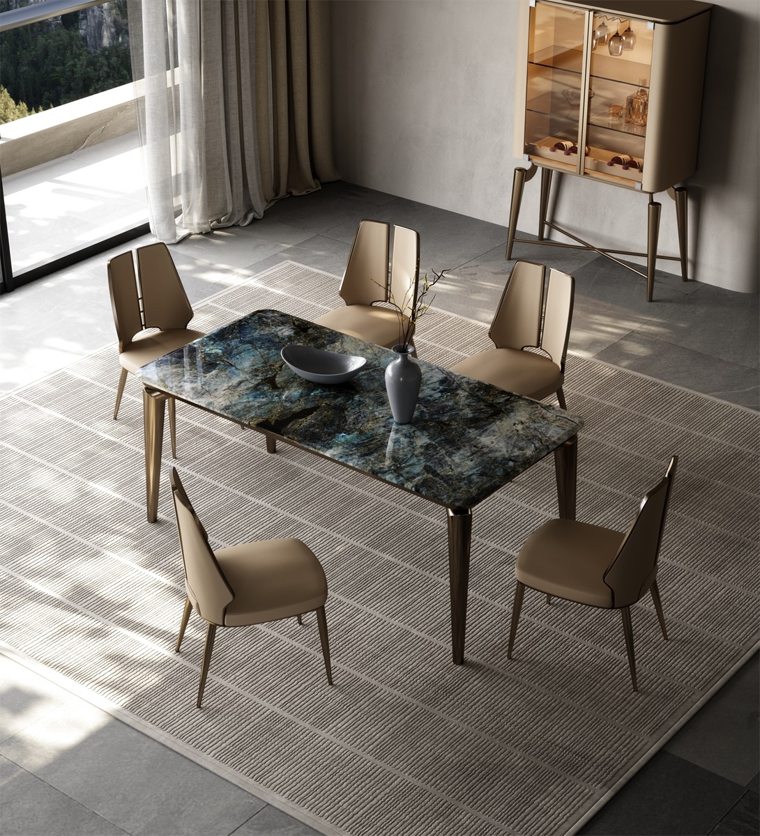Marble tabletop + geometric metal legs + artistic storage design, breaking the traditional dining table form. The marble tabletop supports dining and tasting scenes, and the artistic ornaments create an atmosphere; the geometric metal legs provide stable support, visually light and agile, allowing the social area to bid farewell to stereotypes and return to a free and pleasant gathering place, achieving a balance between beauty and stability.
