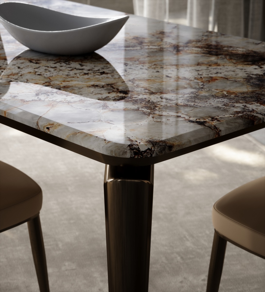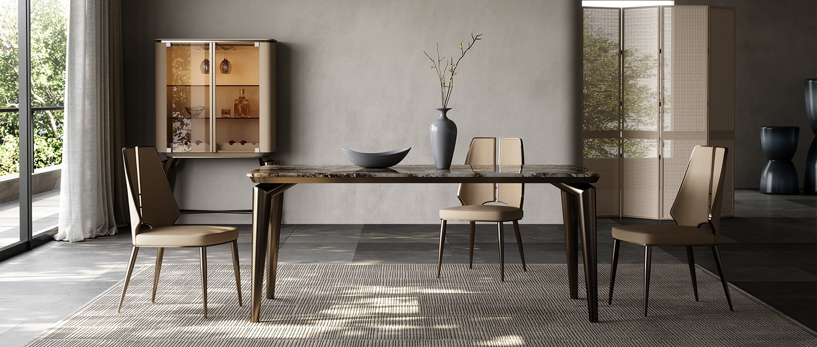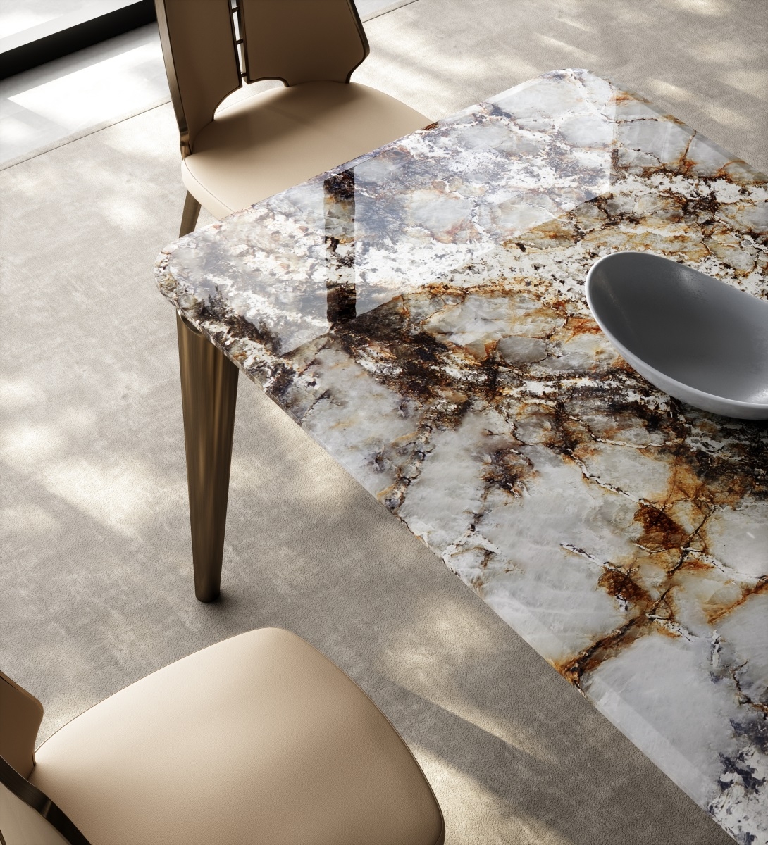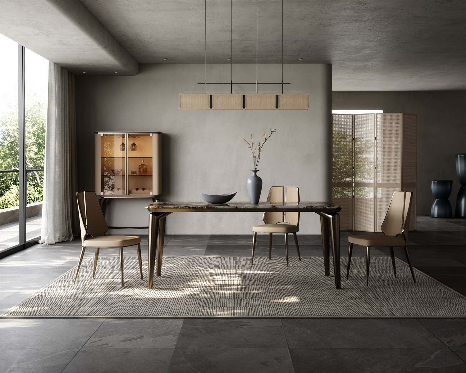 Marble tabletop + geometric metal legs + artistic storage design, breaking the traditional dining table form. The marble tabletop supports dining and tasting scenes, and the artistic ornaments create an atmosphere; the geometric metal legs provide stable support, visually light and agile, allowing the social area to bid farewell to stereotypes and return to a free and pleasant gathering place, achieving a balance between beauty and stability.