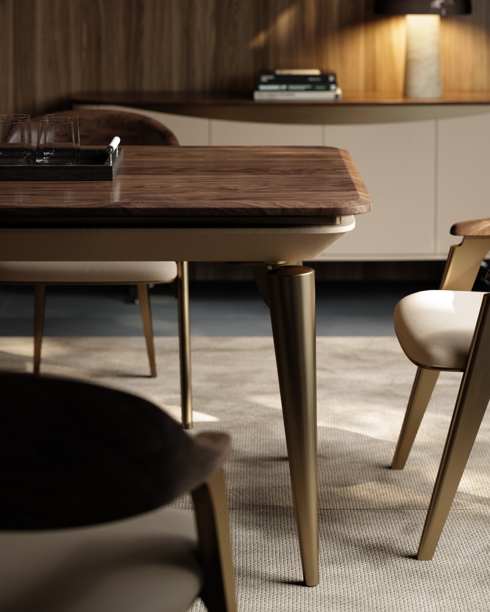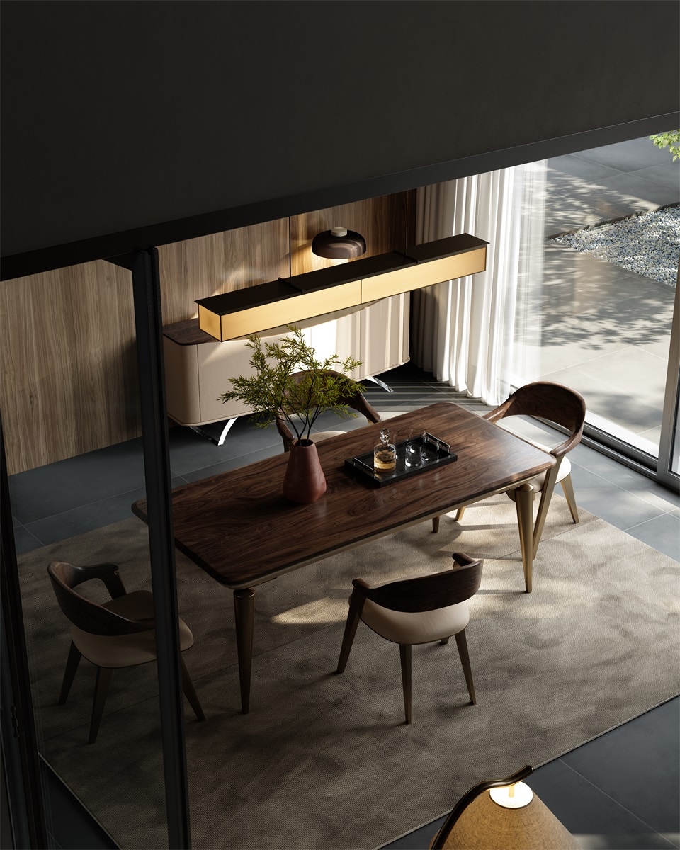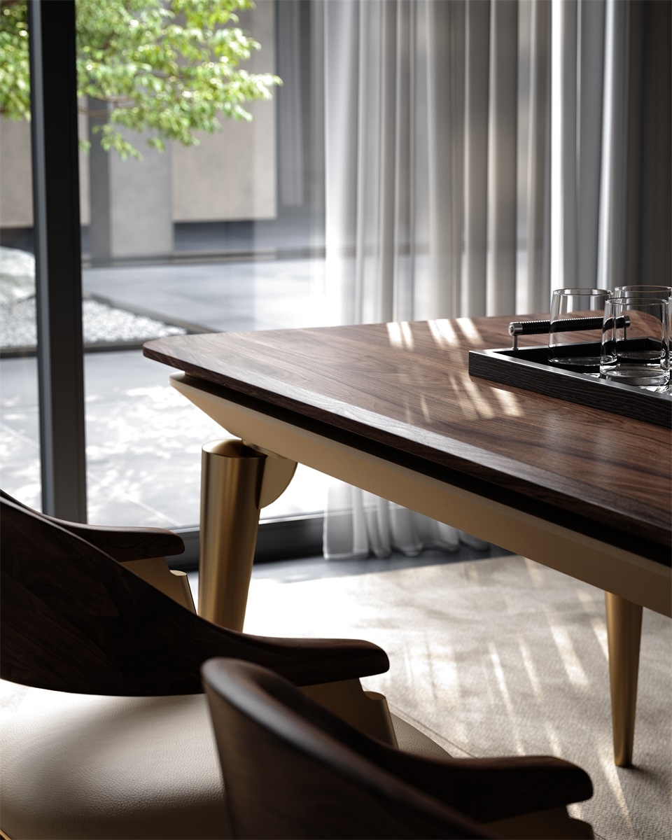 The table top is made of solid wood, and its warm texture conveys natural warmth; the tapered metal legs outline neat lines, and the leather edging adds a soft touch. The combination of the three weaves a light luxury texture base for the space, injecting an elegant atmosphere into the social area.