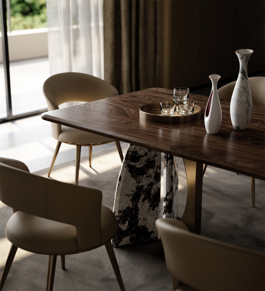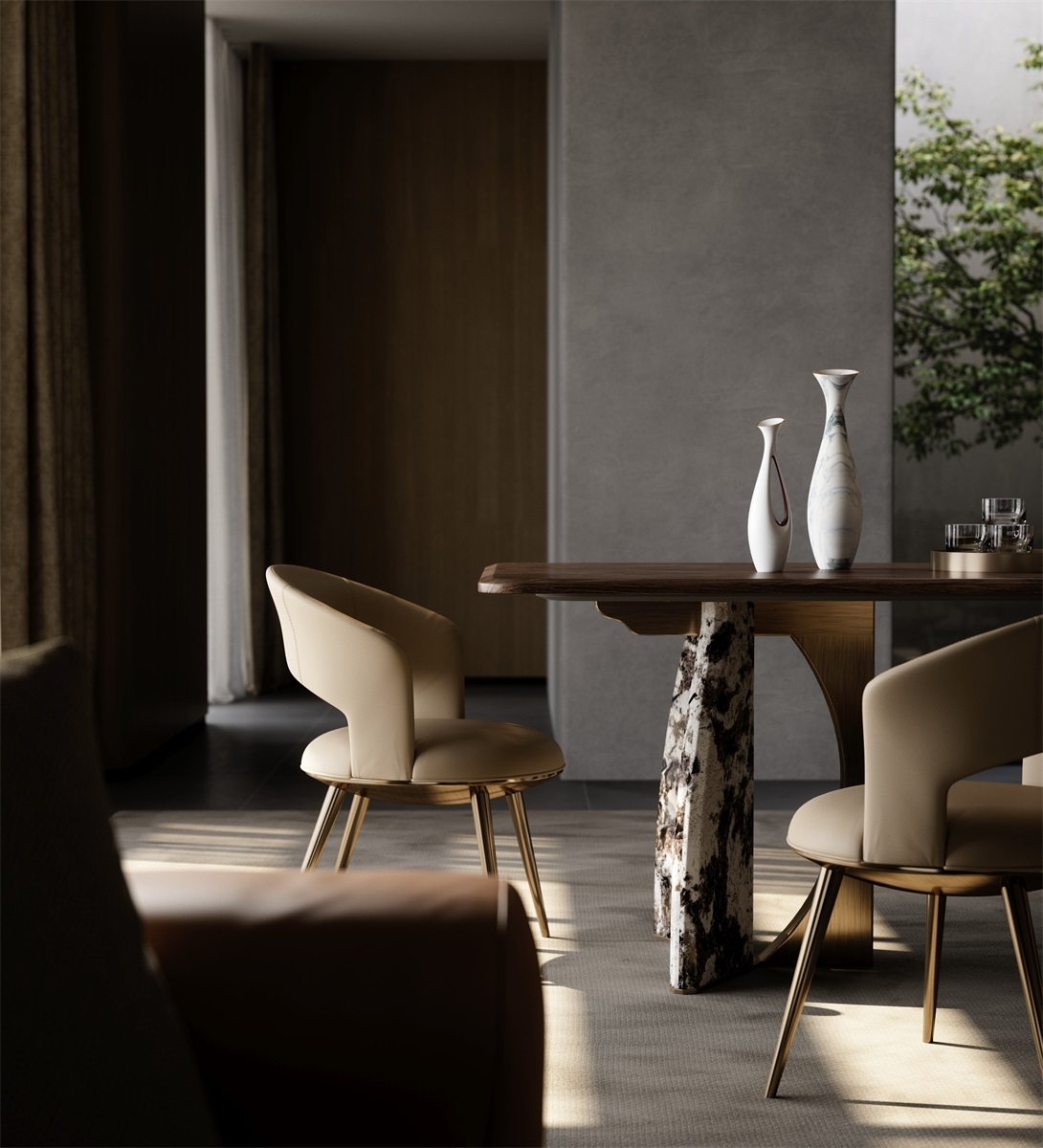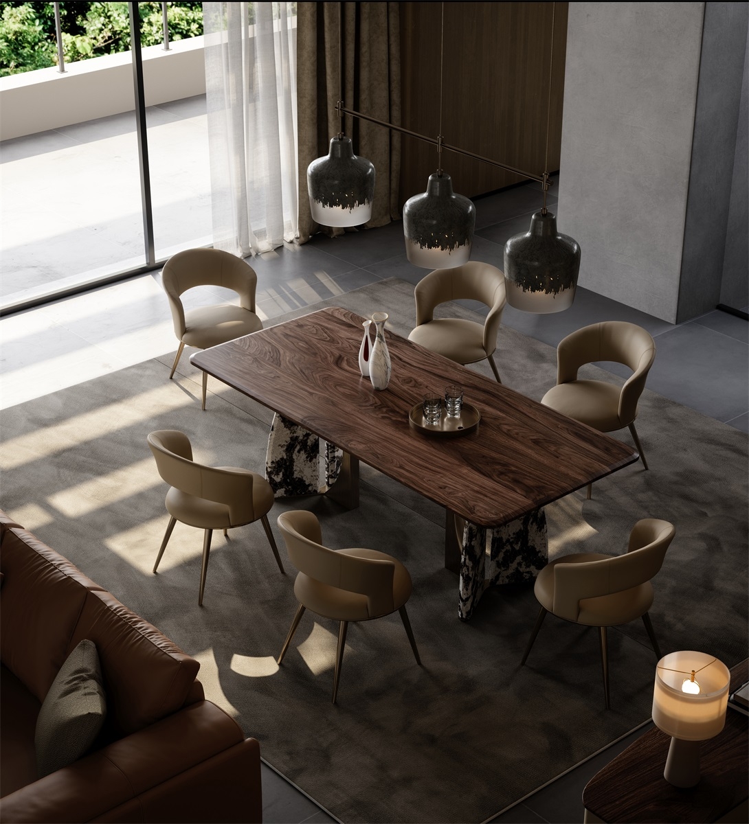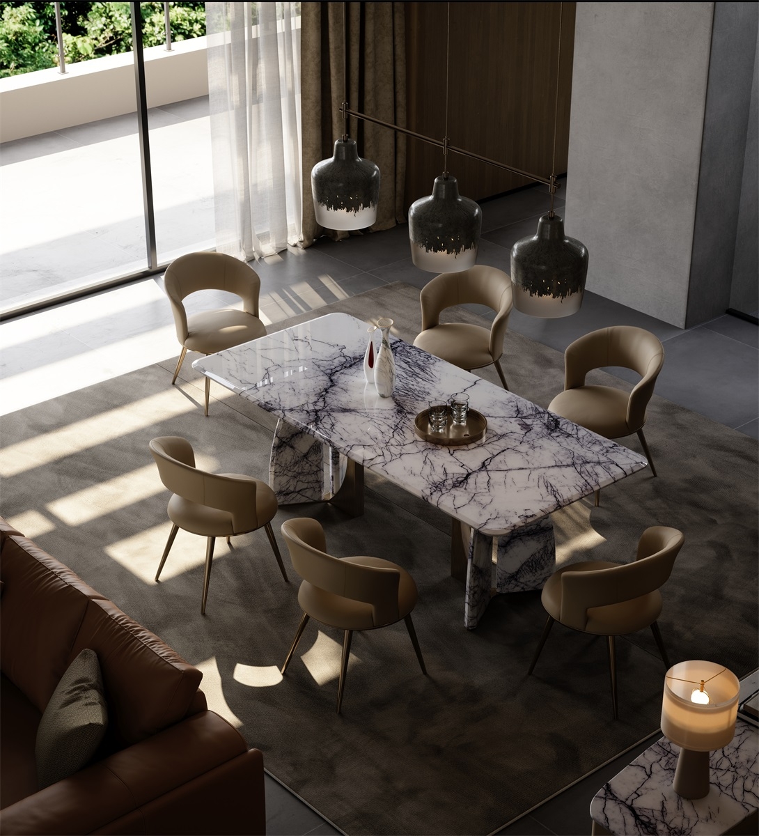 The simple shape of the rock slab table and curved metal legs breaks the stereotype of traditional dining tables. The spacious rock slab table meets the dining needs of multiple people and can easily accommodate food and laughter; the curved metal legs not only provide stable support, but also create a sense of lightness visually, allowing the social dining space to say goodbye to crampedness and show openness and freedom.