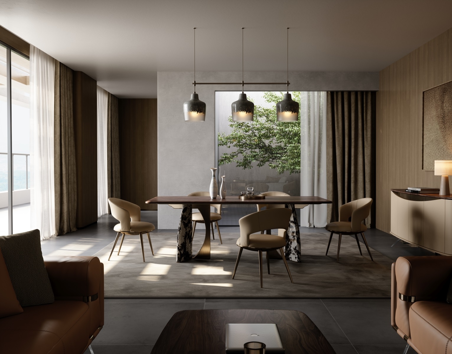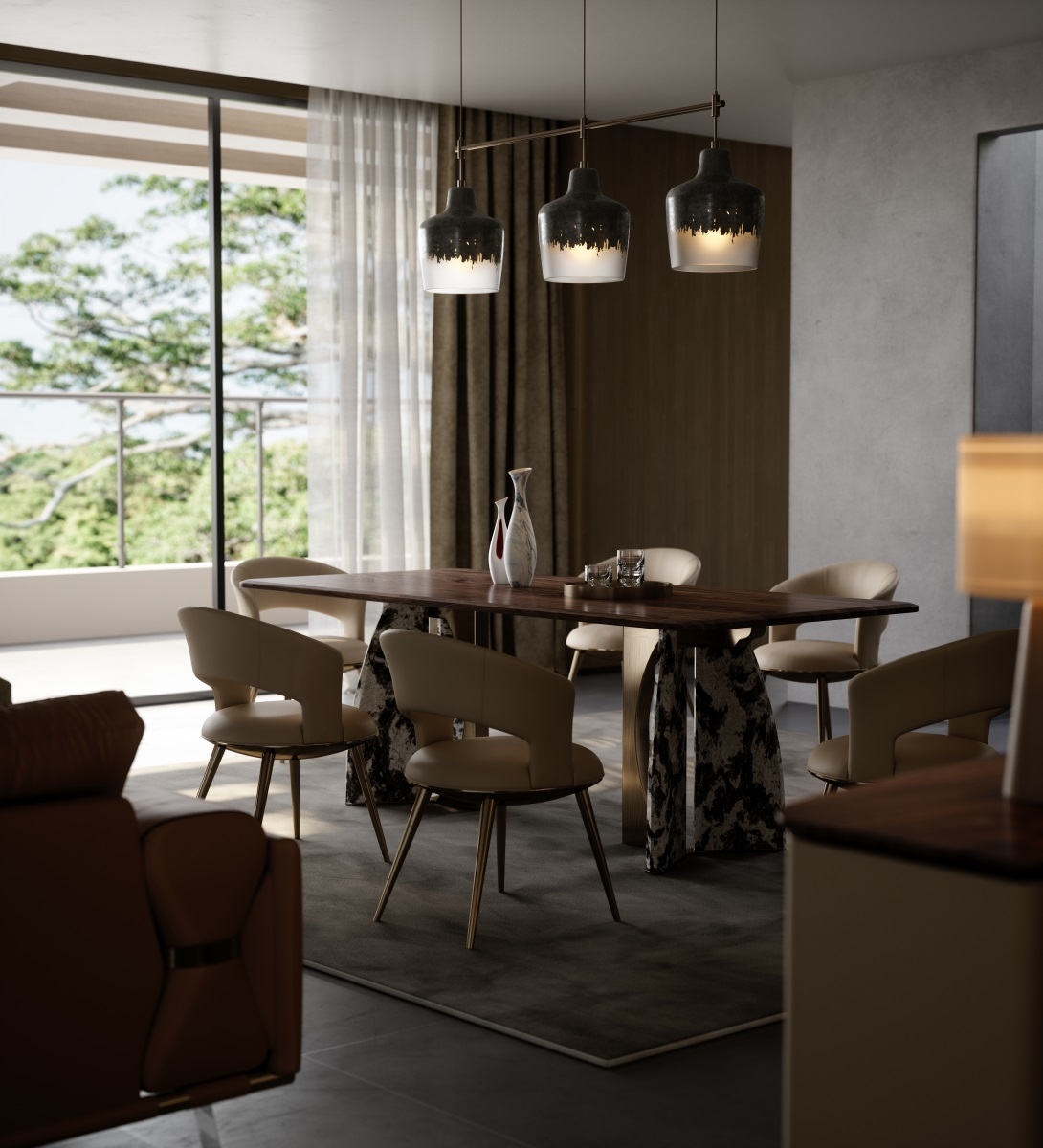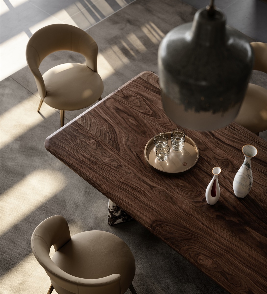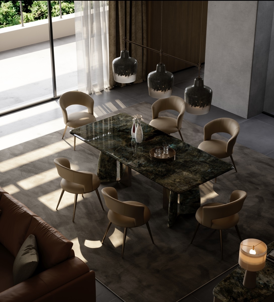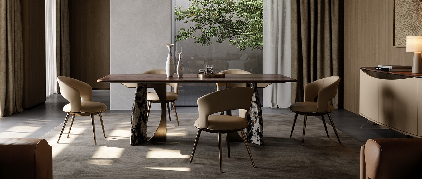 The simple shape of the rock slab table and curved metal legs breaks the stereotype of traditional dining tables. The spacious rock slab table meets the dining needs of multiple people and can easily accommodate food and laughter; the curved metal legs not only provide stable support, but also create a sense of lightness visually, allowing the social dining space to say goodbye to crampedness and show openness and freedom.