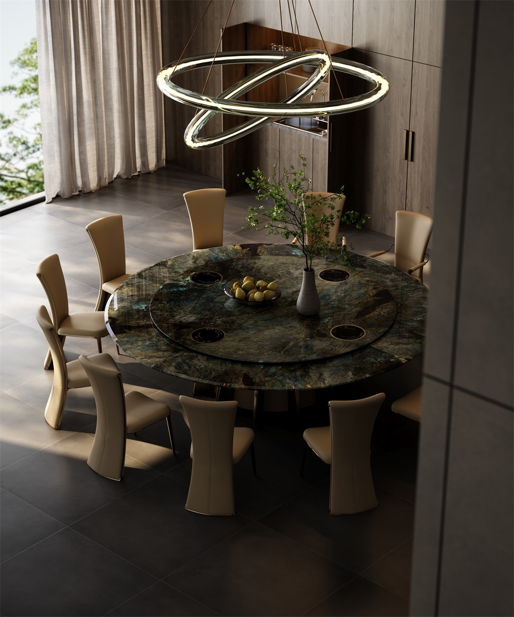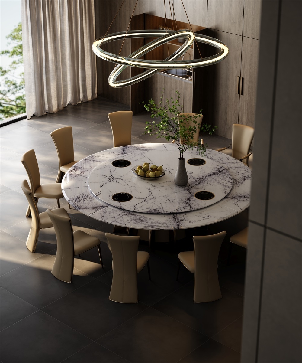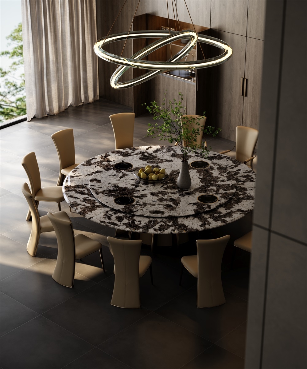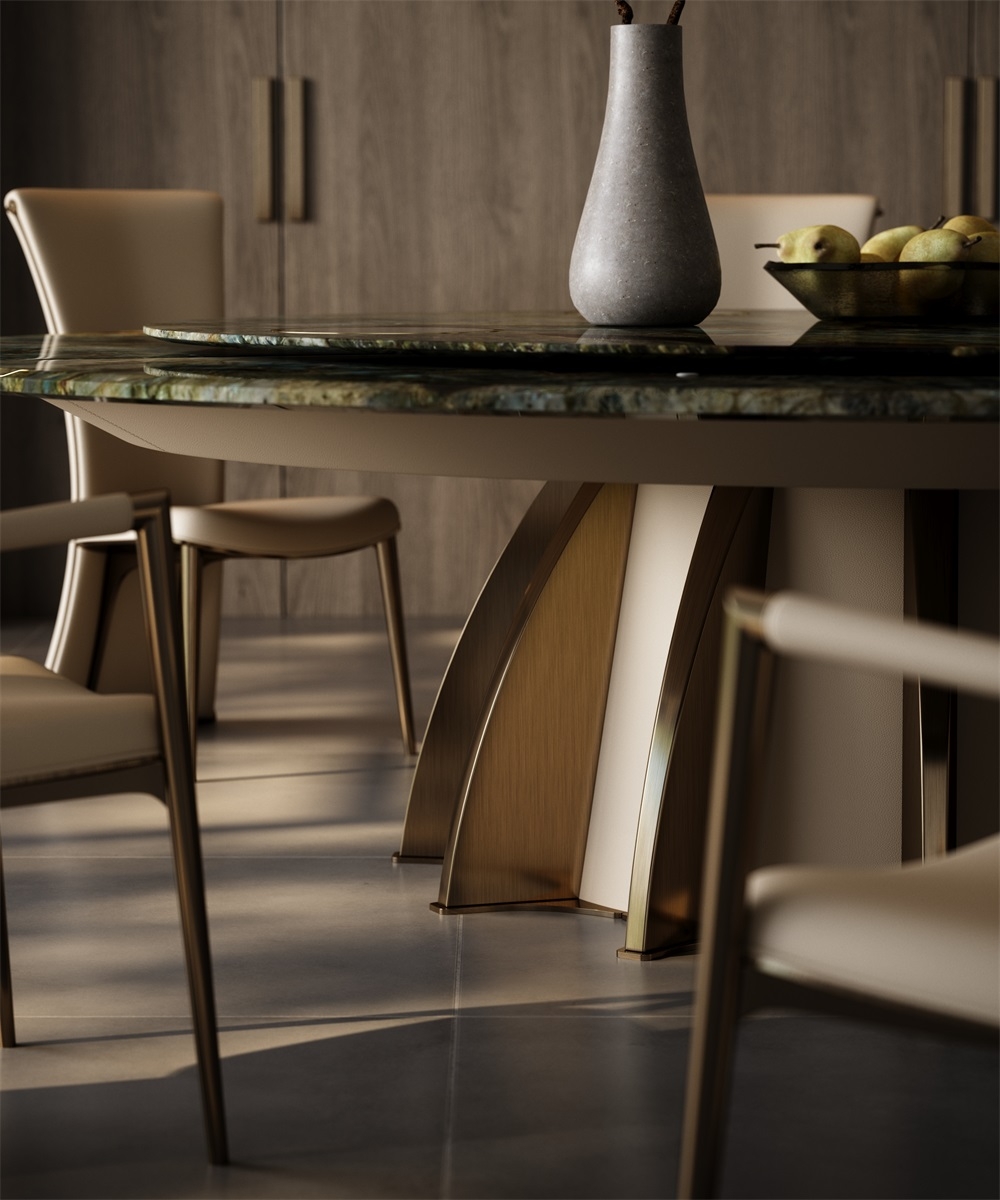 In a space that focuses on the social art atmosphere of home and practical dining needs, this dining table combines marble and metal materials with a petal-shaped metal base design, becoming the "social core" of the restaurant and living room, turning every meal and gathering into a pleasant experience blended with quality life.