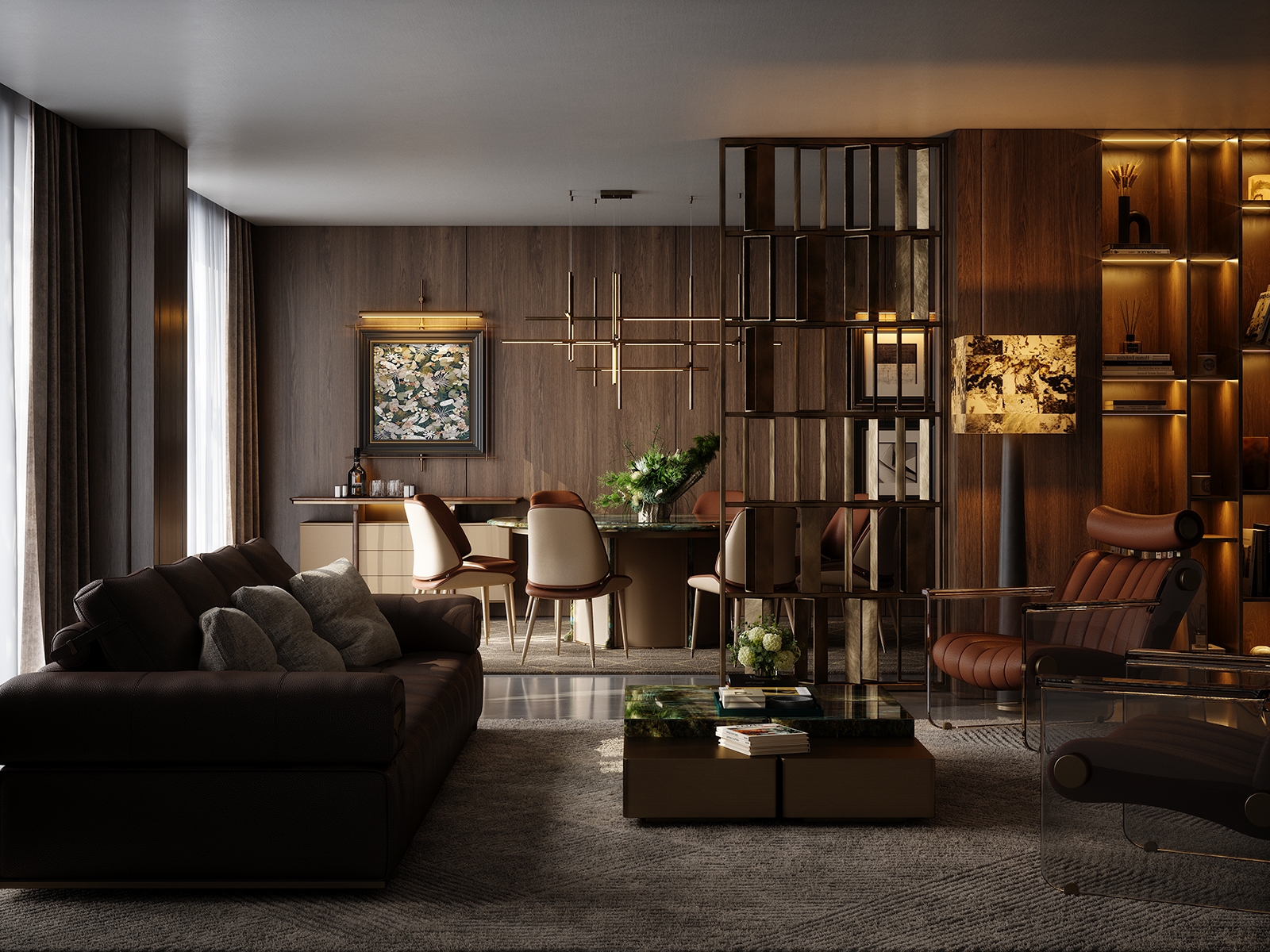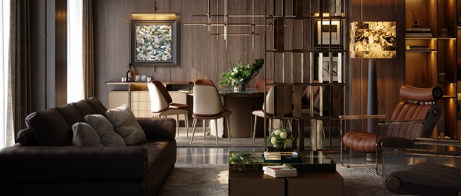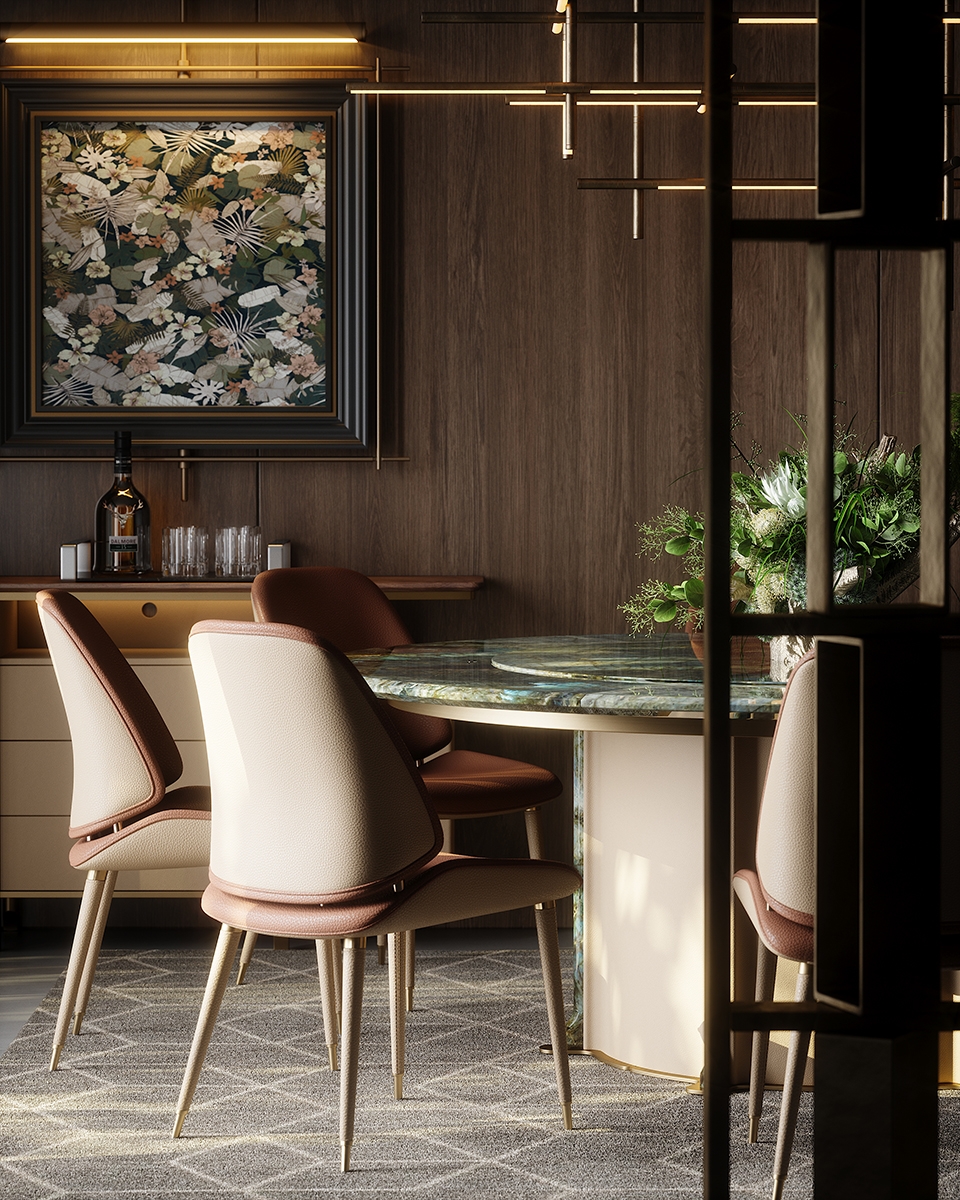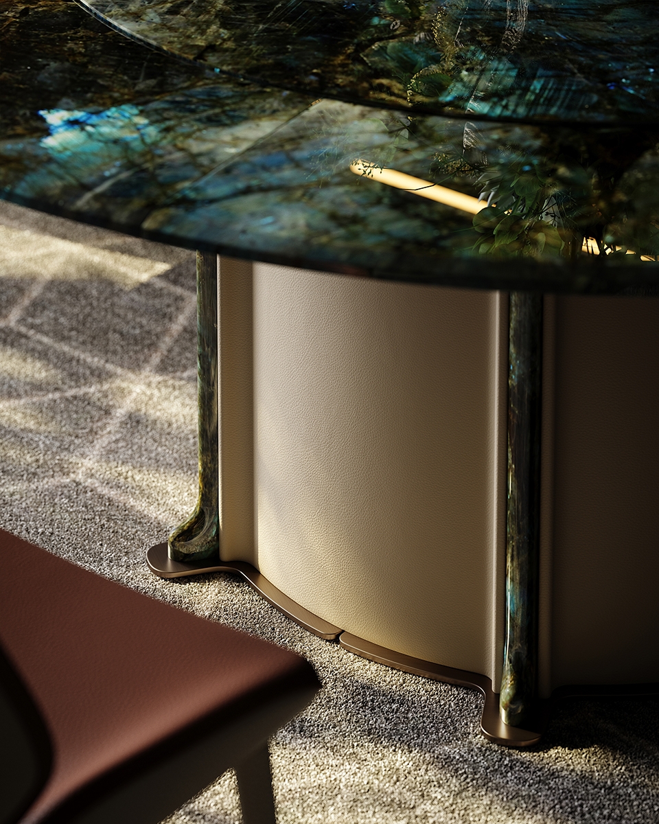 The countertop is made of natural marble with a unique texture like an art painting. It has been finely polished and anti-seepage treated to be wear-resistant, stain-resistant and full of artistic tension. The leather-wrapped cylindrical base presents a soft luster, and the metal frame outlines neat lines. The combination of the three weaves an artistic texture base for the space, injecting an elegant atmosphere into the social area.