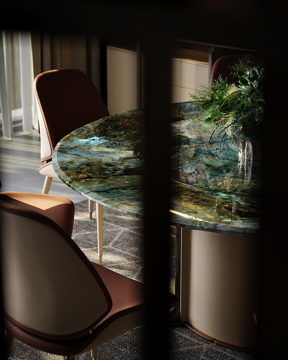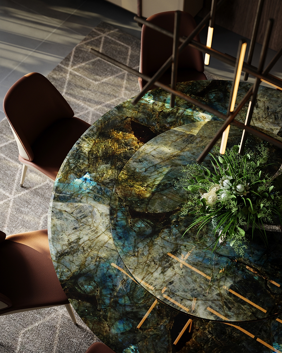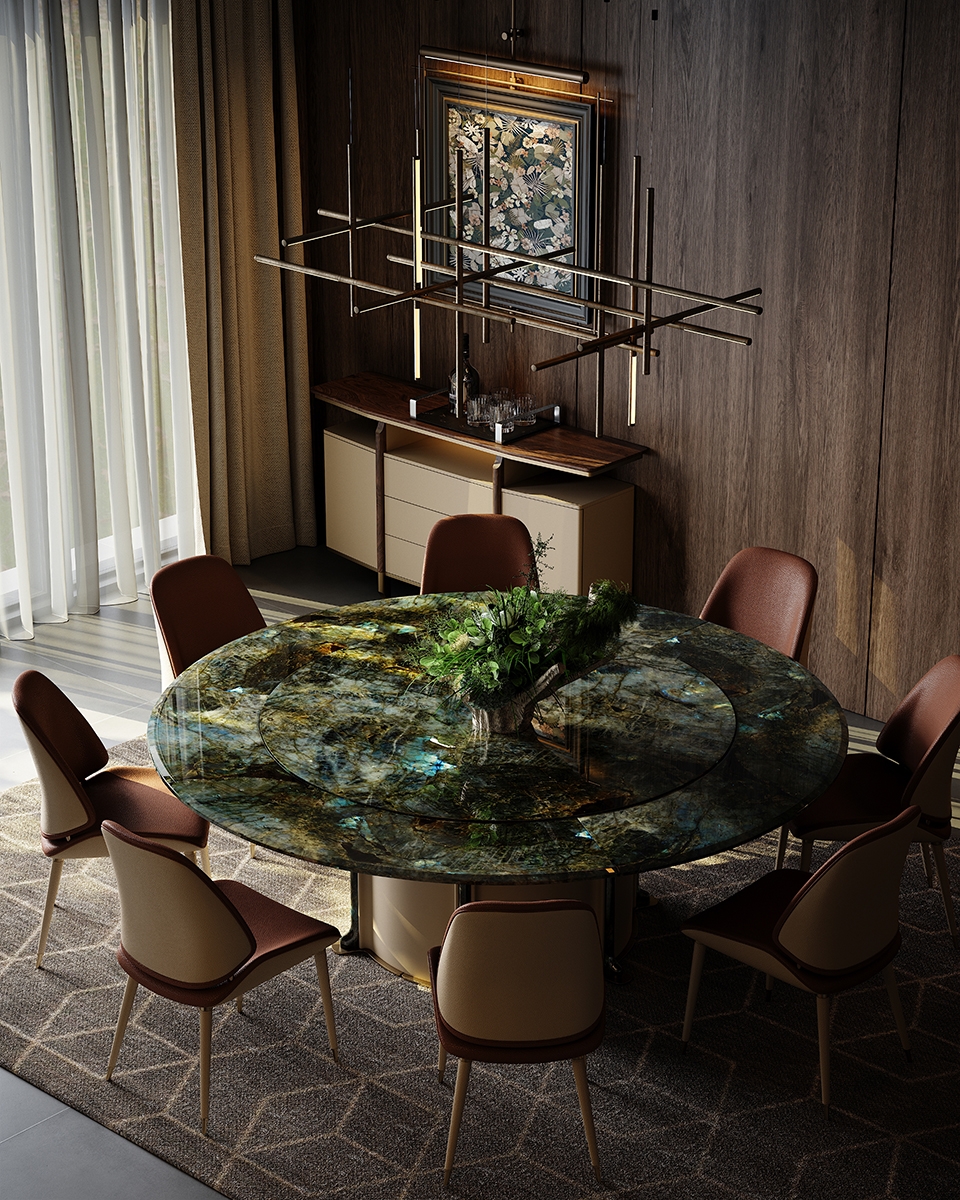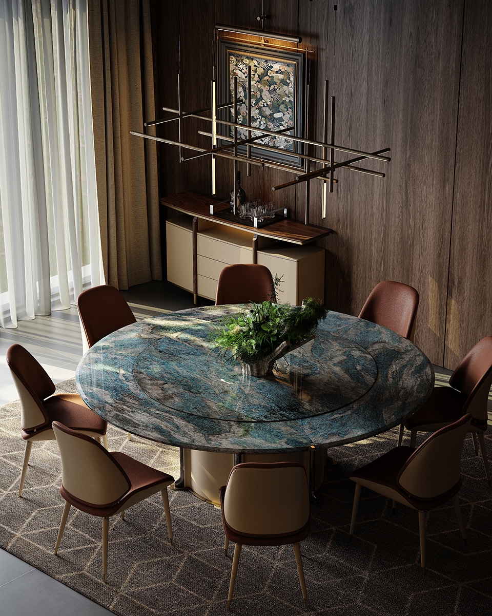 The orderly arranged luxurious stone columns echo the built-in turntable on the table.