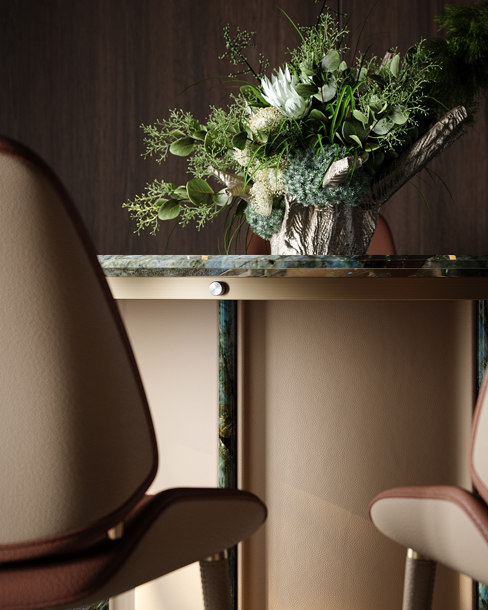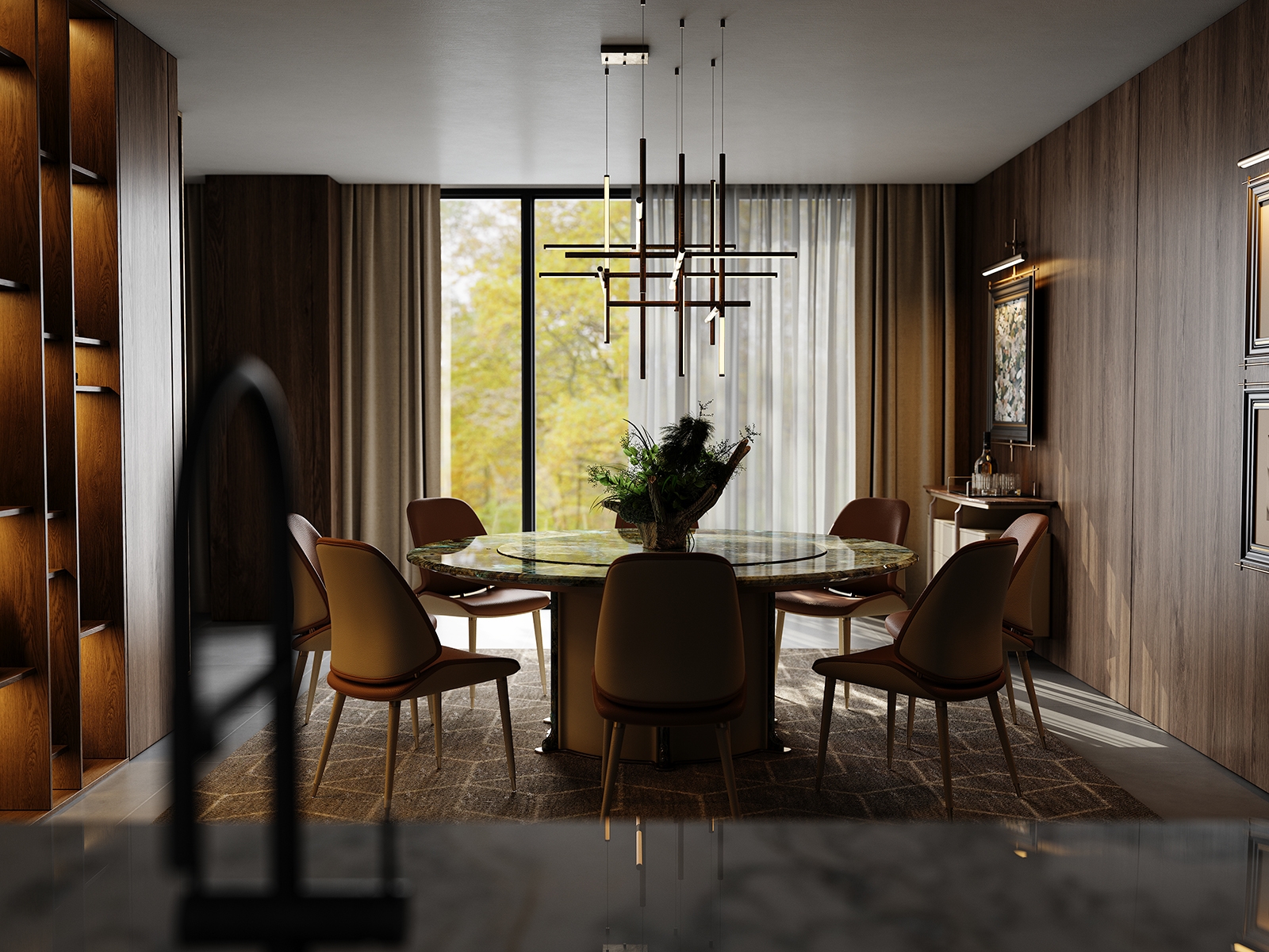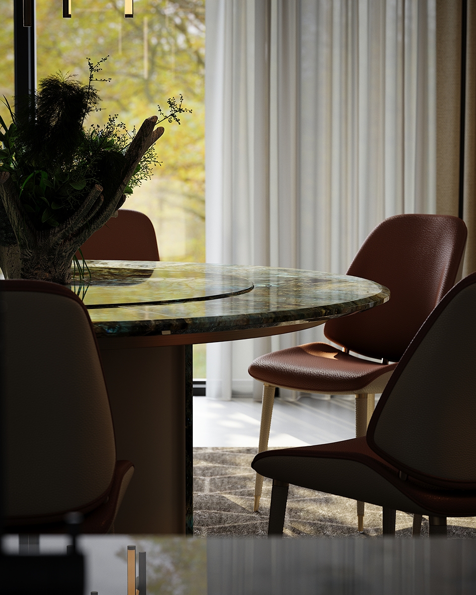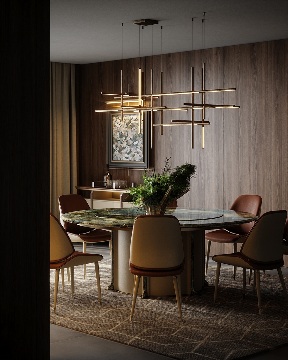 The orderly arranged luxurious stone columns echo the built-in turntable on the table.