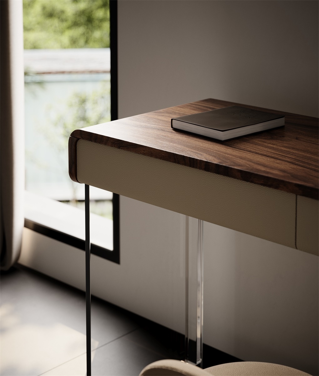 The countertop is made of natural solid wood, and its warm texture conveys natural warmth; the leather cabinet has a soft touch, and the acrylic bracket outlines light lines. The combination of the three weaves a luxurious and elegant texture base for the space, injecting an elegant atmosphere into the beauty area.