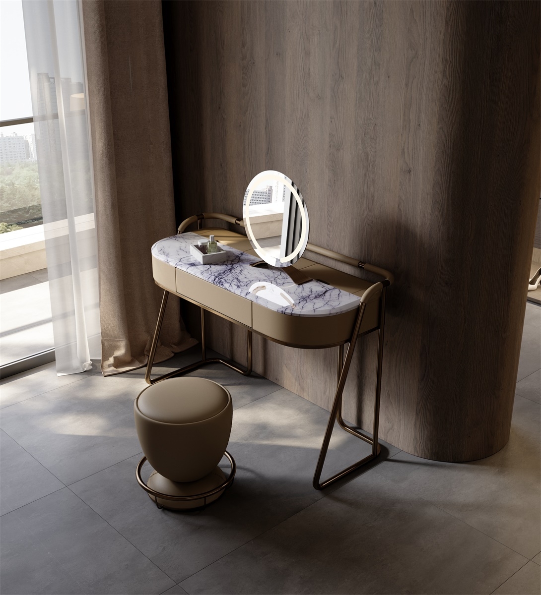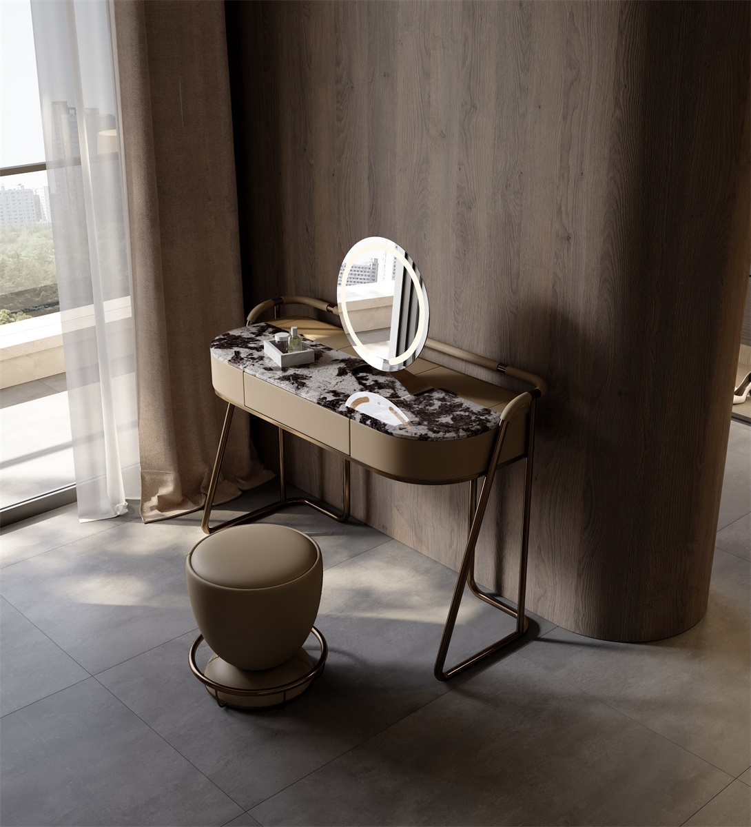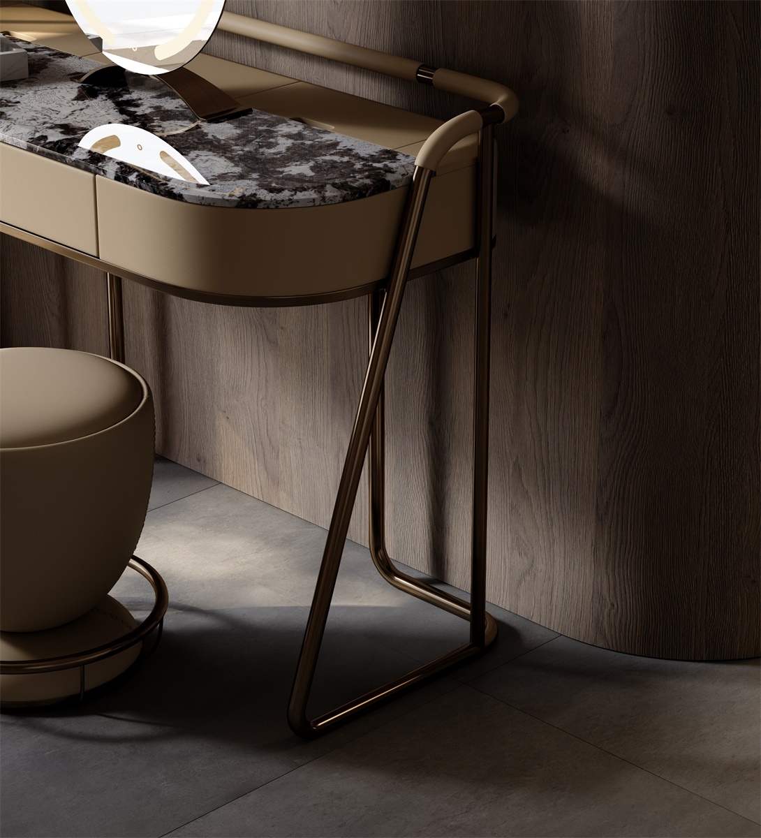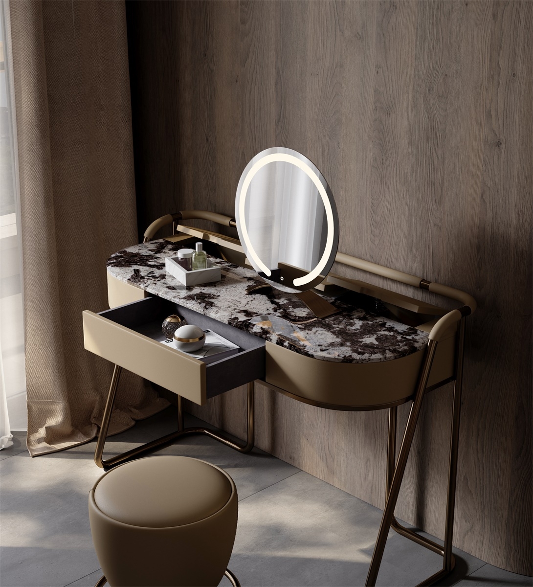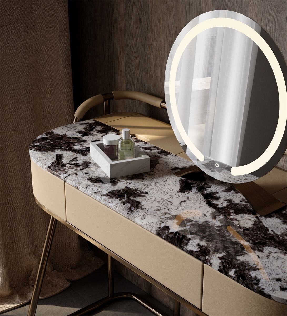 The leather stitching is CNC sewing + manual trimming, with a precise needle distance of 0.2mm to fit the texture; the joints between the metal bracket and various materials are laser-welded + manually polished, smooth and burr-free; the annular mirror is matched with the table top, and is manually adjusted to adapt the angle and brightness to the beauty scene, integrating "exquisite detailism" into every makeup structure.